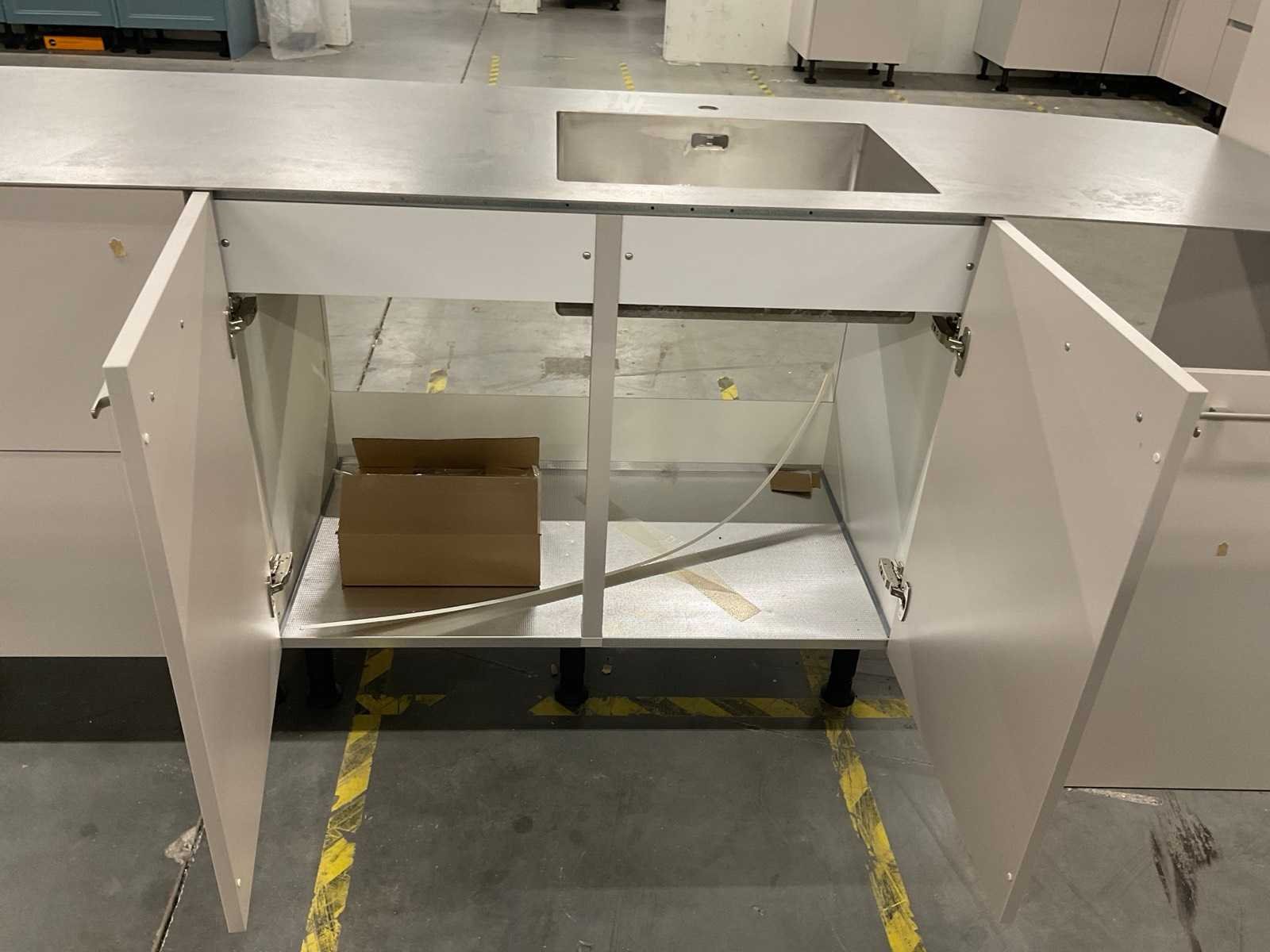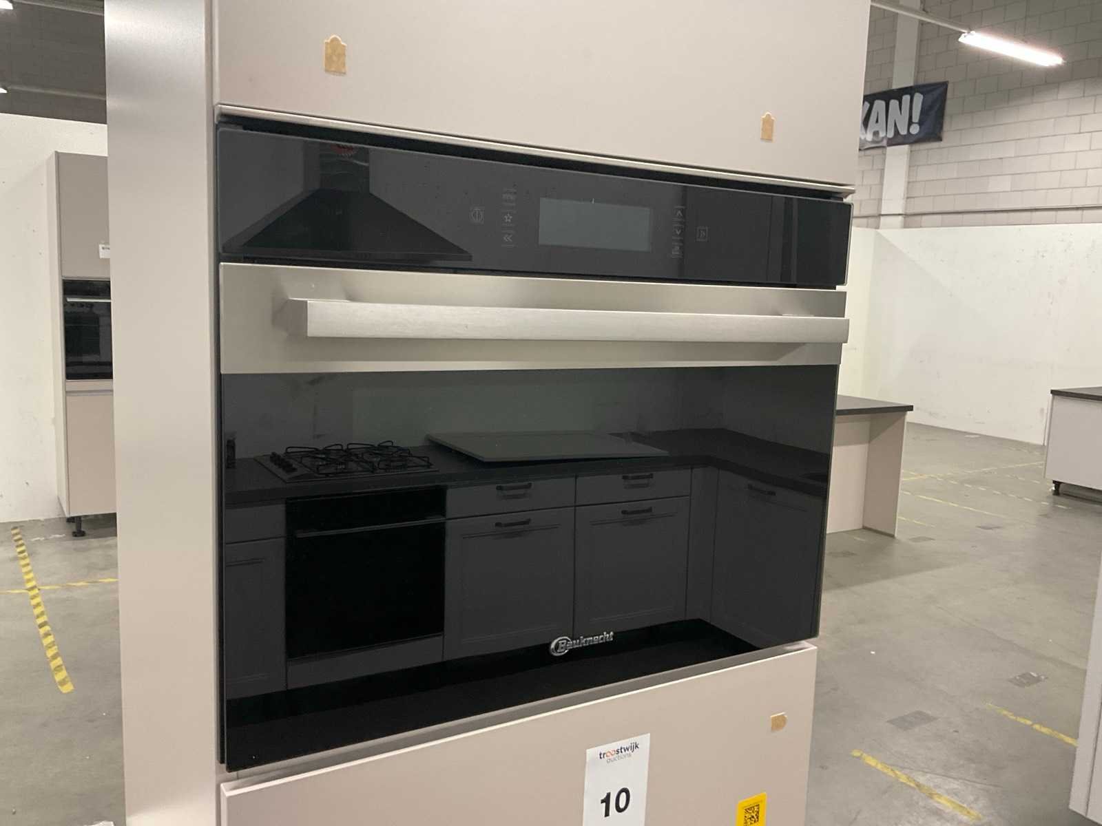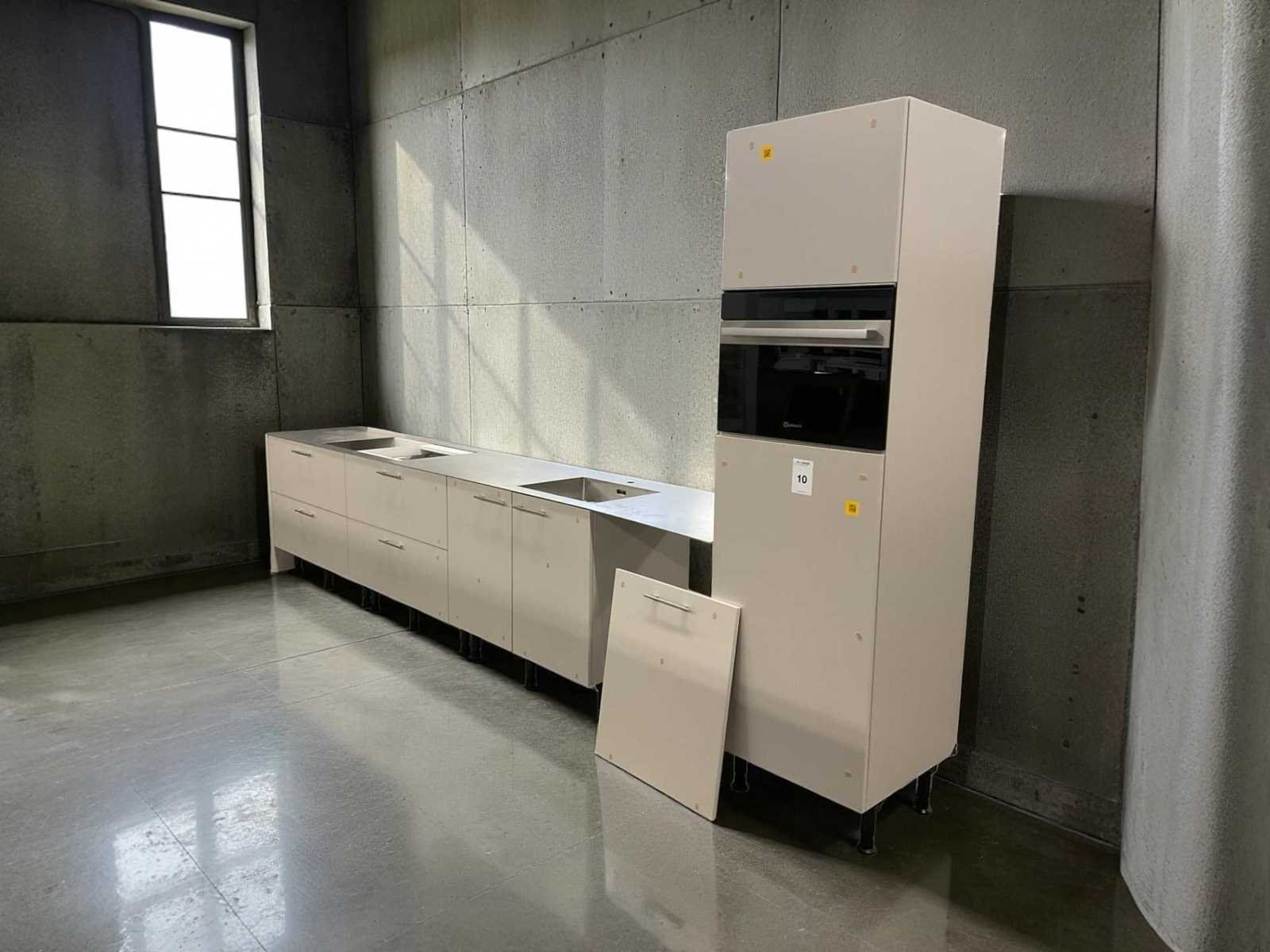 Indeling: 1 onderkast; 2 ladenkasten; 1 hoge kast; deurfront voor vaatwasser; Apparatuur: Bauknecht inbouw-stoomoven; type ECSK9 9845 PT; gebruikt als demo-oven; reeds gedemonteerd en ingepakt op pallets; werkbladen, plinten en hoge kasten niet ingepakt Lengte: 423cm Hoogte: 223cm Kraan: geen Werkblad hoogte: 92cm Aanrechtblad: RVS geborsteld kookplaat uitsparing 88x49 cm Hoofdkleur: zijdegrijs