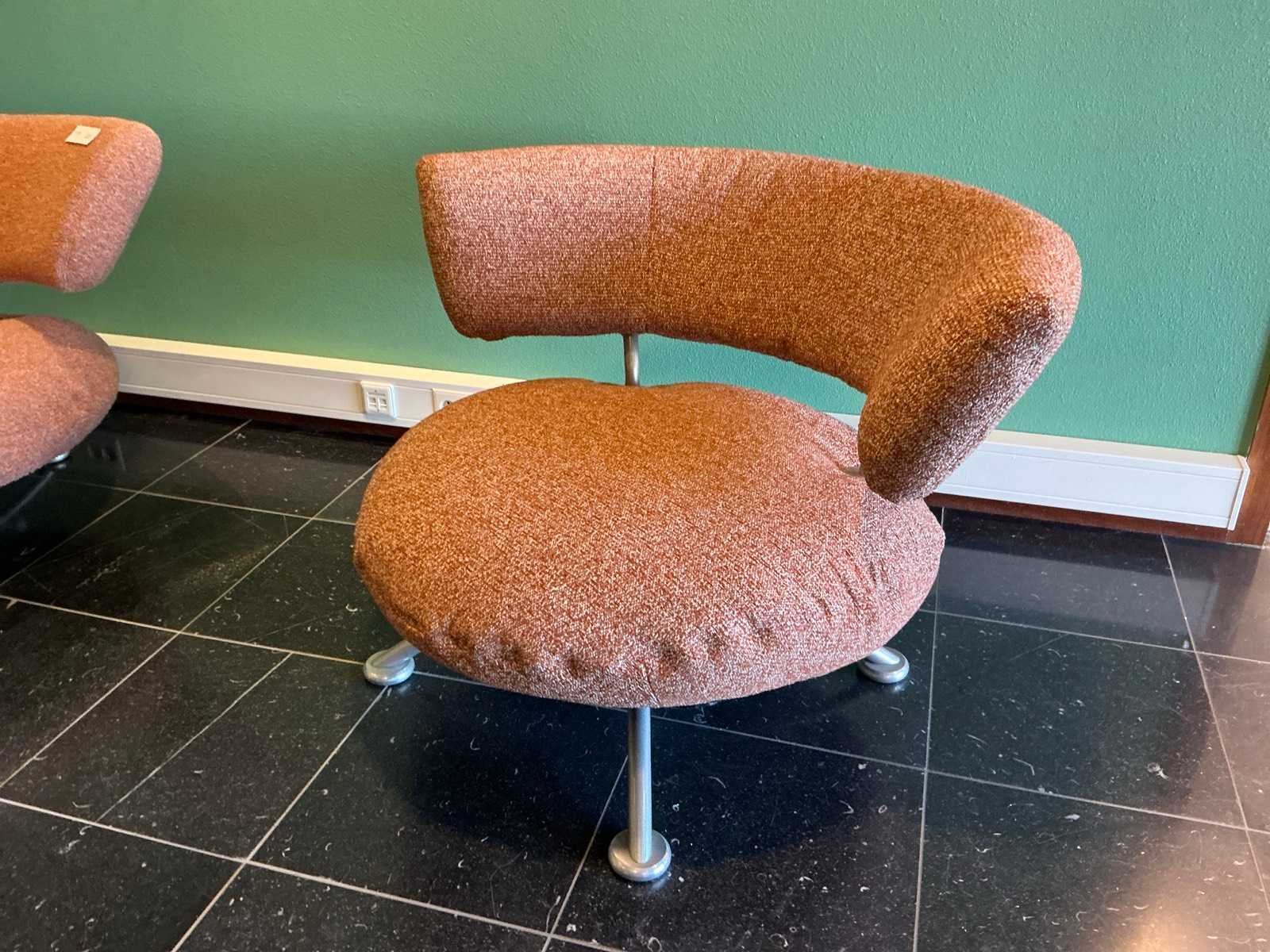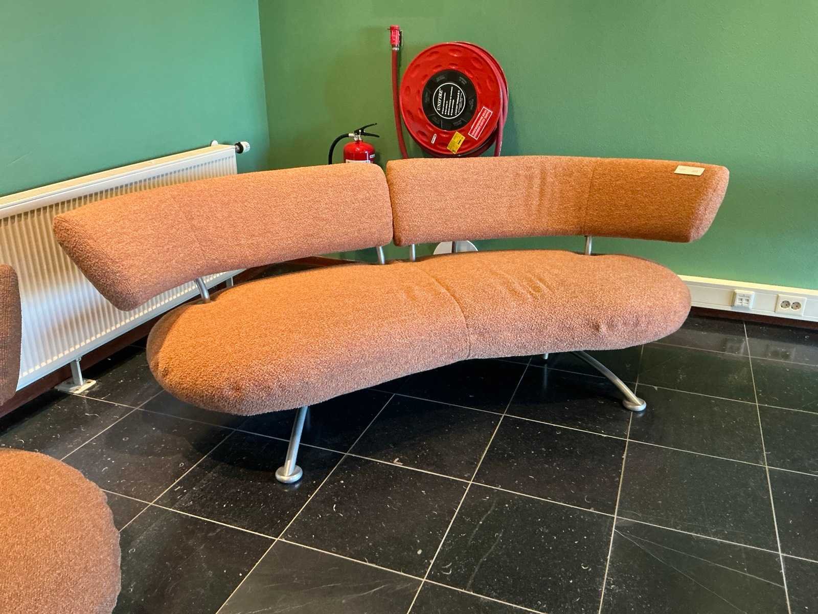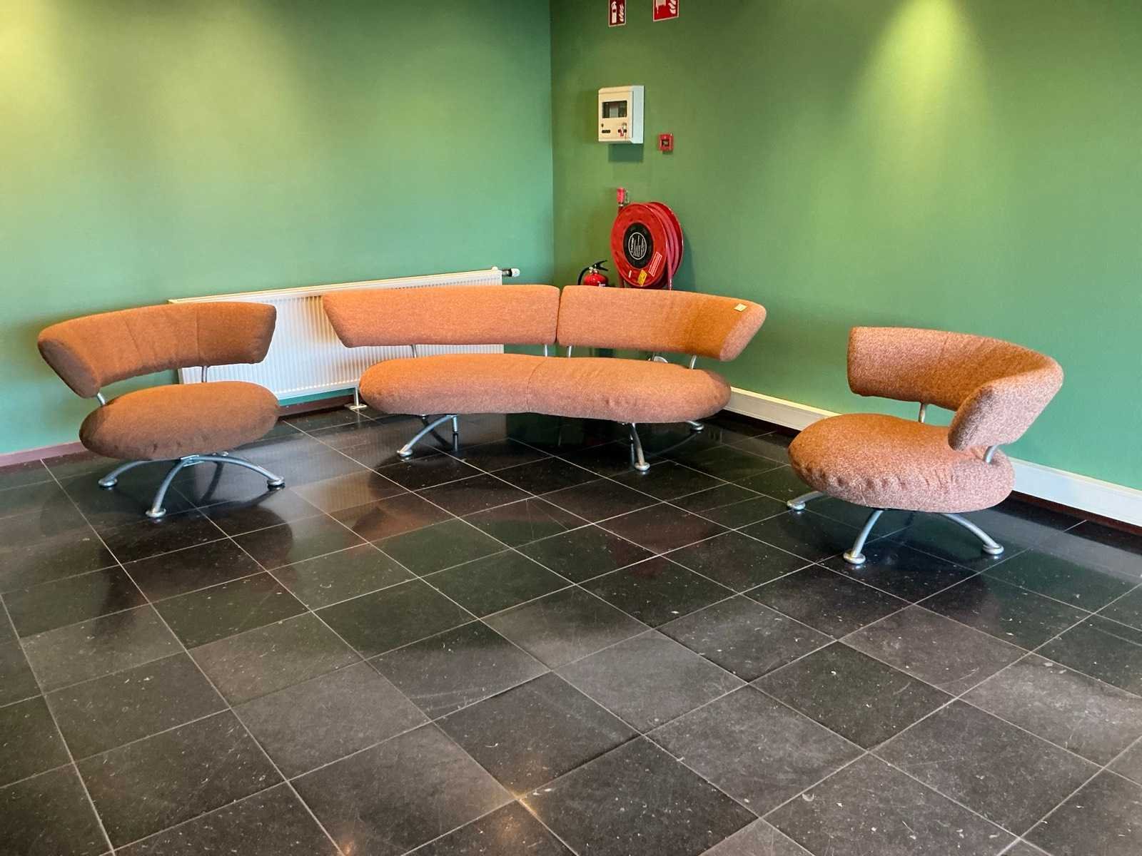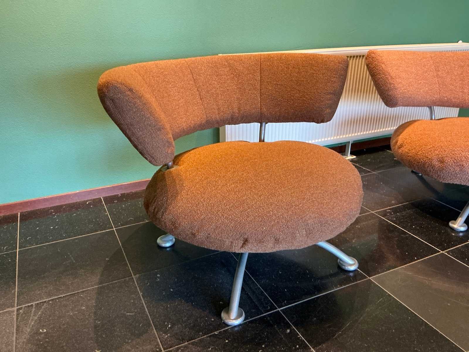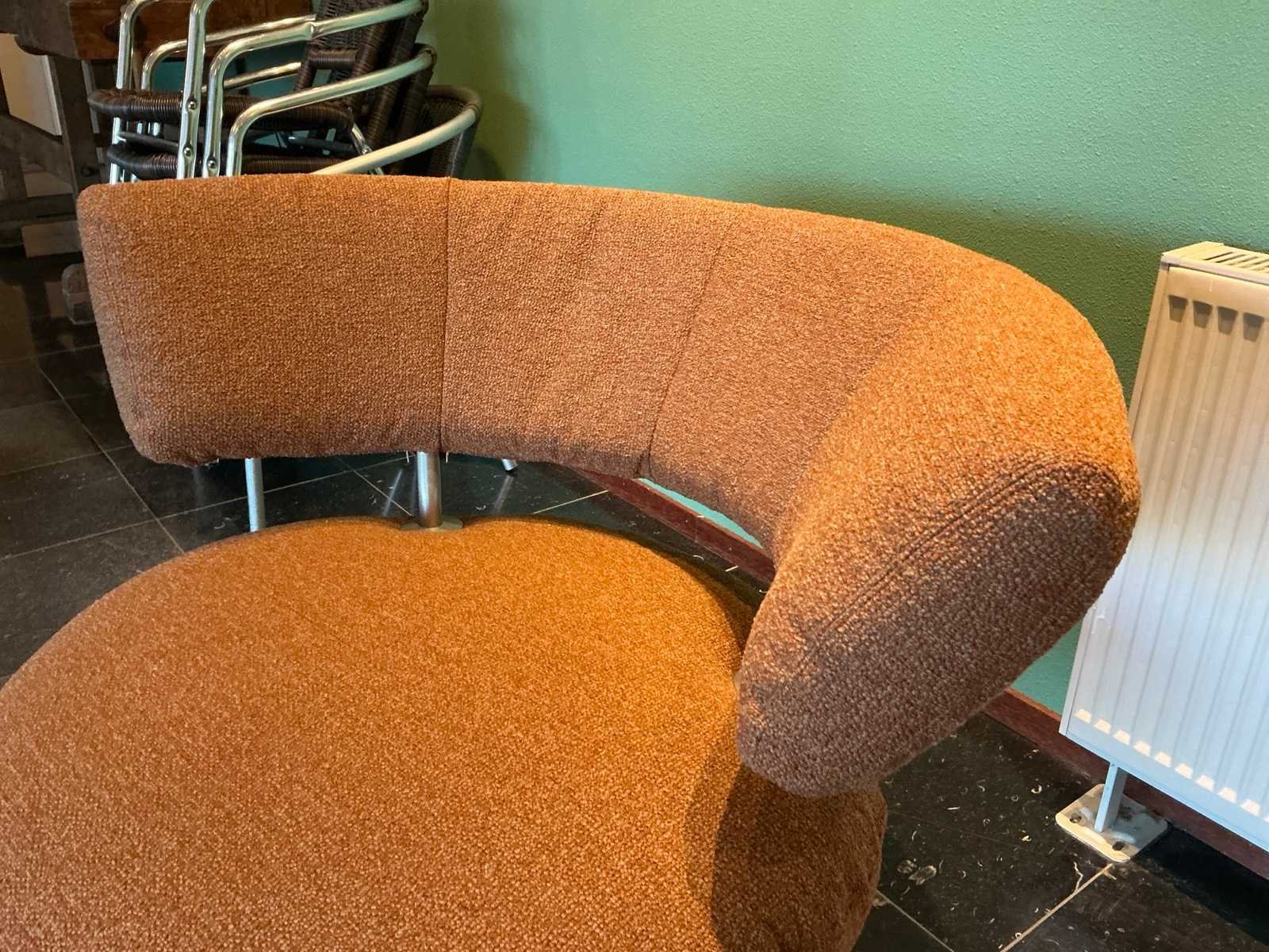 Afmeting bank 230x85x71cm, fauteuil 108x80x77cm. Set bestaat uit 1 bank en 2 fauteuils, de fauteuils hebben een draaiende zitting Kleur: Oranje/bruin Materiaal: Stoffen bekleding op metalen poot