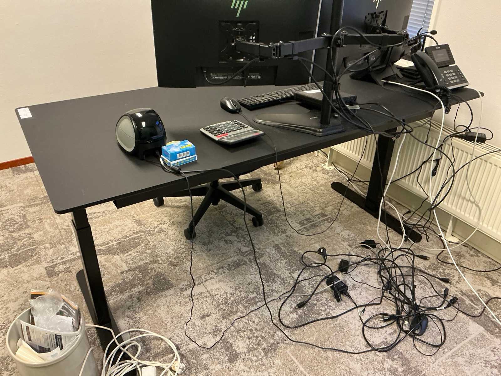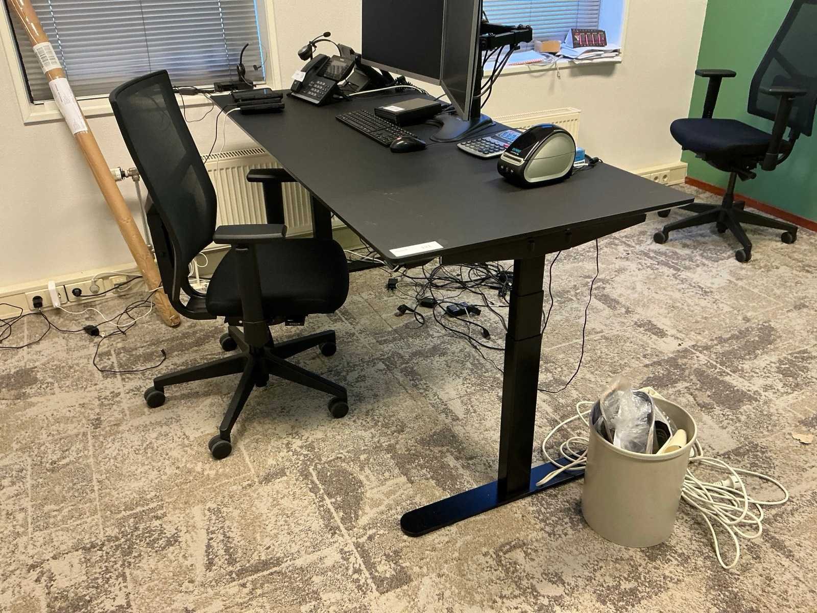 Inclusief 2x Bureaustoel en 1x kapstok Merk: Linak Type: DF2 Elektrisch verstelbaar: true Kleur: Zwart mat Lengte: 180cm Breedte: 80cm Materiaal: Hout/metaal