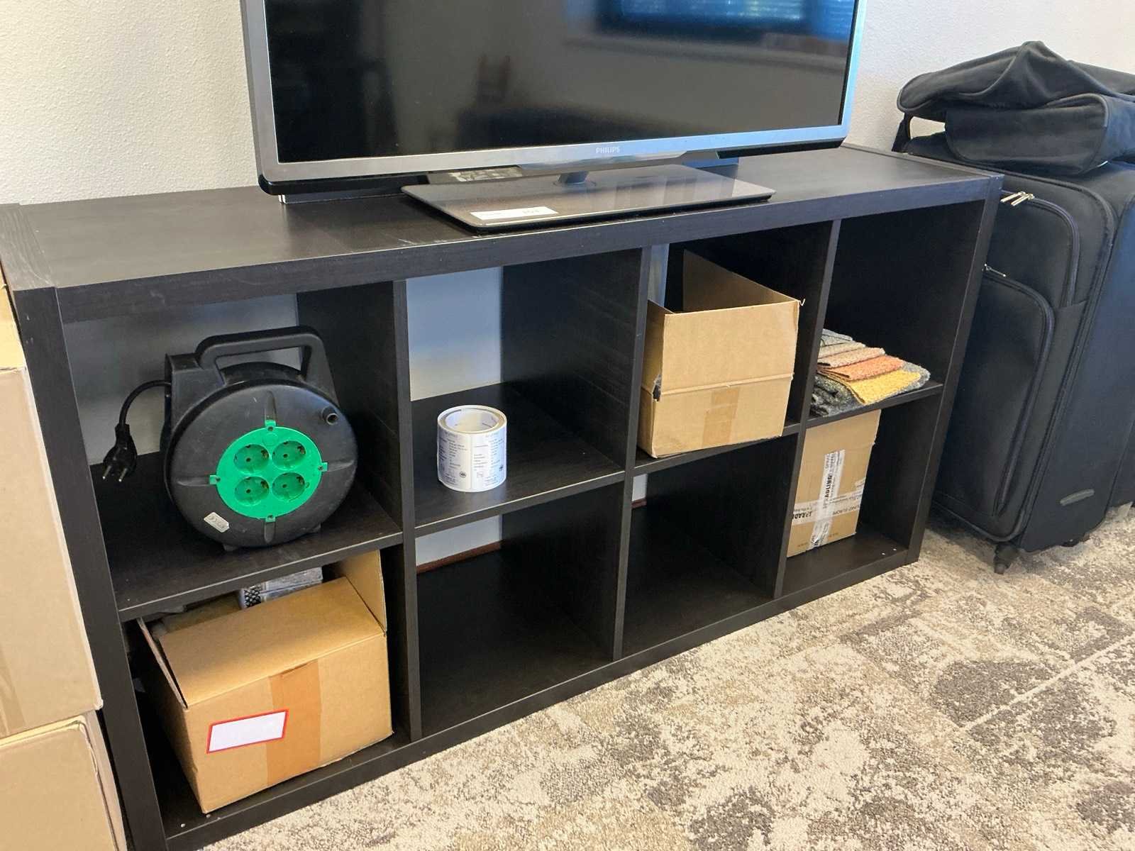Bestaat uit 1x vakkenkast 147x38x76cm, 1x Philips televisie 40PFL5007H, 2 reiskoffers, diverse zaken in kast.