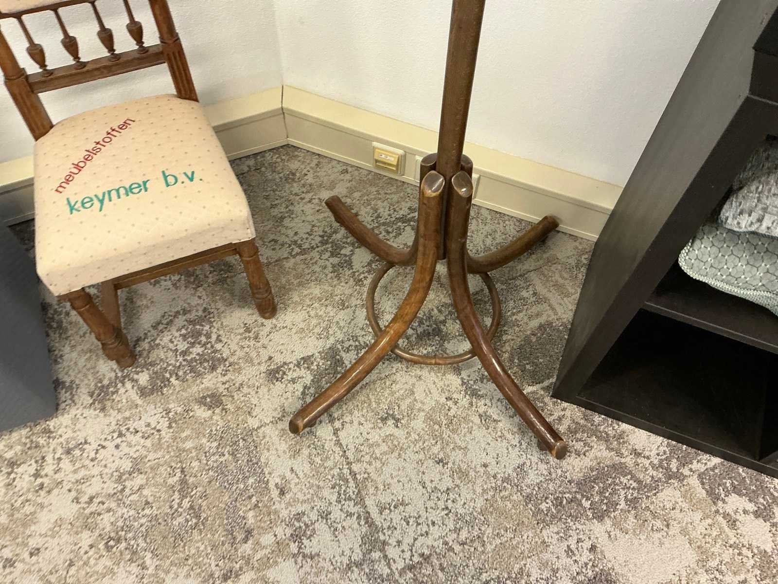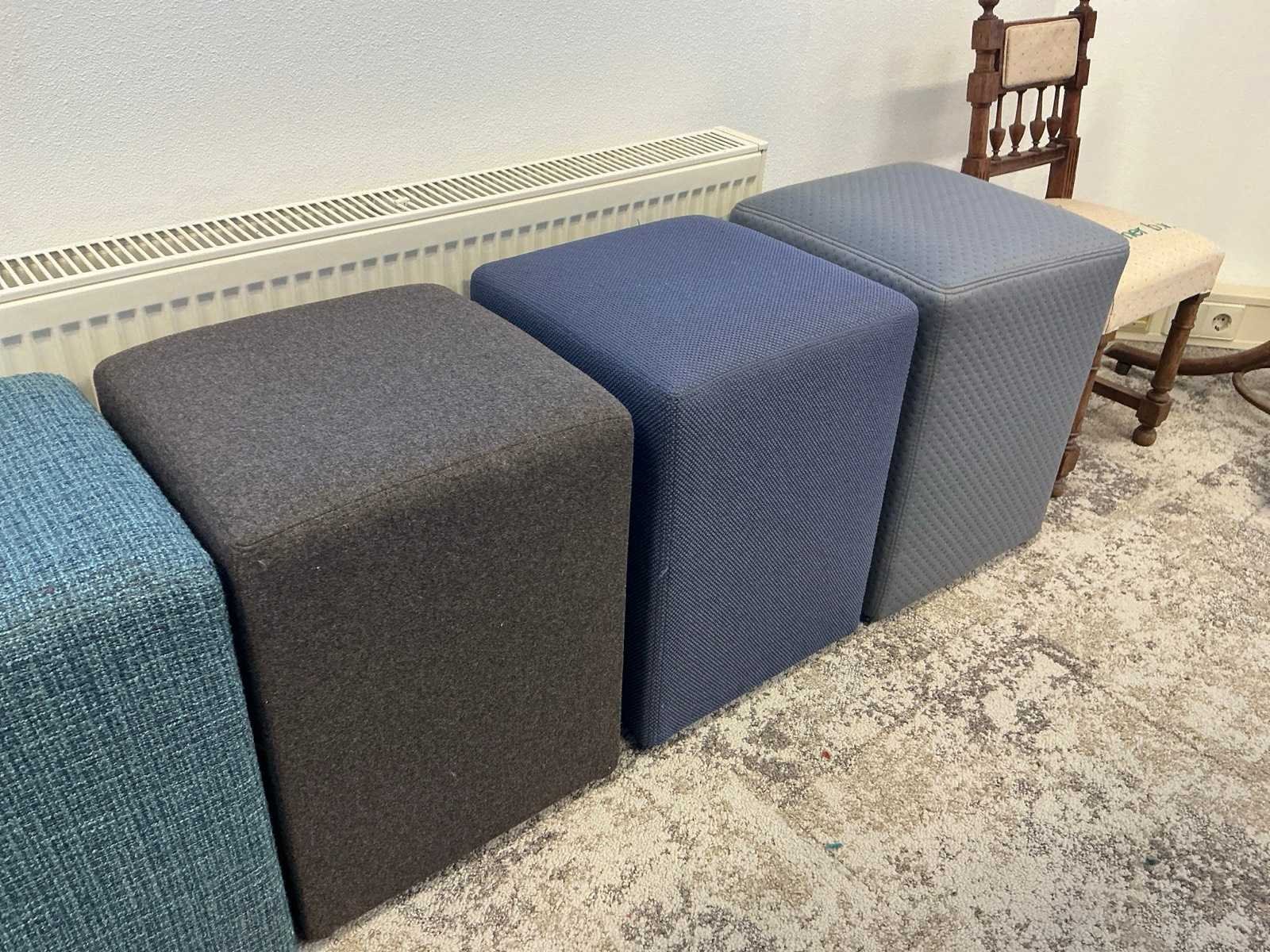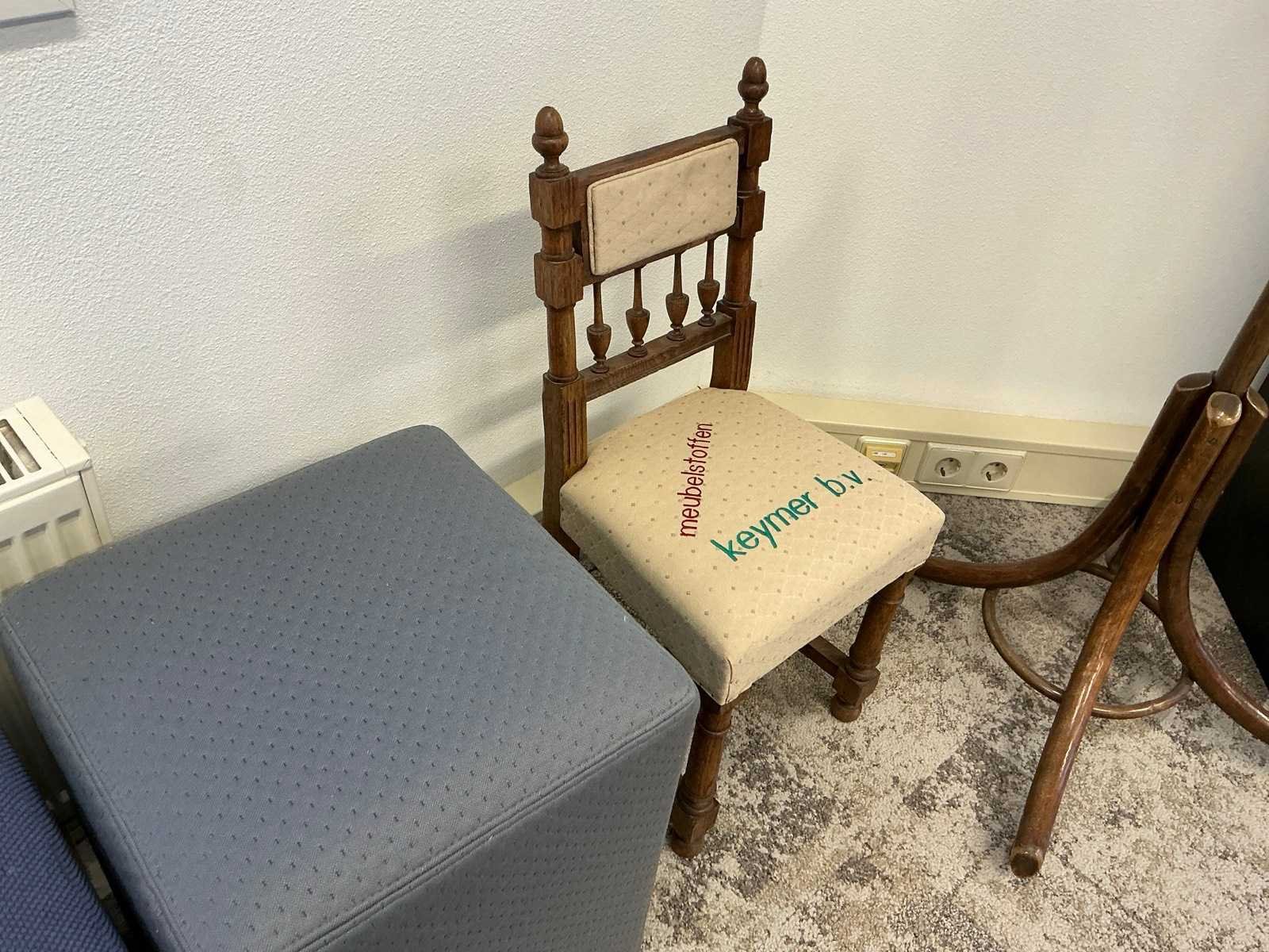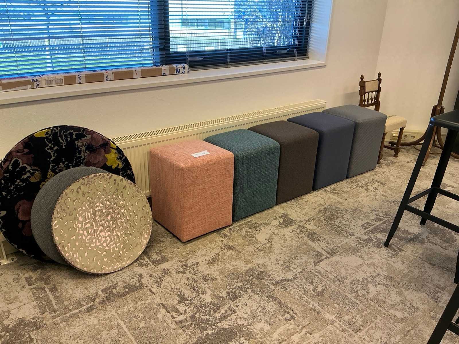 Kavel bestaat uit 5x Hockers 37x39x48cm, 3 ronde wandborden, 1x kinderstoel met reclame, 1x kapstok.
