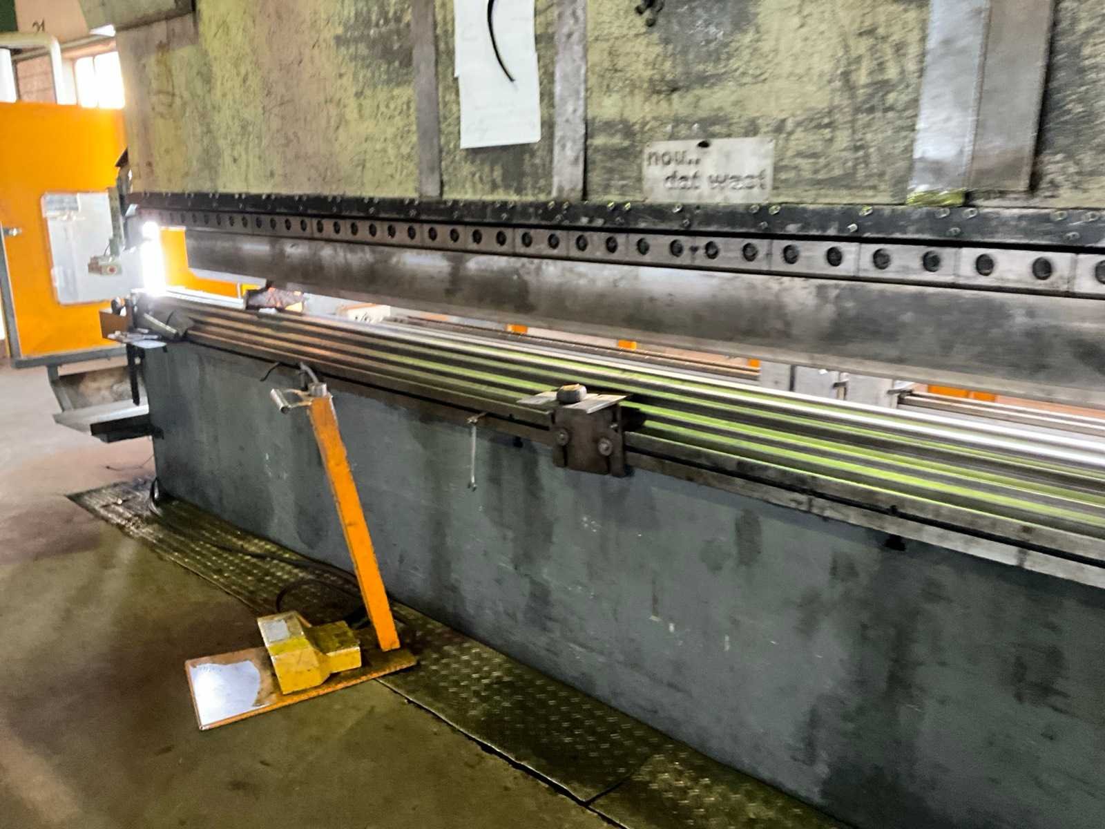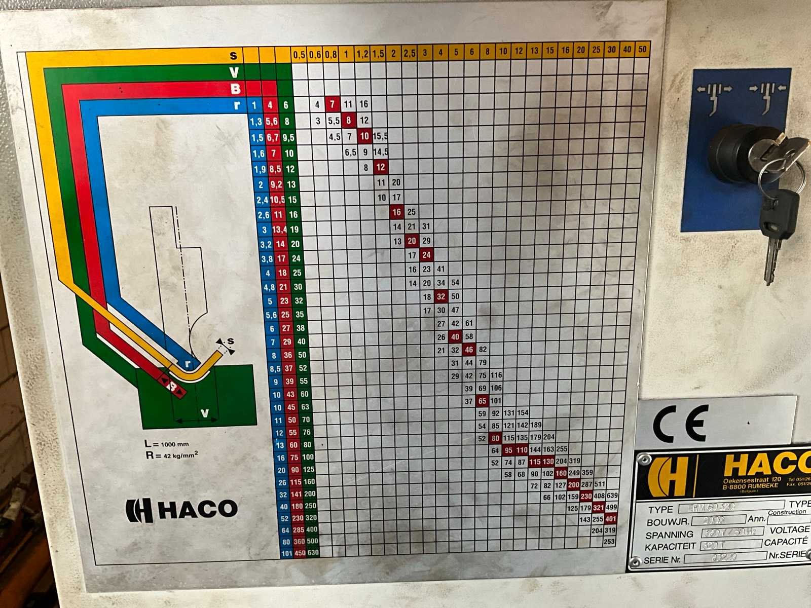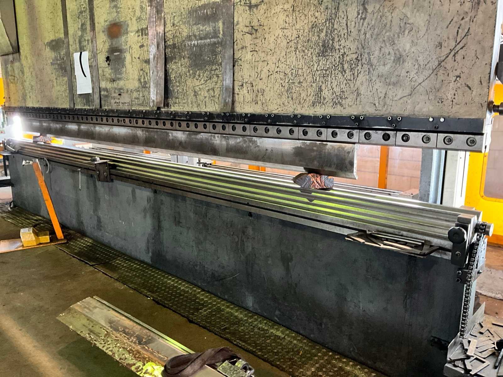 Werkbreedte tussen de kolommen 5000 mm, uitlading bij kolommen 525 mm, voorzien van cnc besturing, zet- / kantgereedschappen, automatische achteraanslag, achteraanslag vingers, Merk: Haco Type: ERM 60-320 Bouwjaar: 2009 Serienummer: 83229 Capaciteit.: 320t Werklengte: 6000mm Voetbediening: true Achteraanslag bereik: 1000mm CNC-besturing, merk, type: BC69 Graphics Aansluiting: 400V Afmeting l: 2400mm Afmeting b: 7200mm Afmeting h: 3600mm