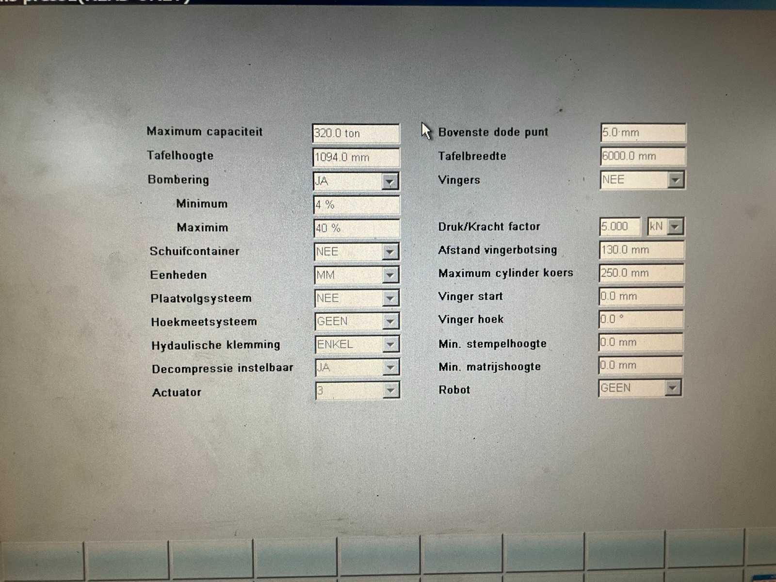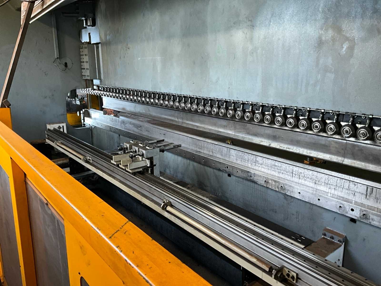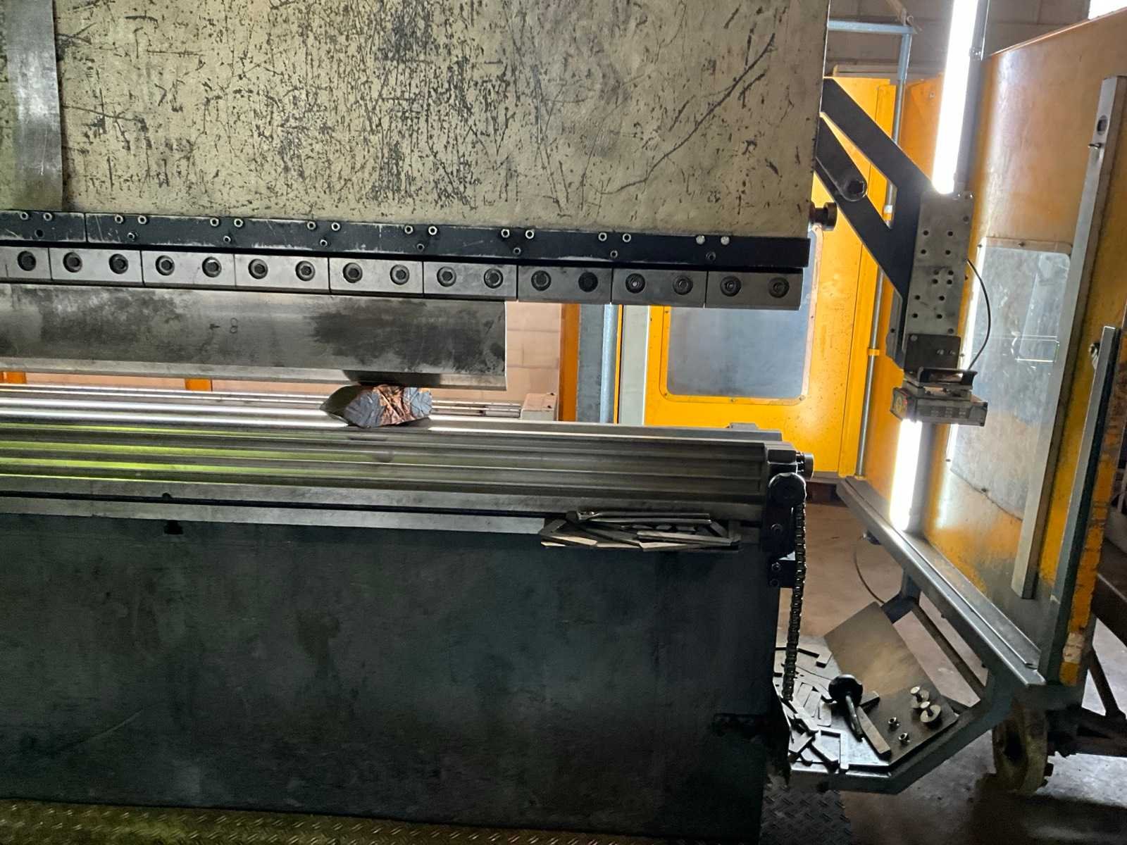 Werkbreedte tussen de kolommen 5000 mm, uitlading bij kolommen 525 mm, voorzien van cnc besturing, zet- / kantgereedschappen, automatische achteraanslag, achteraanslag vingers, Merk: Haco Type: ERM 60-320 Bouwjaar: 2009 Serienummer: 83229 Capaciteit.: 320t Werklengte: 6000mm Voetbediening: true Achteraanslag bereik: 1000mm CNC-besturing, merk, type: BC69 Graphics Aansluiting: 400V Afmeting l: 2400mm Afmeting b: 7200mm Afmeting h: 3600mm