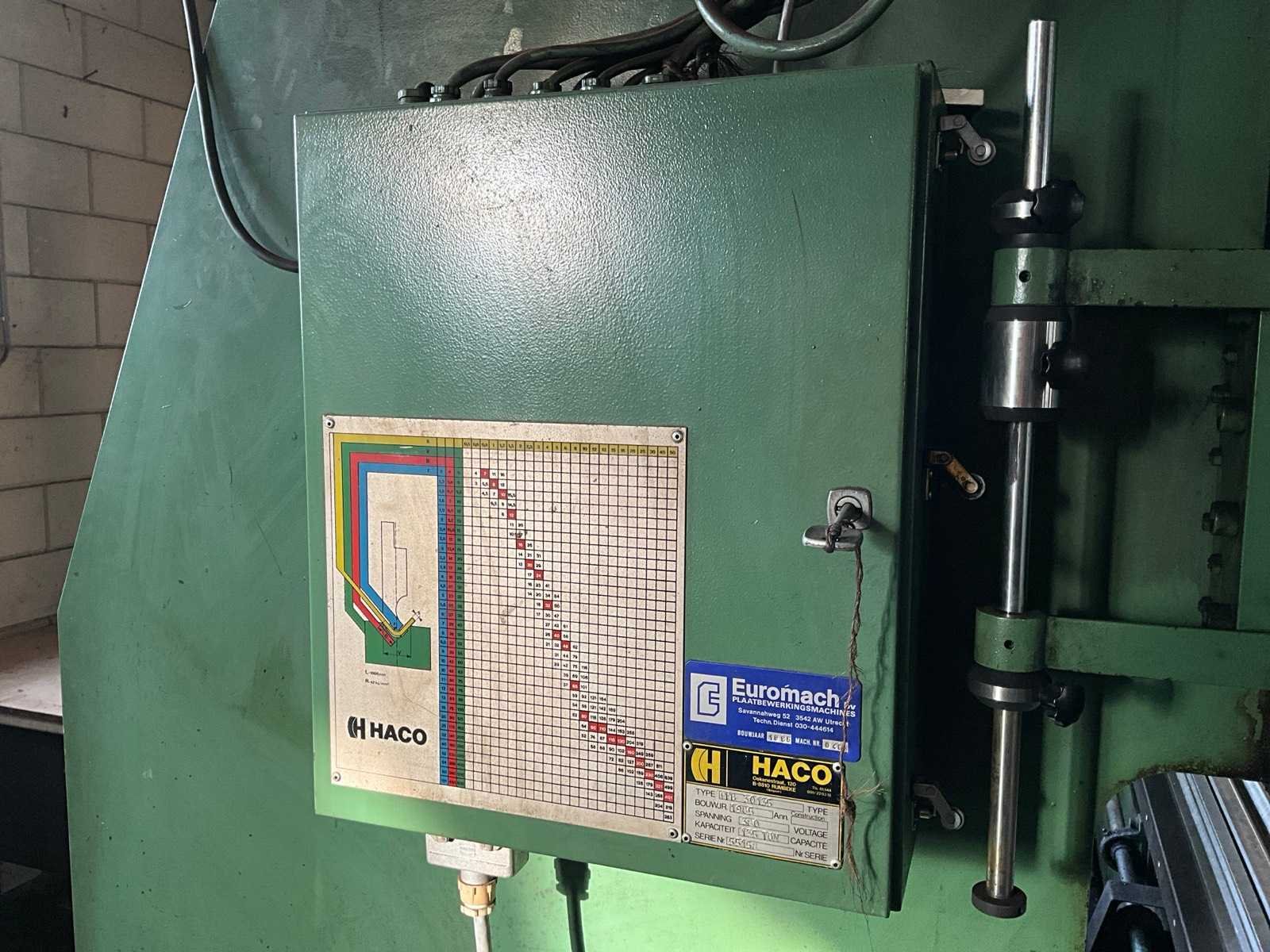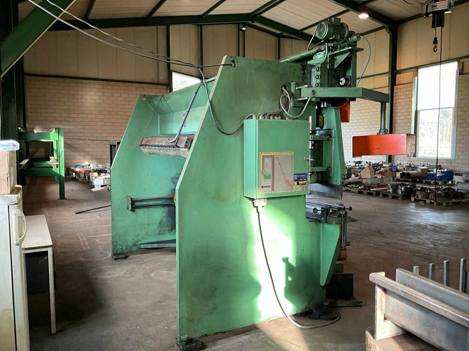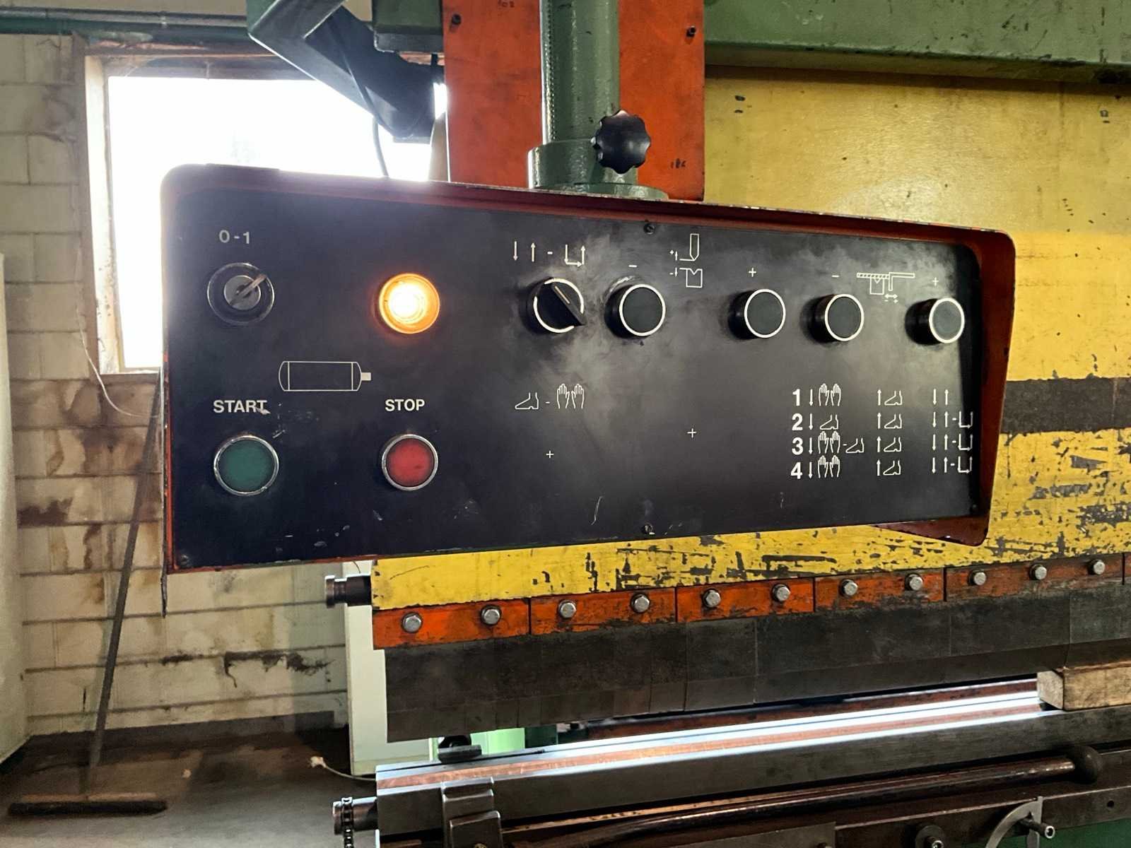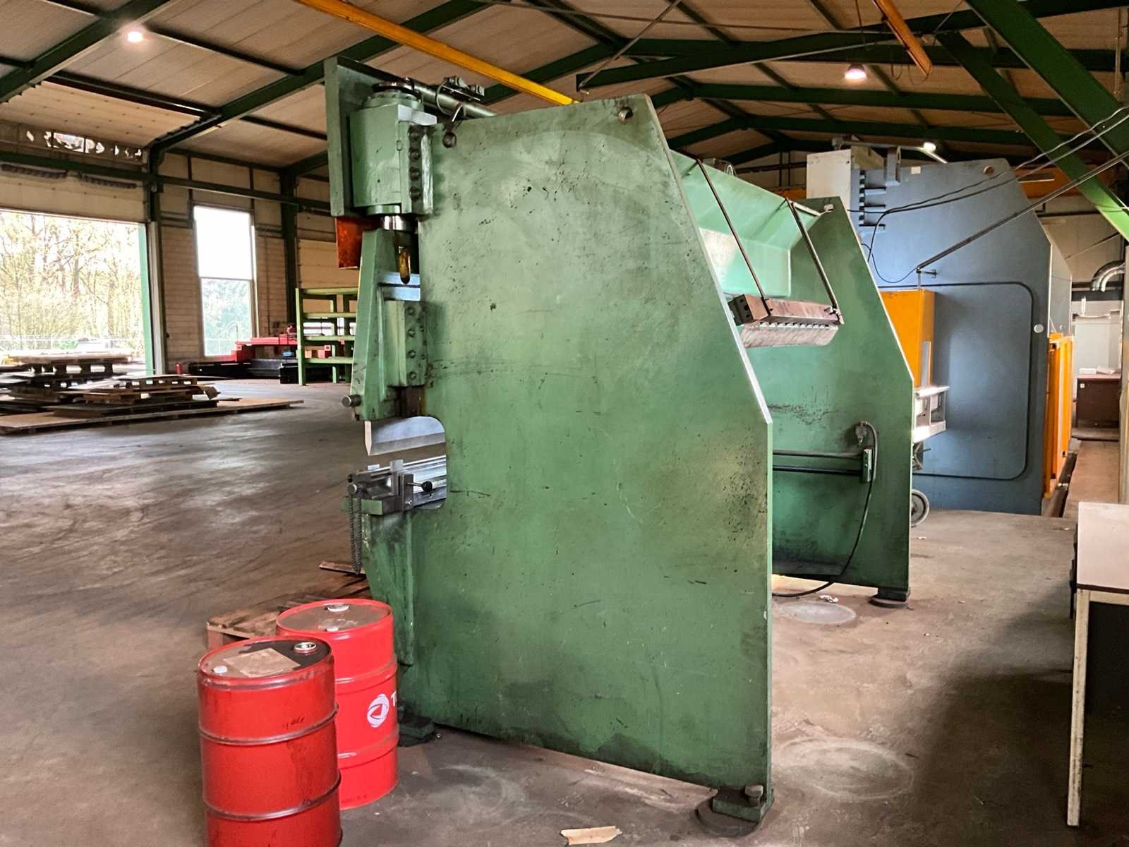 Afstand tussen de kolommen 2570 mm, uitlading bij kolommen 210 mm, voorzien van zet- / kantgereedschap, bedieningspaneel, Merk: Haco Type: PPB 30135 Bouwjaar: 1985 Serienummer: 55153 Capaciteit.: 135t Werklengte: 3000mm Voetbediening: true Achteraanslag bereik: 900mm Aansluiting: 400V Afmeting l: 1800mm Afmeting b: 3000mm Afmeting h: 2500mm