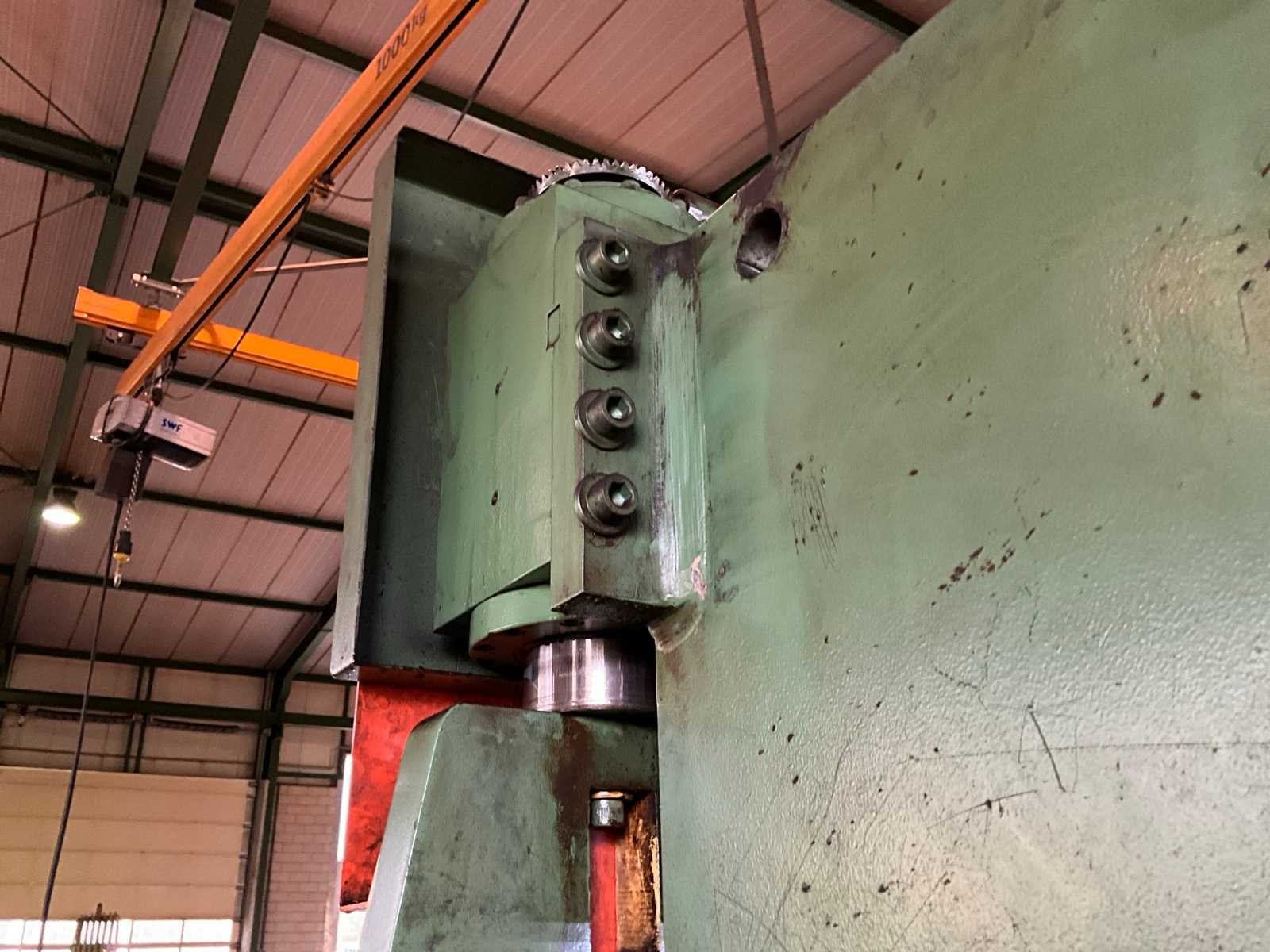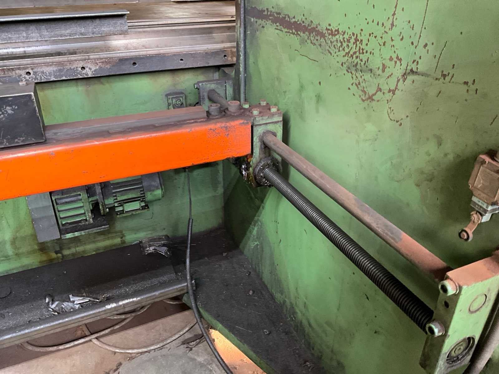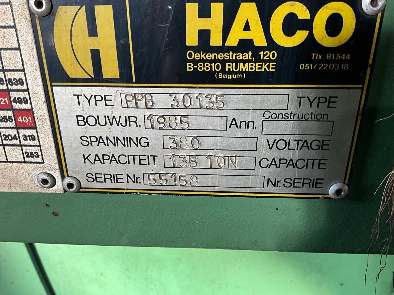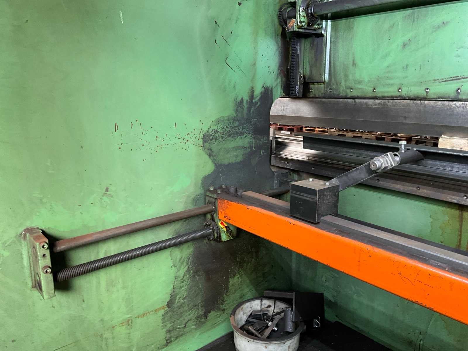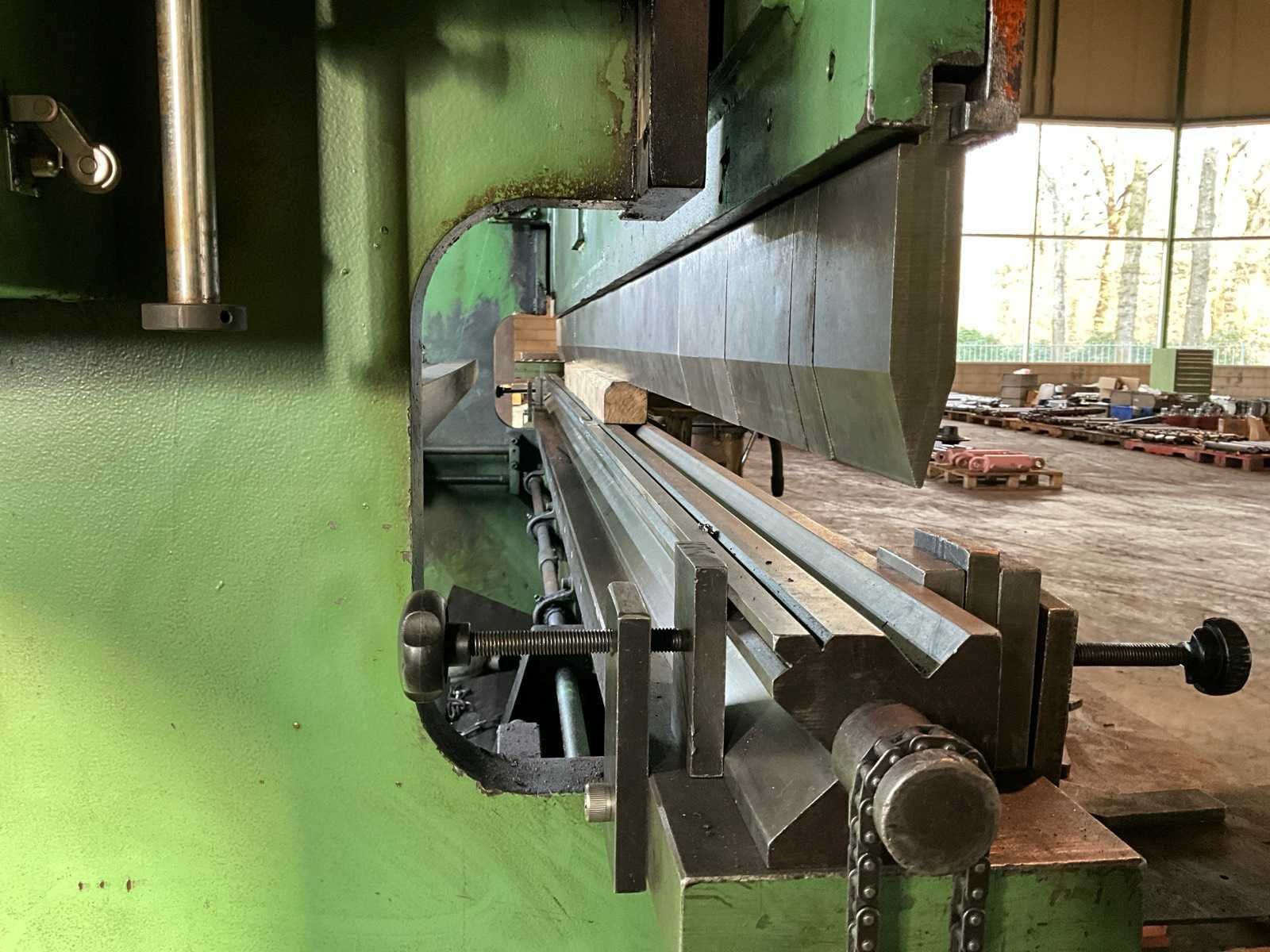 Afstand tussen de kolommen 2570 mm, uitlading bij kolommen 210 mm, voorzien van zet- / kantgereedschap, bedieningspaneel, Merk: Haco Type: PPB 30135 Bouwjaar: 1985 Serienummer: 55153 Capaciteit.: 135t Werklengte: 3000mm Voetbediening: true Achteraanslag bereik: 900mm Aansluiting: 400V Afmeting l: 1800mm Afmeting b: 3000mm Afmeting h: 2500mm