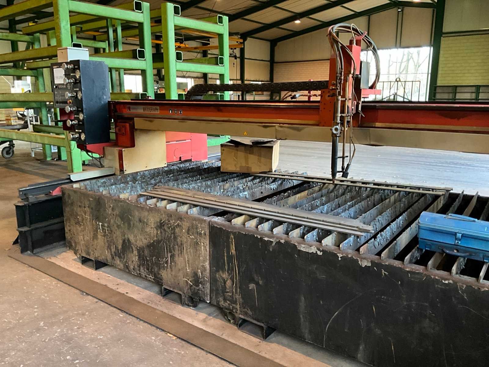 Voorzien van snijbrander reserve delen, 2x snijtafel (met reserve rongen), breedte tussen kolomen 3700 mm Merk: Kioke Type: MX-4000DD Spoorbreedte: 4050mm Aantal snijgereedschappen: 1 Tafel afmeting l: 1650mm Tafel afmeting b: 1750mm Digitale uitlezing: true Aansluiting: 400V Afmeting l: 4200mm Afmeting b: 4400mm Afmeting h: 1800mm
