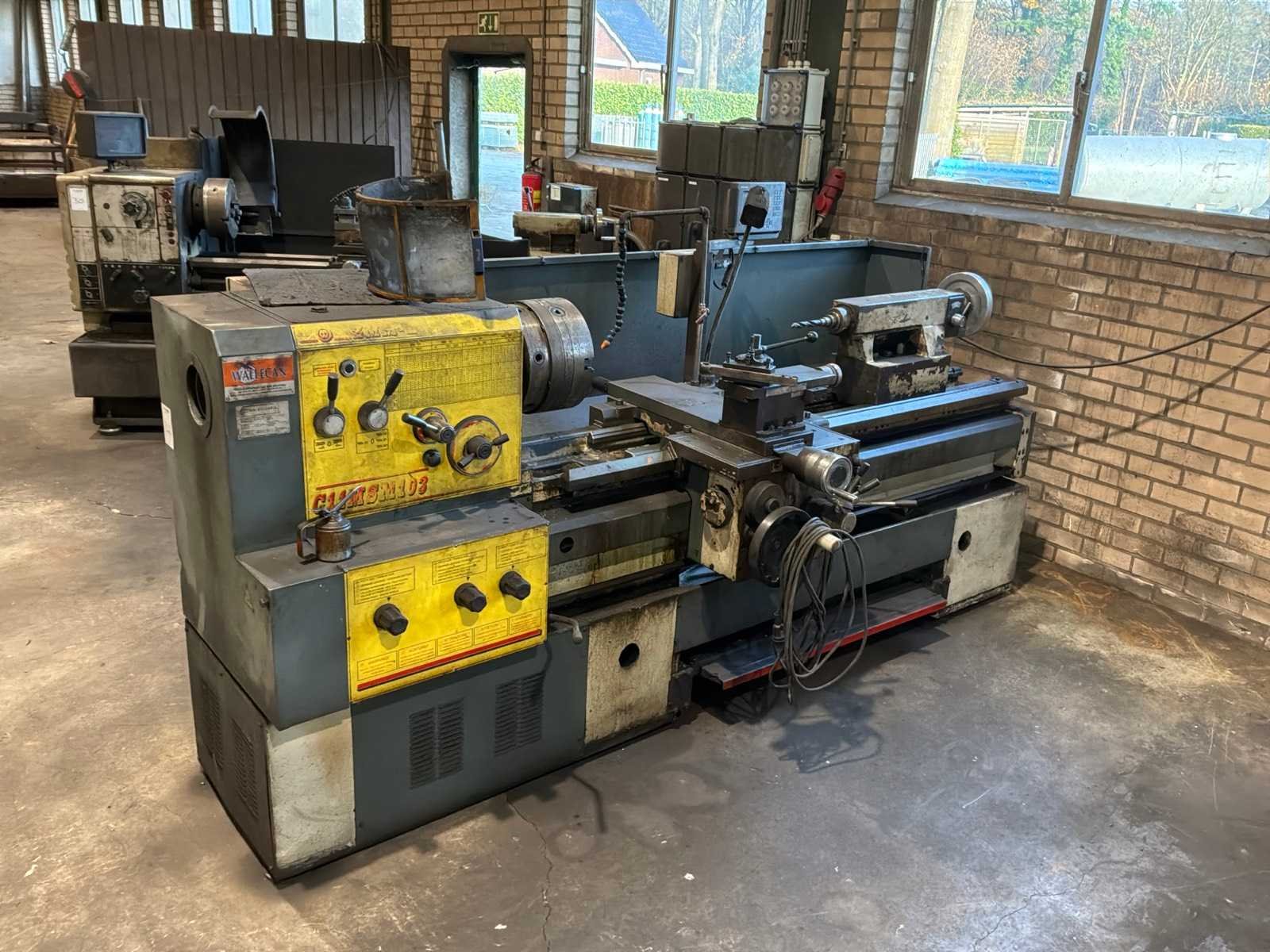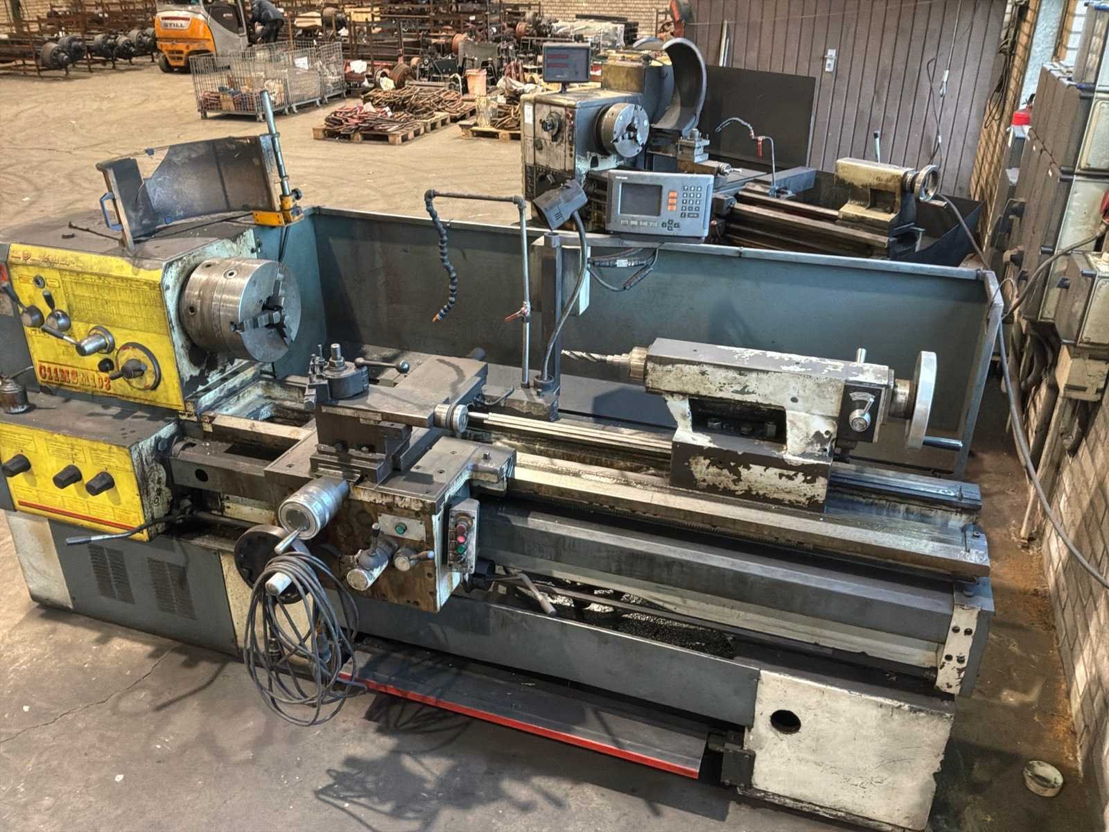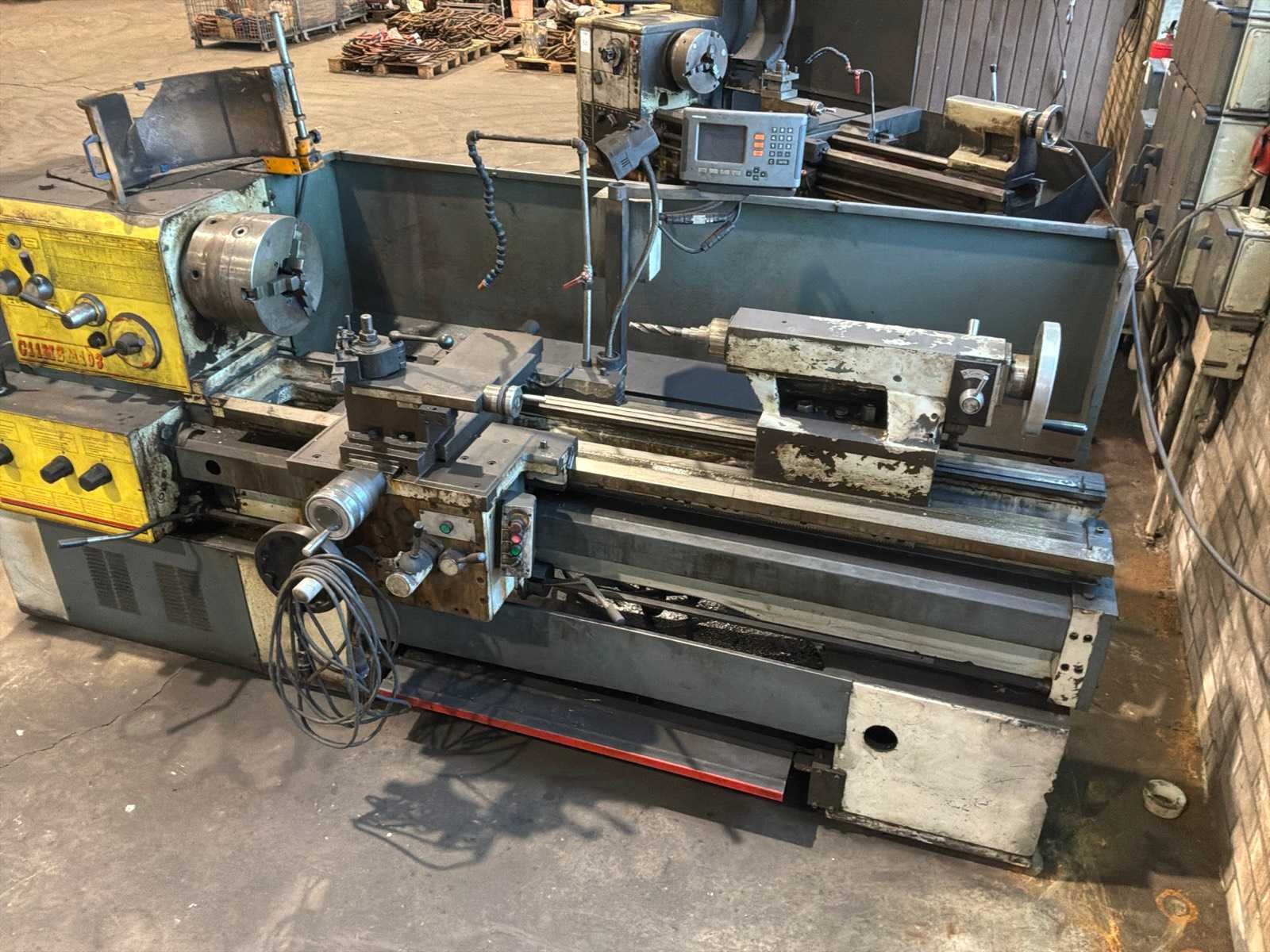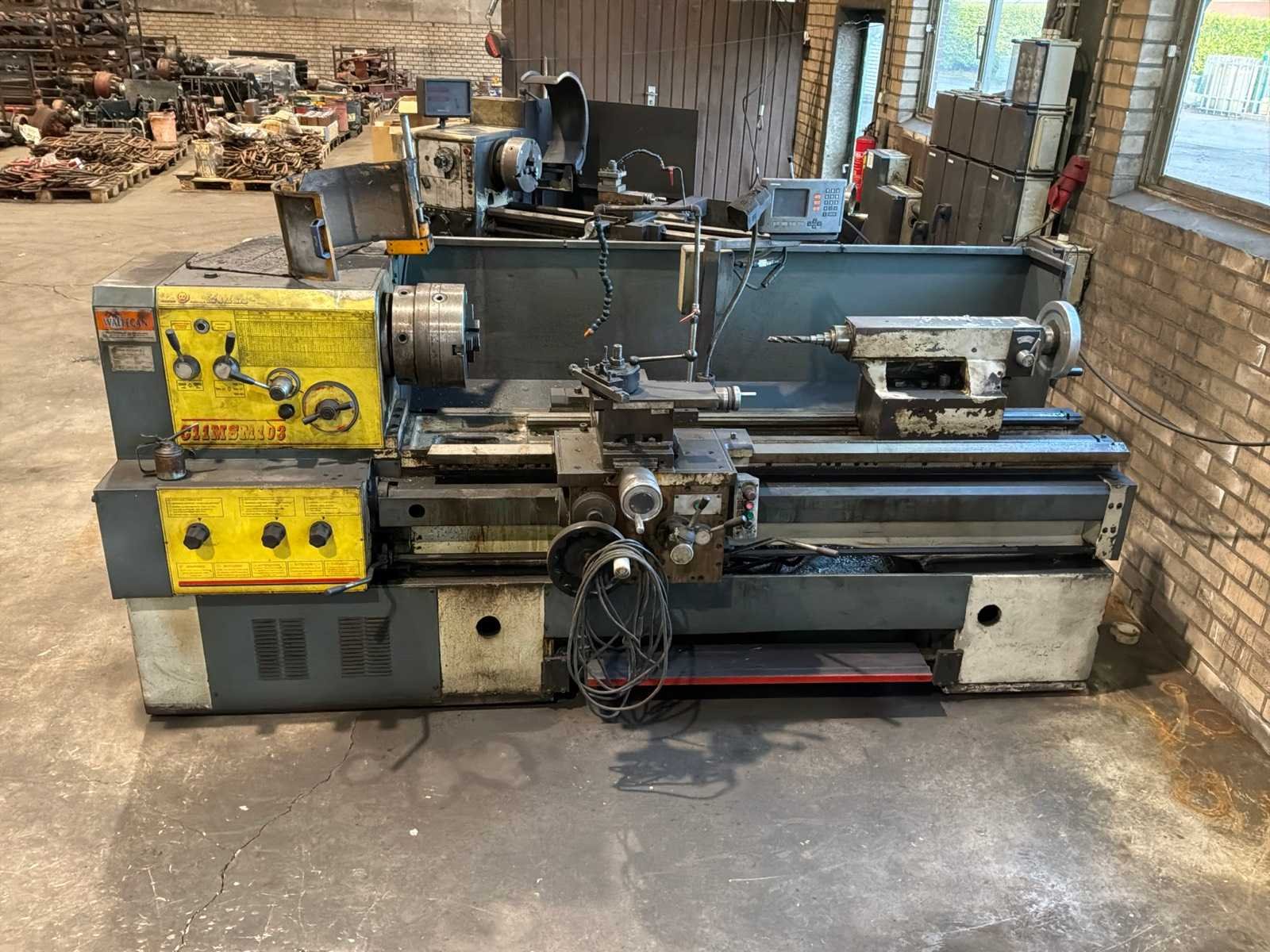 Voorzien van 3-klauw plaat, gereedschaphouder, Merk: ZMM-Bulgaria Type: C11MSM103 Bouwjaar: 2003 Serienummer: 19327 Draailengte: 1550mm Draai: 600mm Holle spil Ø: 100mm Snelheid tot n =: 1400rpm Koelmiddelpomp: true Aansluiting: 400V Machinegewicht: 2700kg Afmeting l: 3200mm Afmeting b: 1400mm Afmeting h: 1700mm