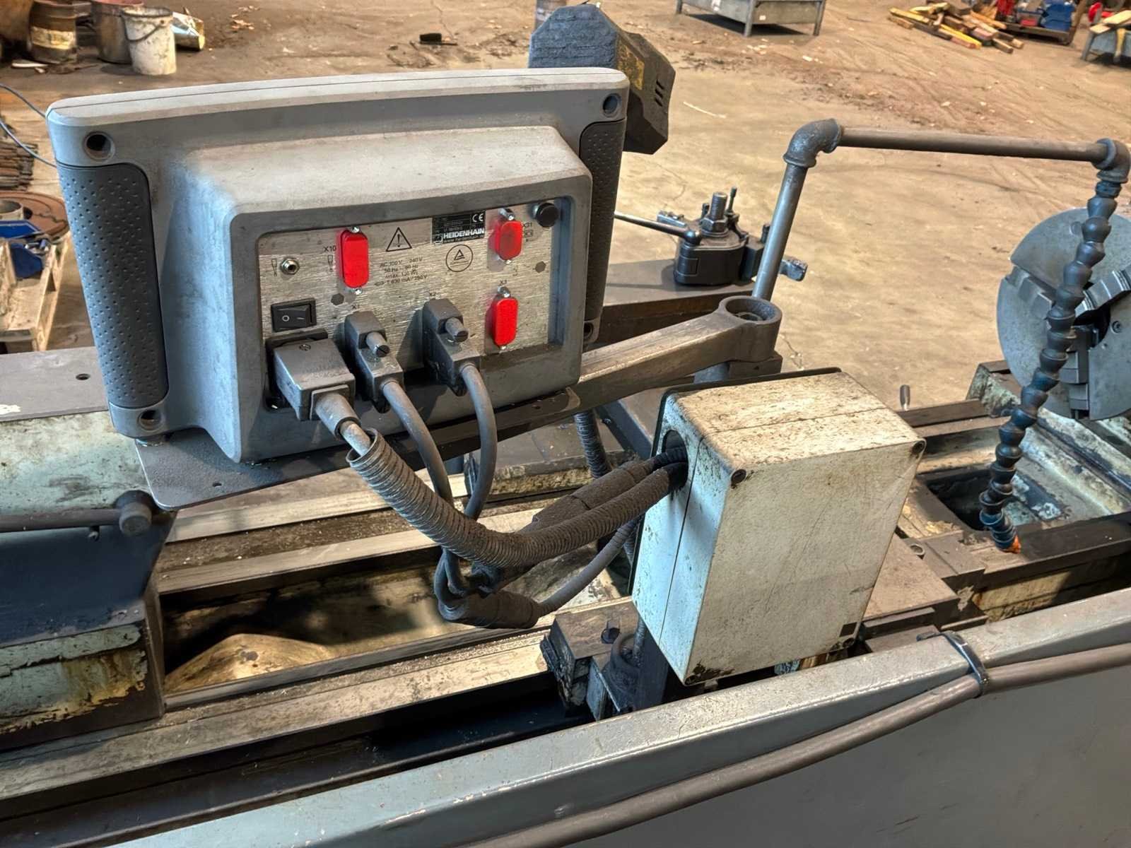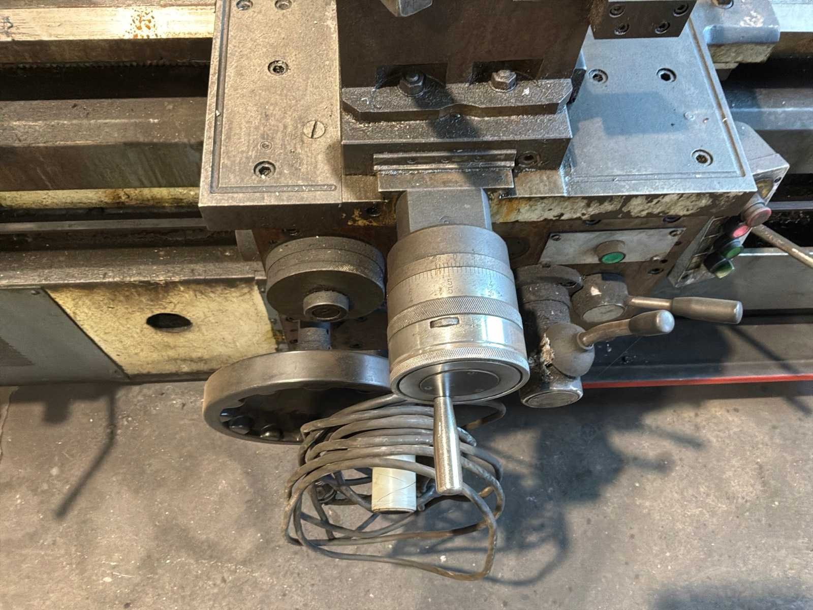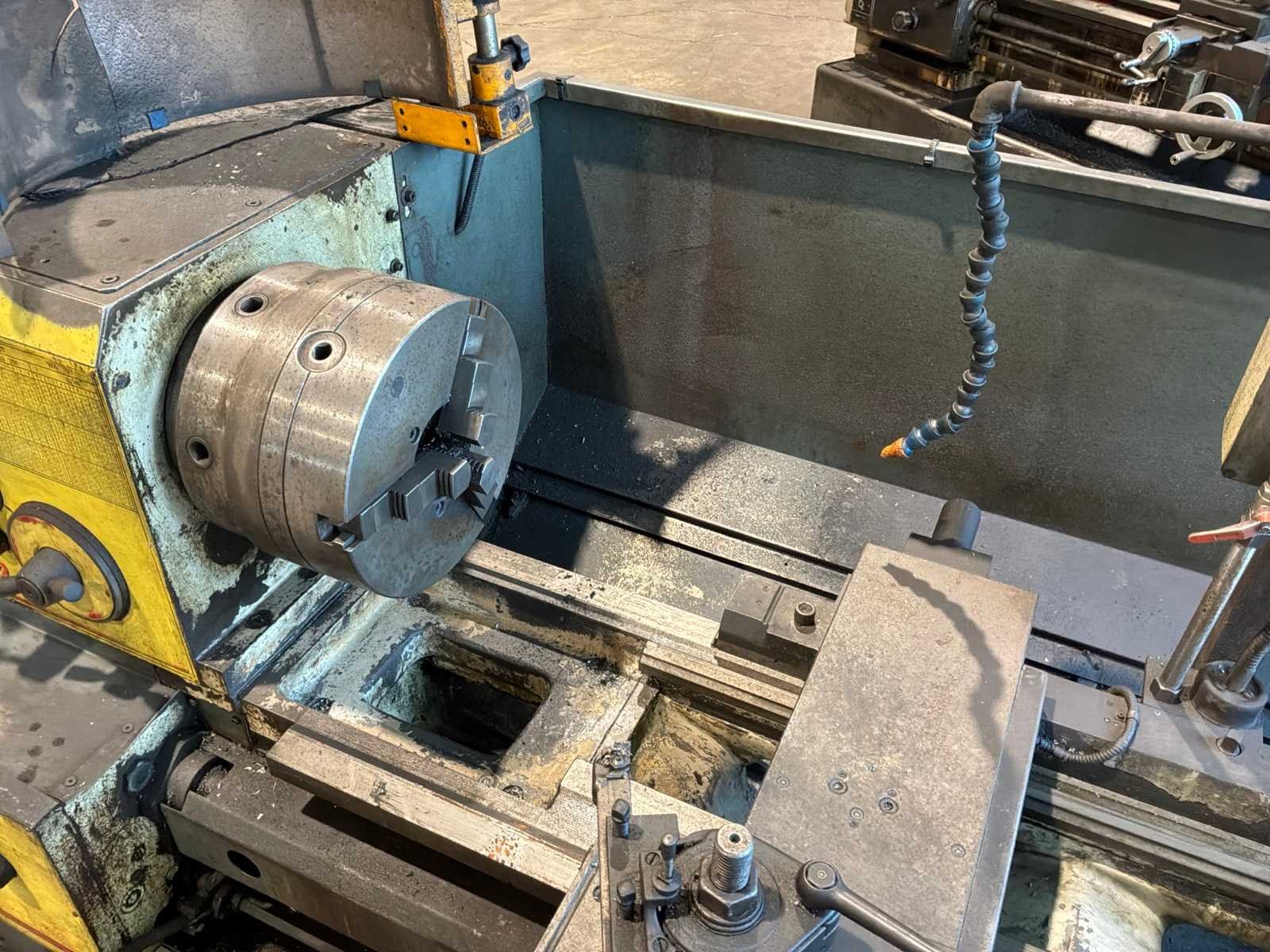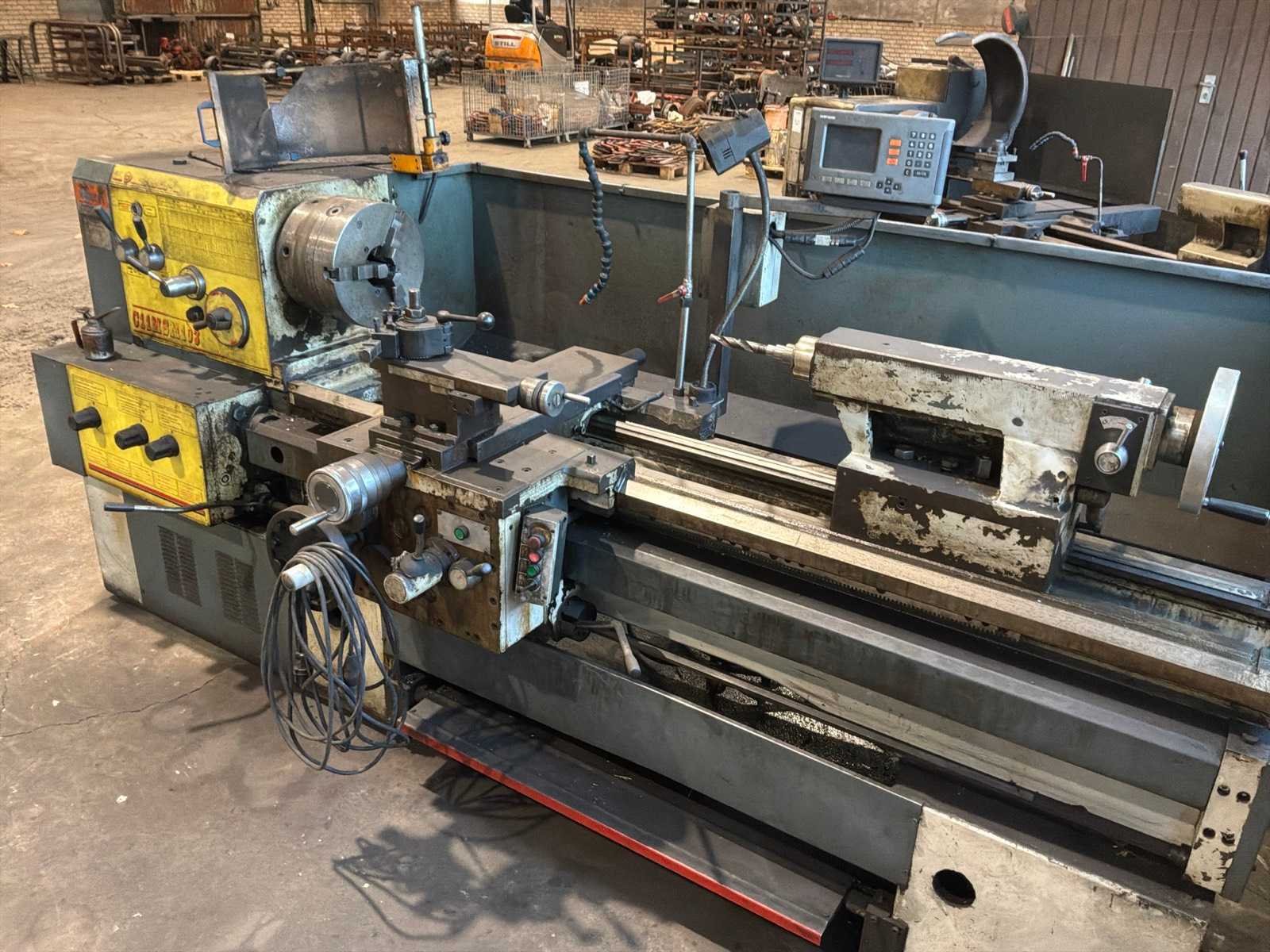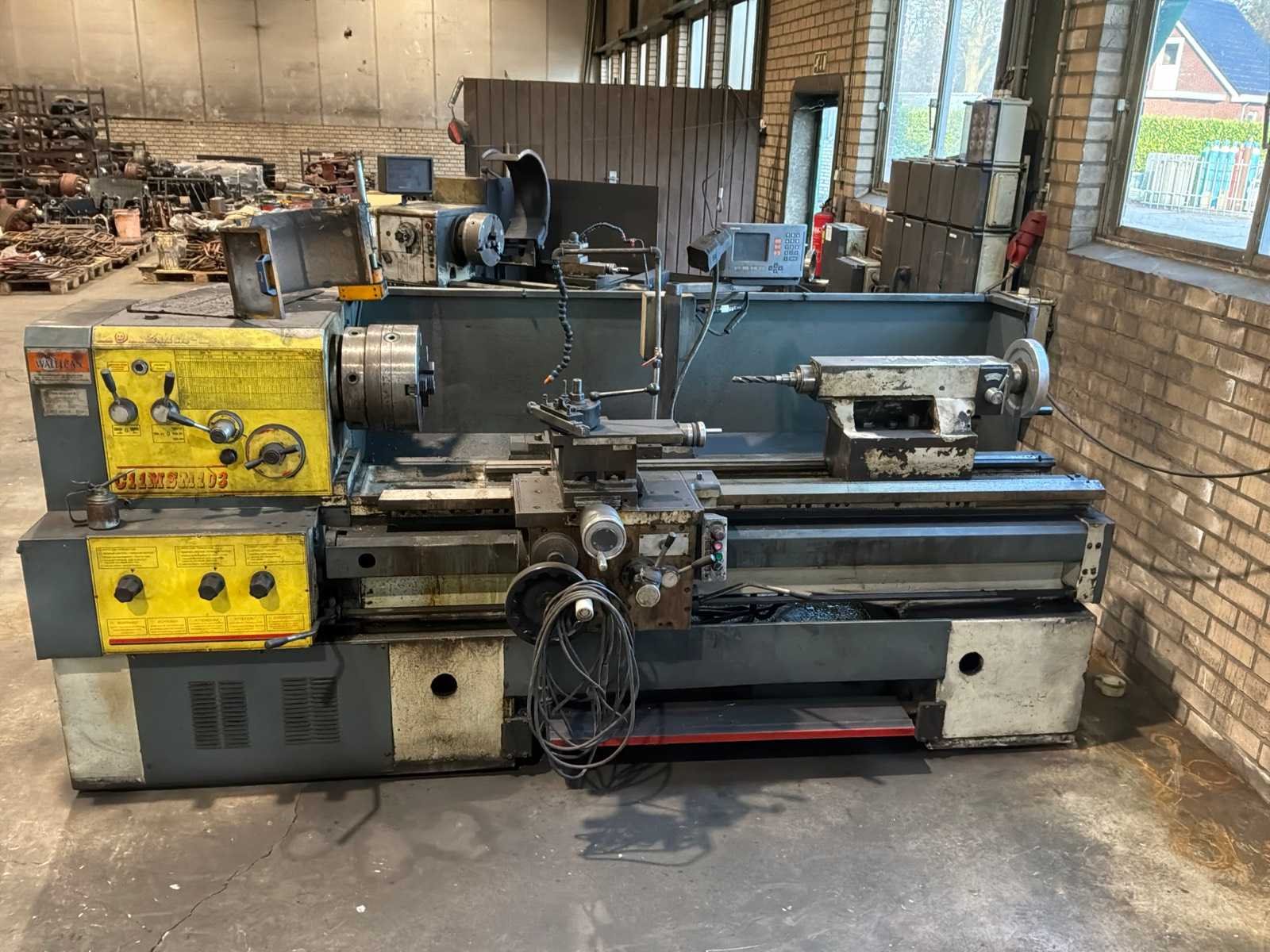 Voorzien van 3-klauw plaat, gereedschaphouder, Merk: ZMM-Bulgaria Type: C11MSM103 Bouwjaar: 2003 Serienummer: 19327 Draailengte: 1550mm Draai: 600mm Holle spil Ø: 100mm Snelheid tot n =: 1400rpm Koelmiddelpomp: true Aansluiting: 400V Machinegewicht: 2700kg Afmeting l: 3200mm Afmeting b: 1400mm Afmeting h: 1700mm