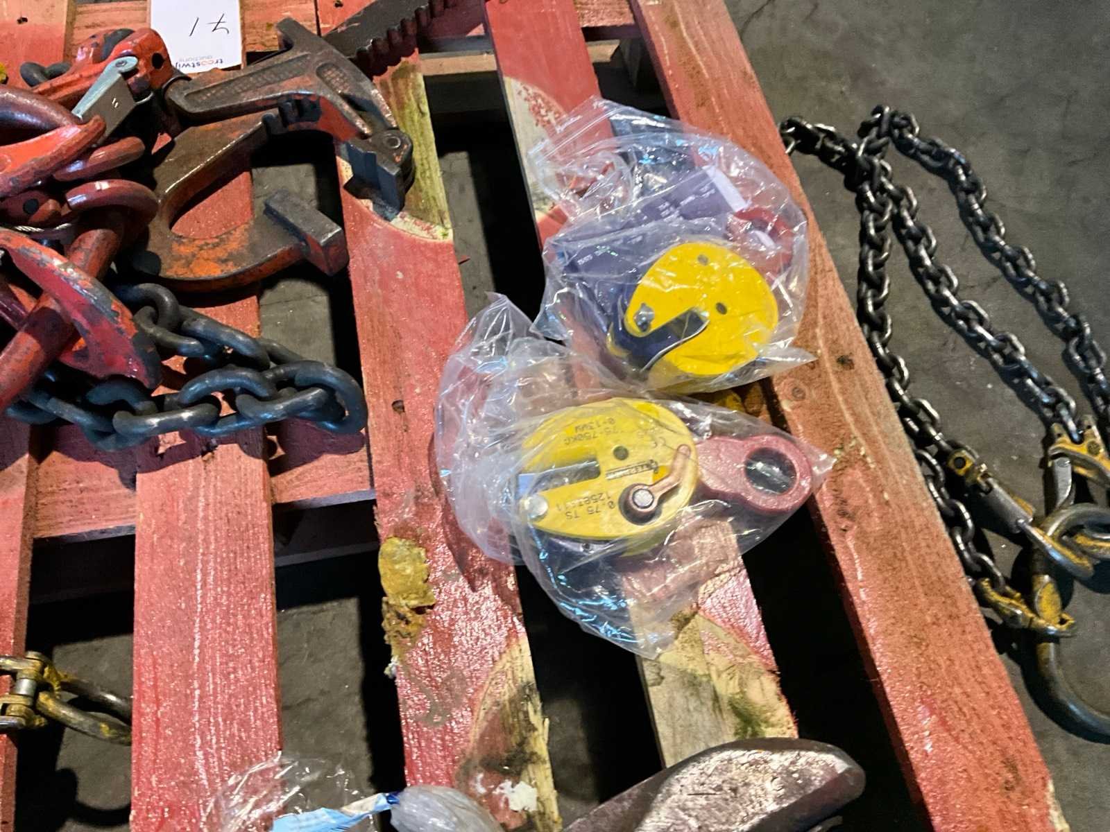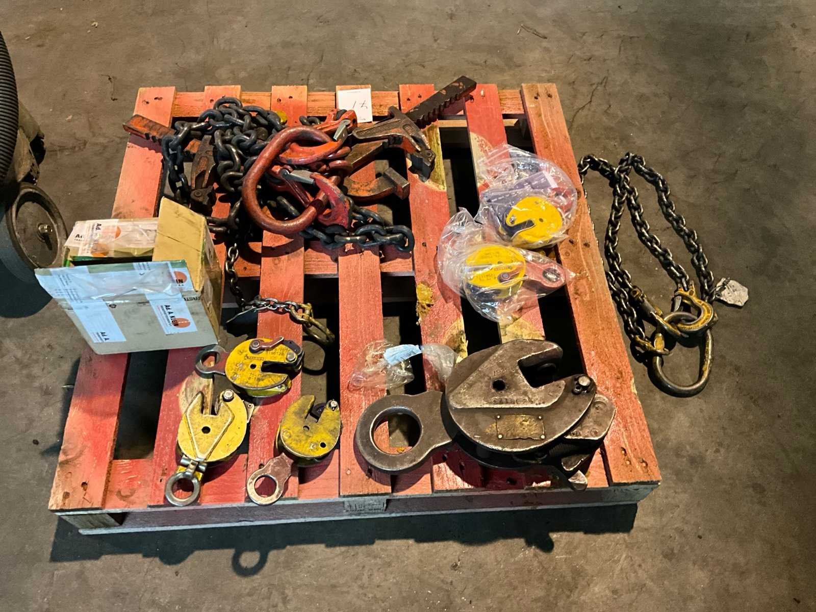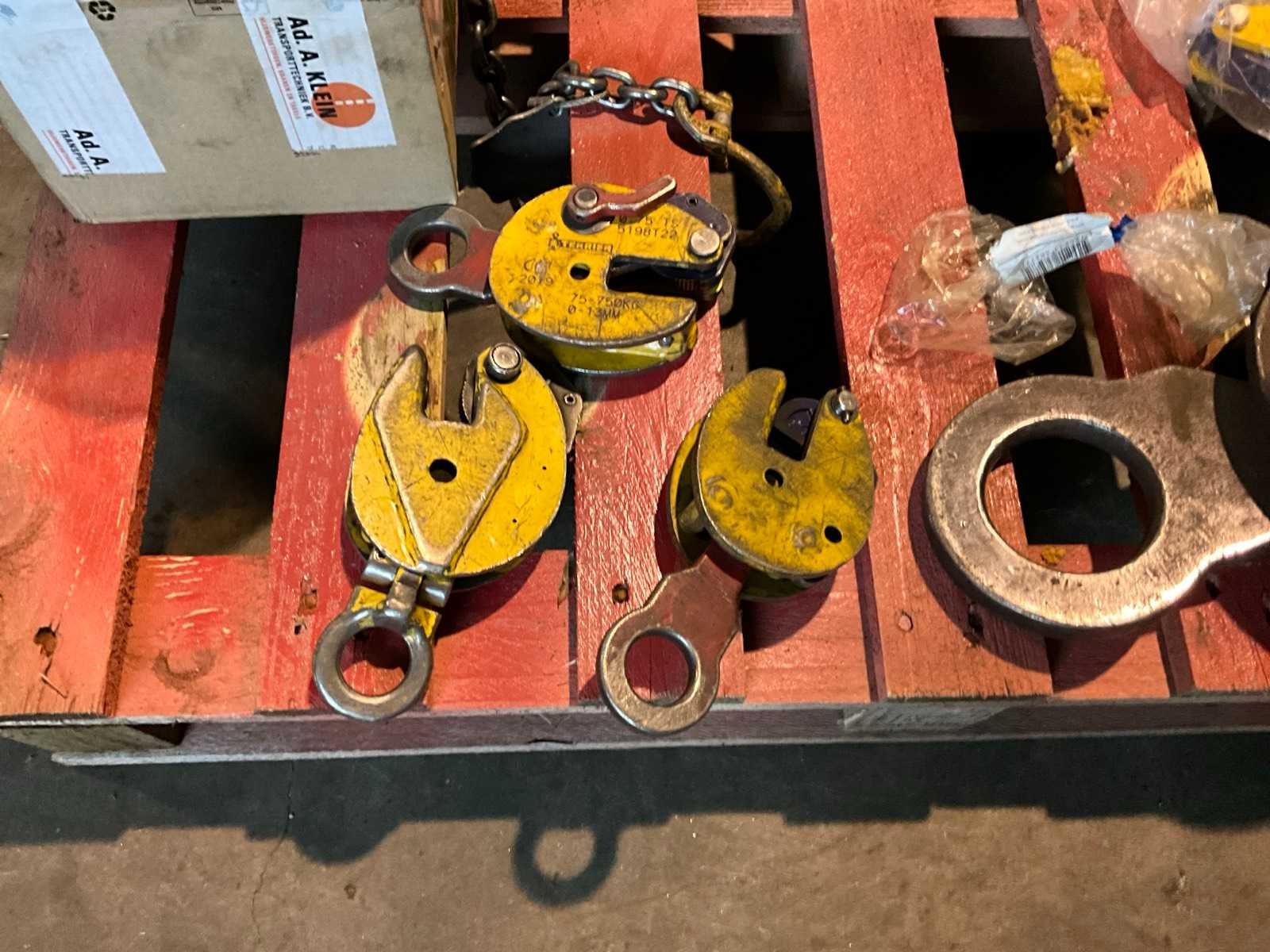 Onder andere 2x ongebruikte platenklem (2025, 0-13 mm, 75-750 Kg), 3x platenklem (0-13 mm, 75-750 Kg), hijskettingen 2-sprong