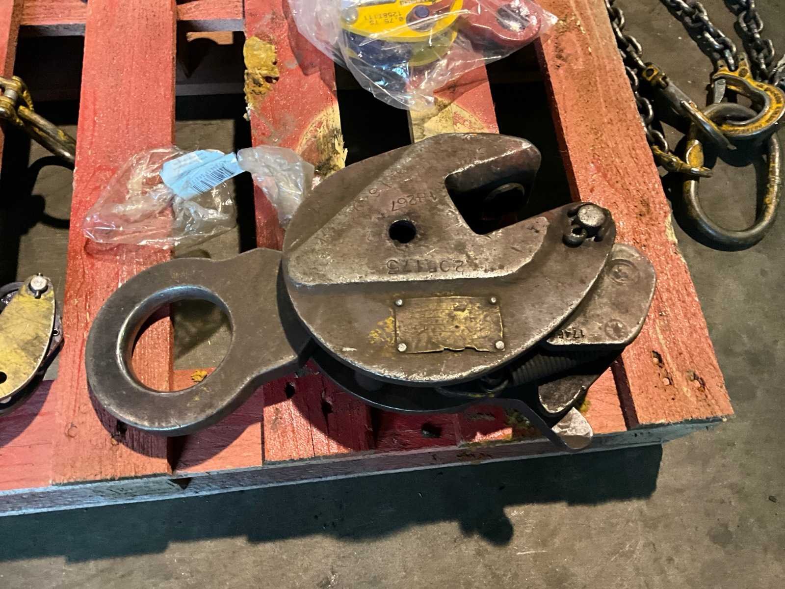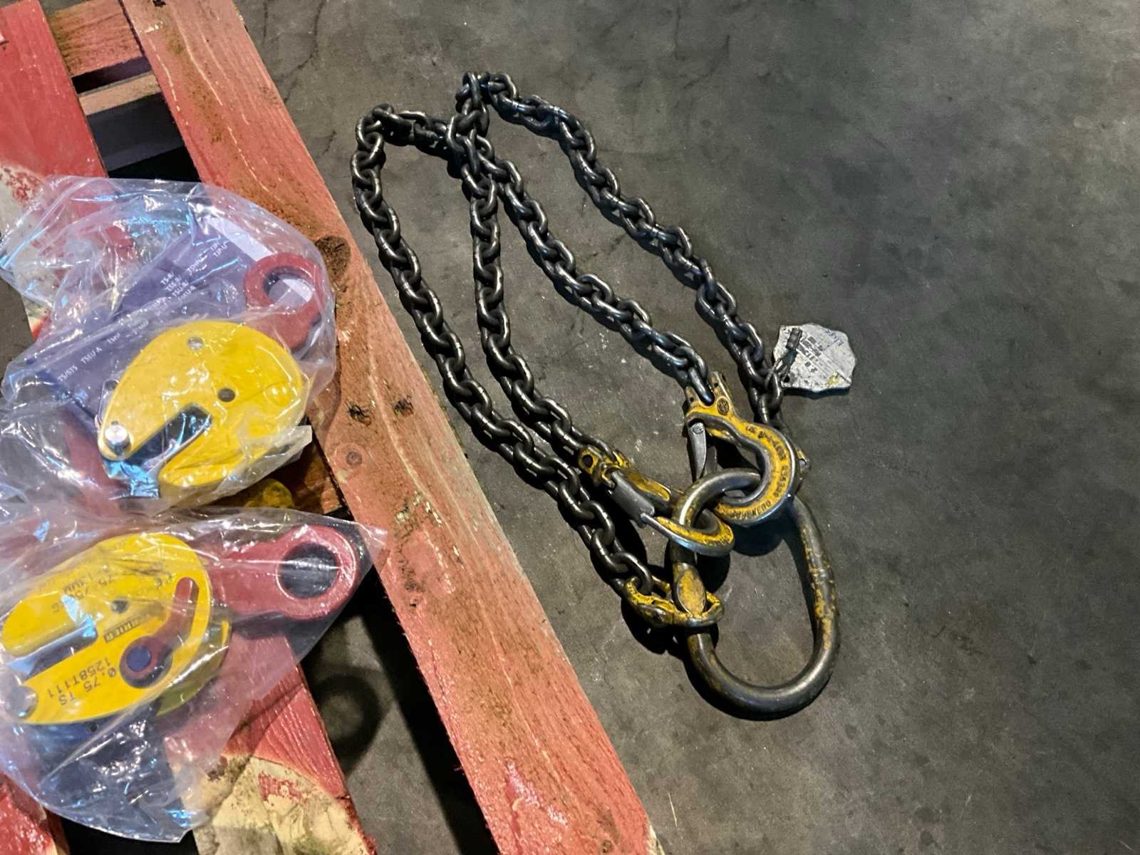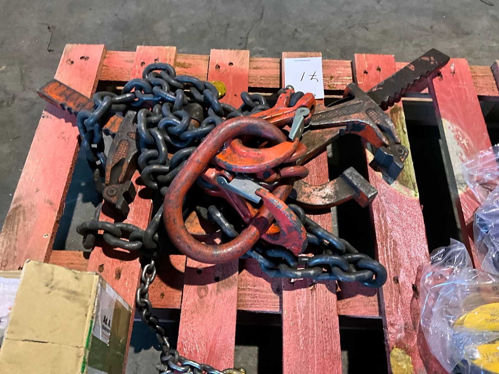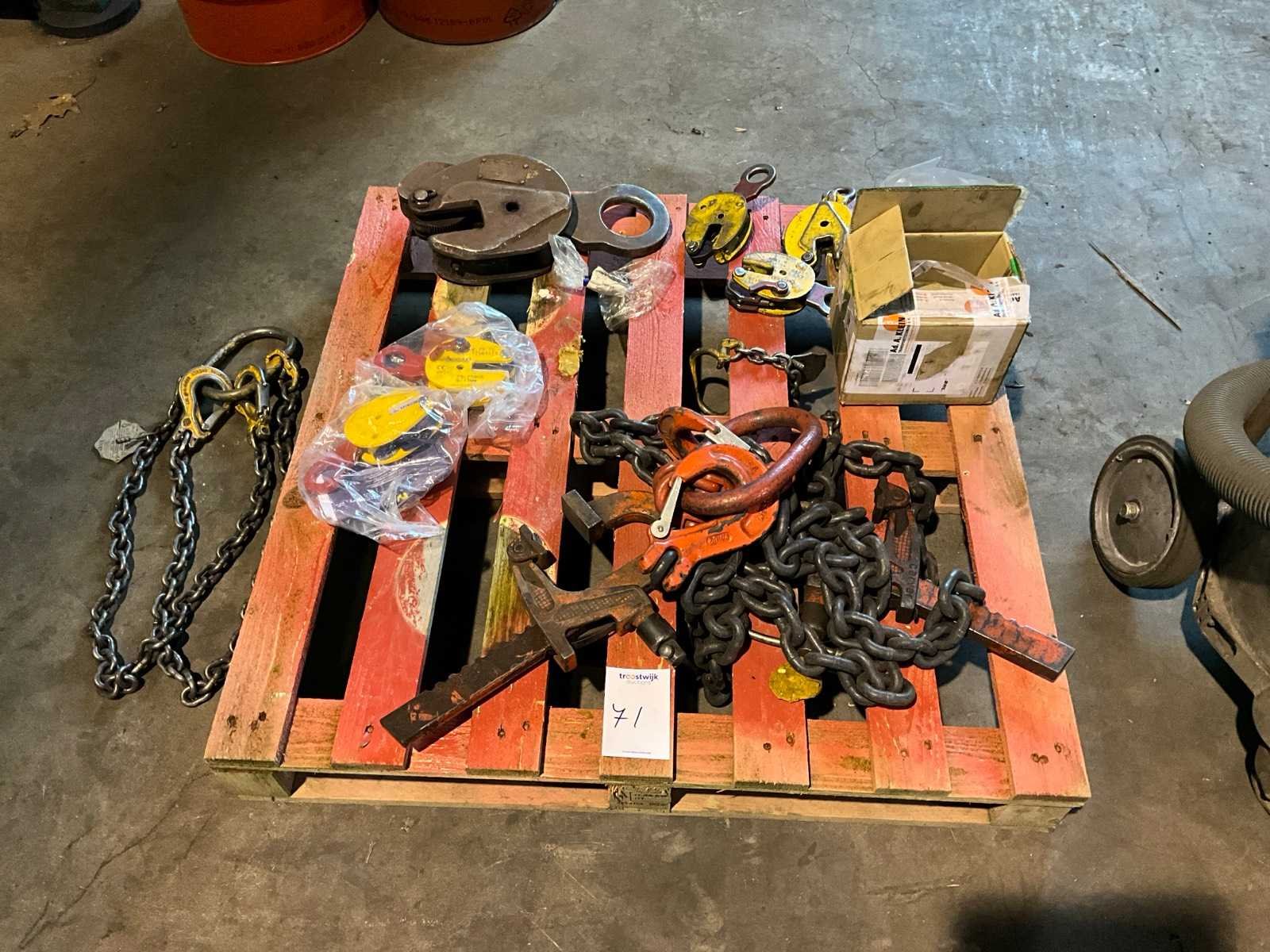Onder andere 2x ongebruikte platenklem (2025, 0-13 mm, 75-750 Kg), 3x platenklem (0-13 mm, 75-750 Kg), hijskettingen 2-sprong