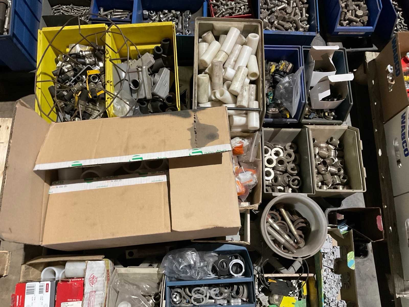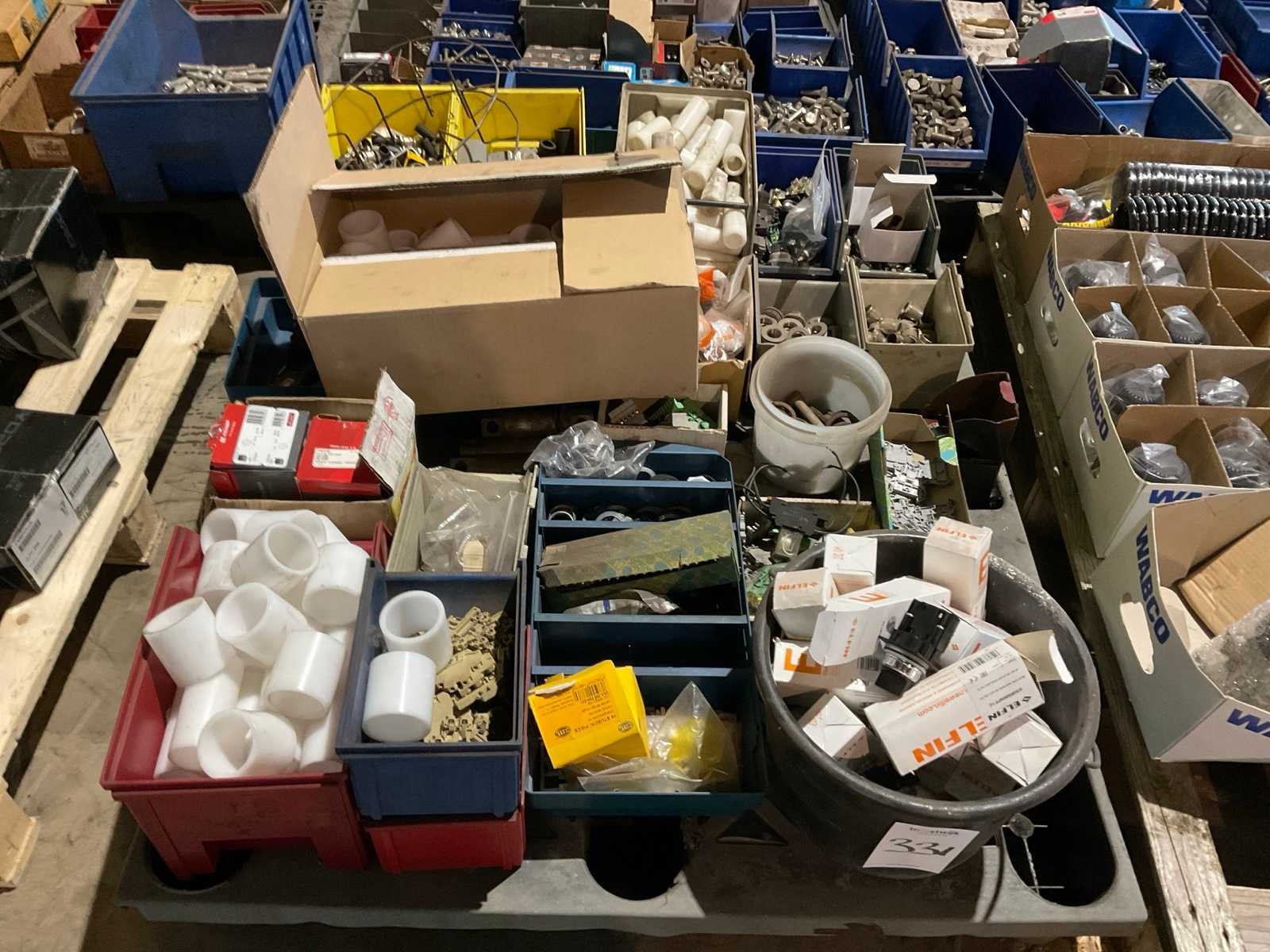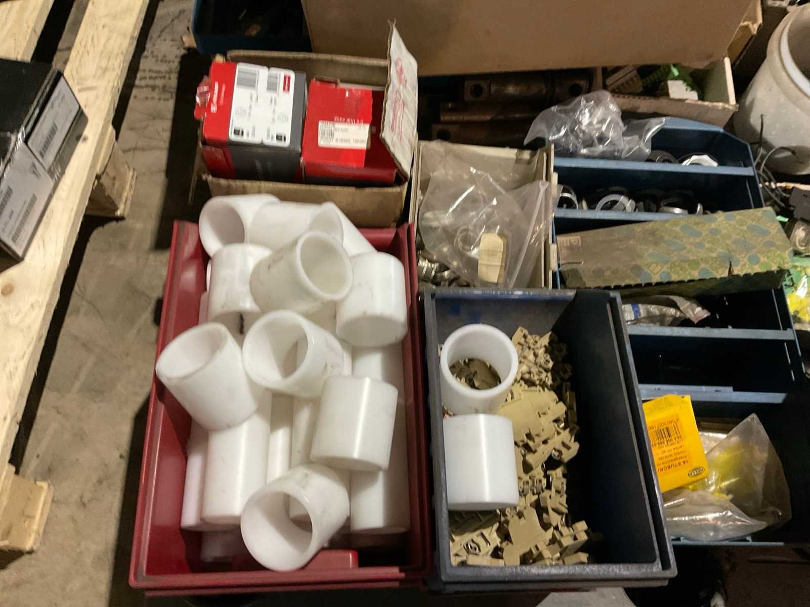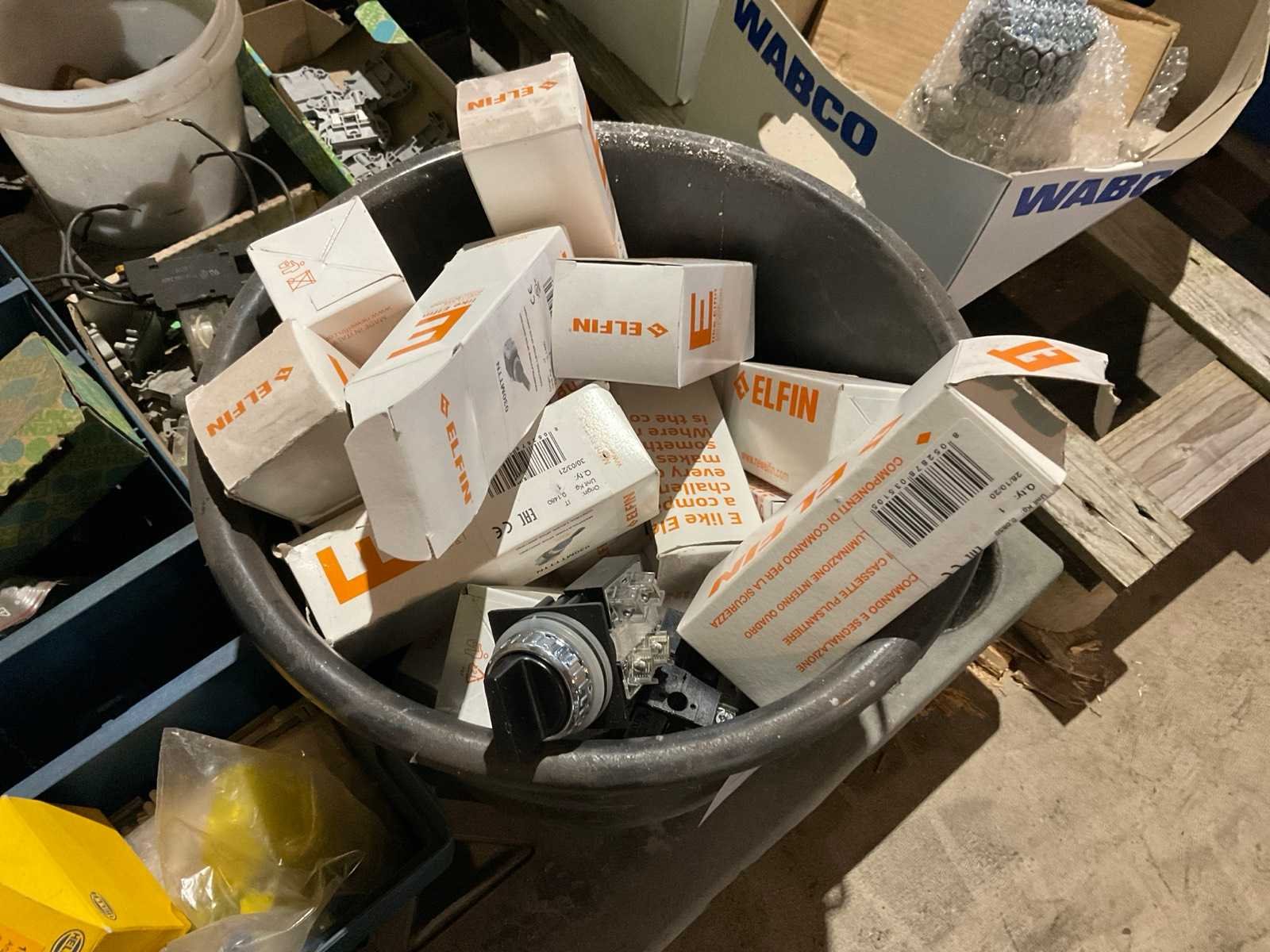 Partij Elfin schakelaars, Teflon cilinders, elektra materiaal, etc. Op en inclusief pallet.