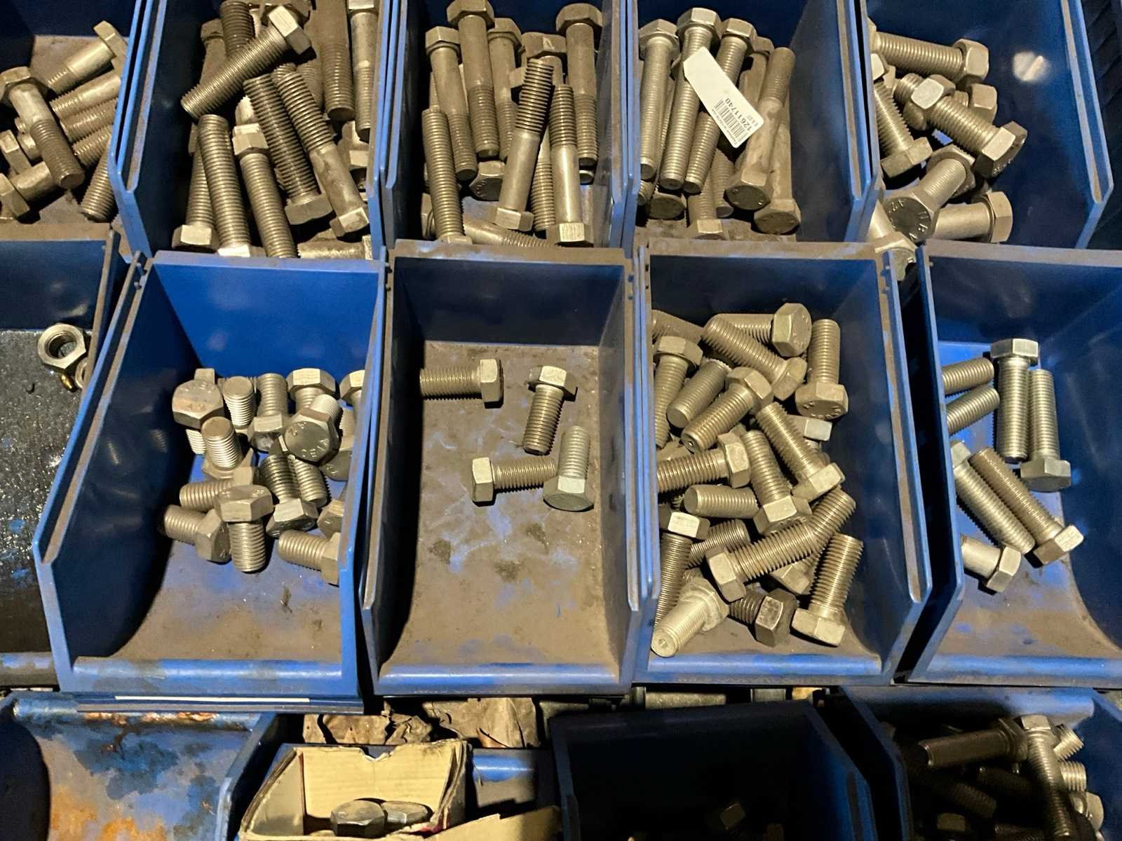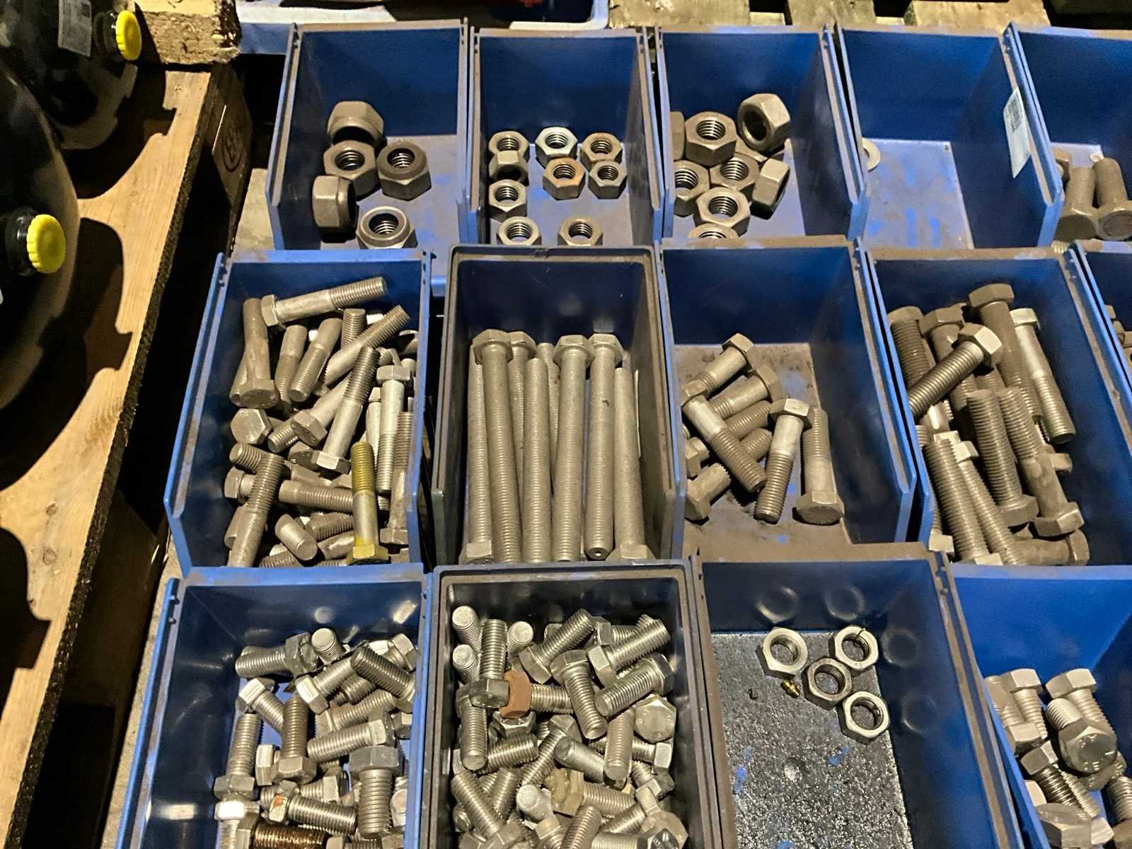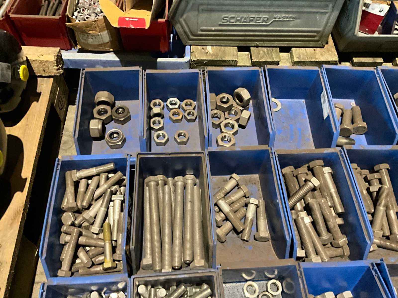 Bestaande uit diverse maten 6-kant bouten en moeren, in grijpvoorraad bakken op en met 1 pallet