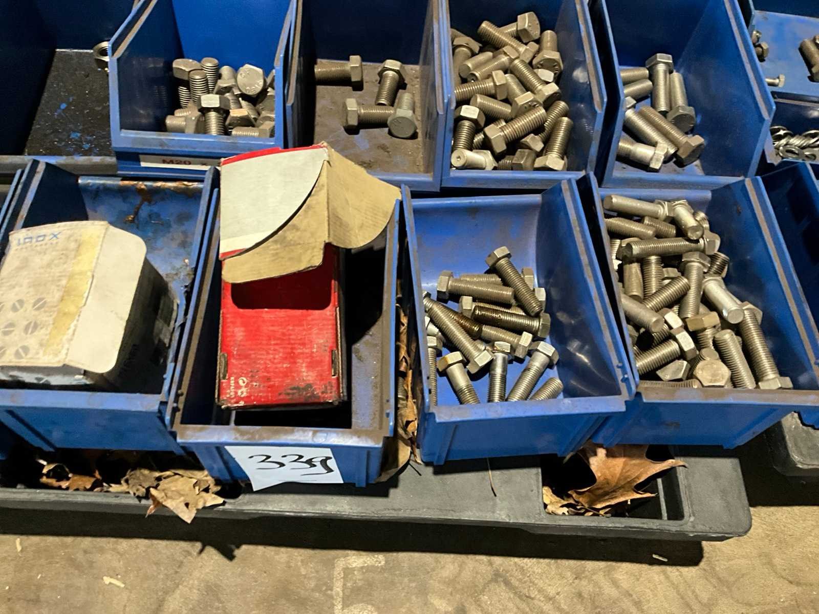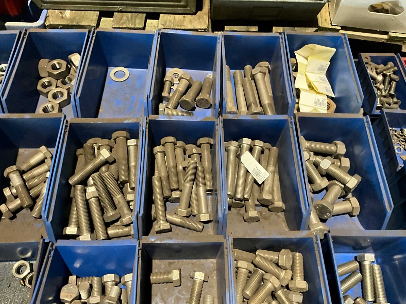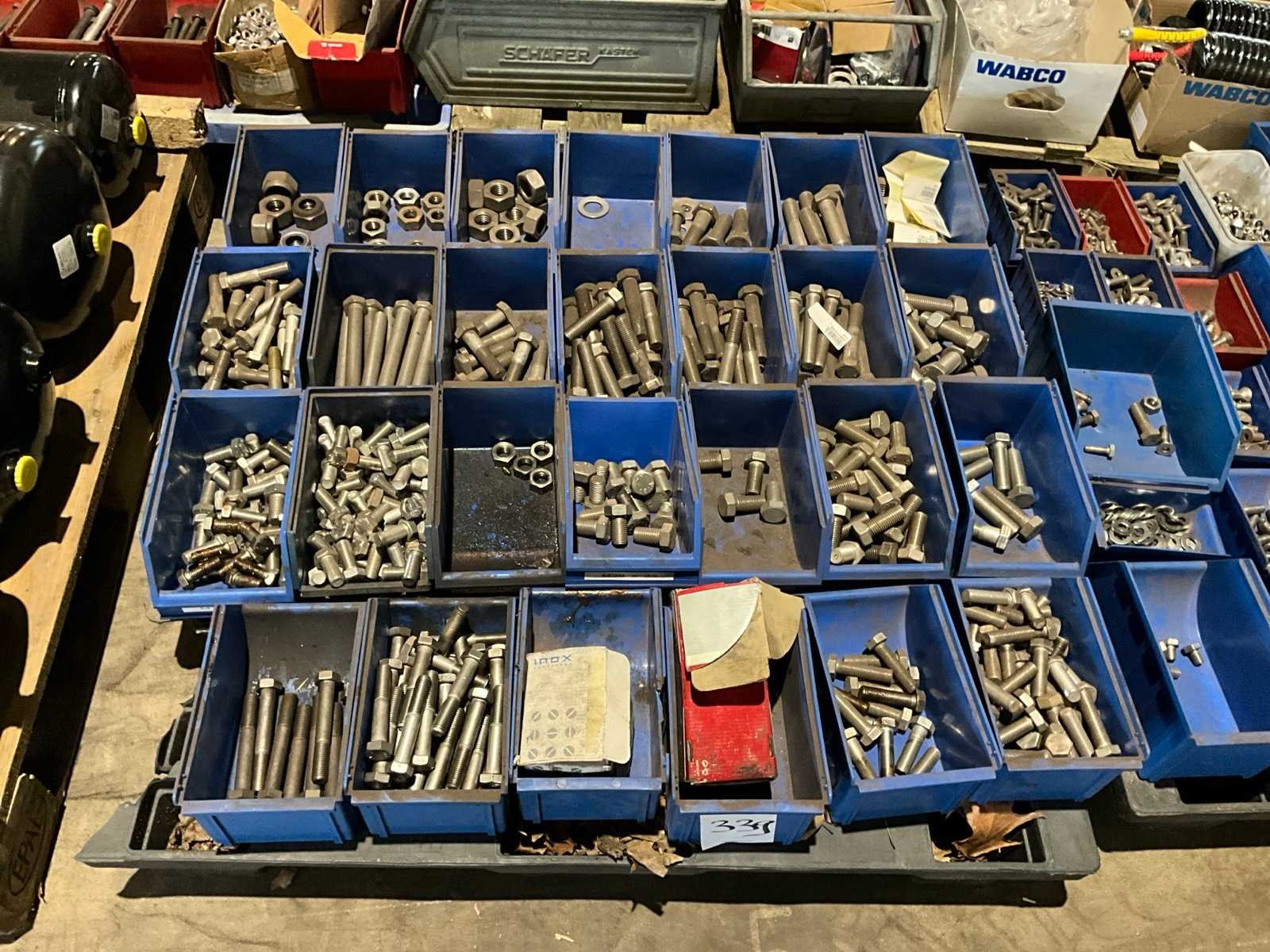 Bestaande uit diverse maten 6-kant bouten en moeren, in grijpvoorraad bakken op en met 1 pallet
