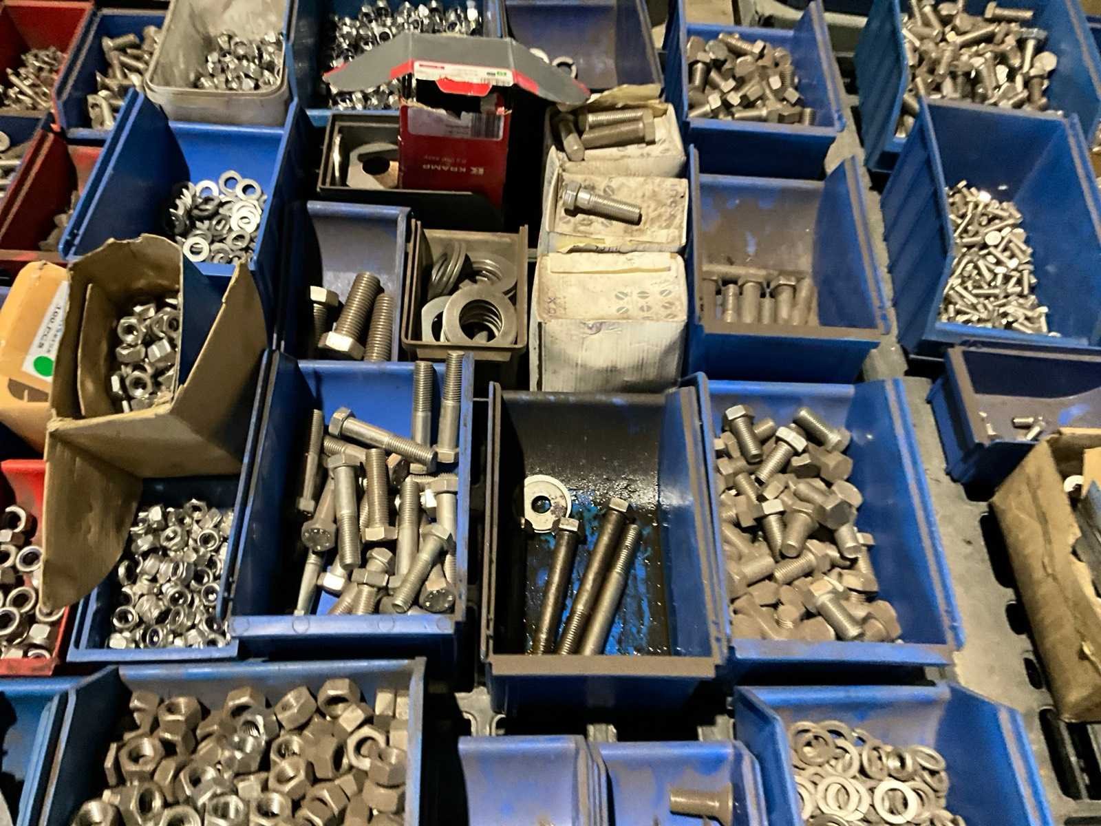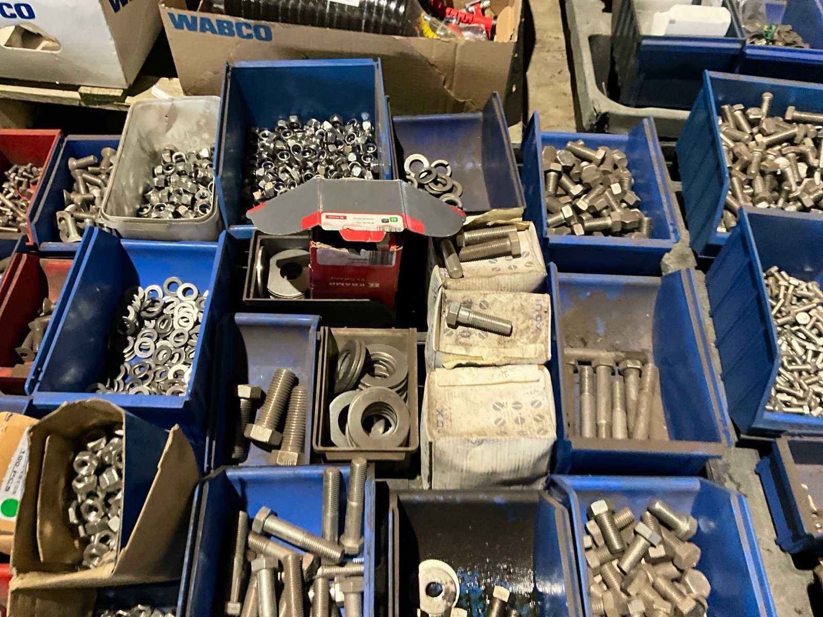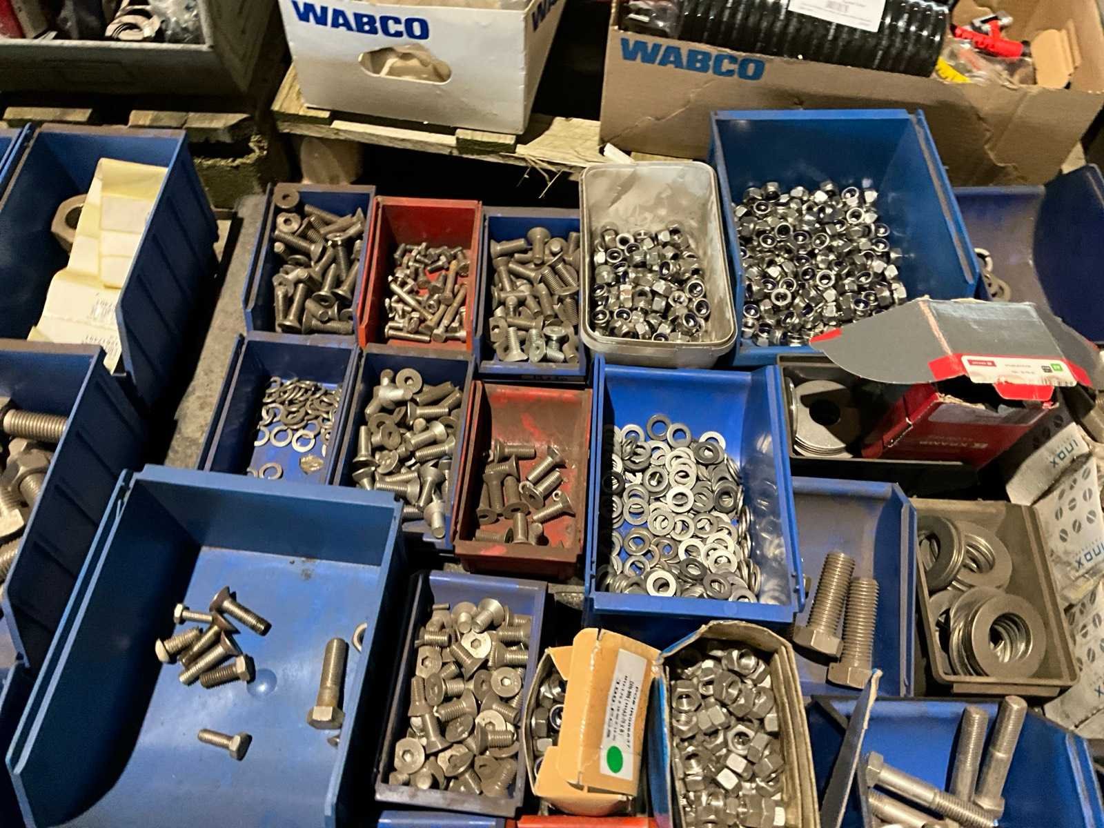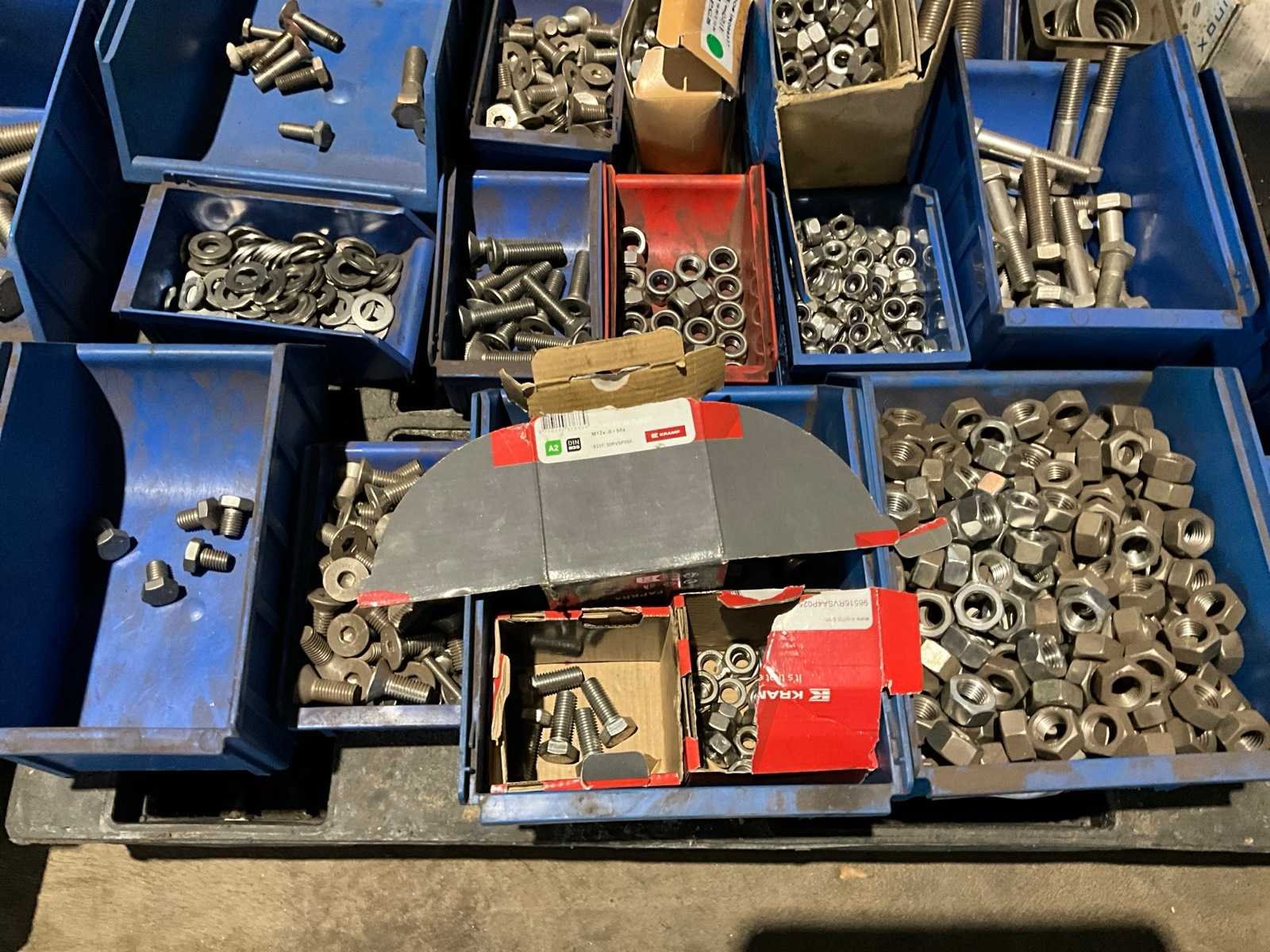 Bestaande uit diverse maten 6-kant en verzonken bouten, moeren (o.a. zelfborgend), in grijpvoorraad bakken op en met 1 pallet