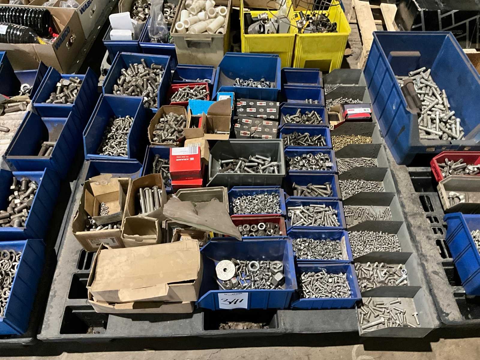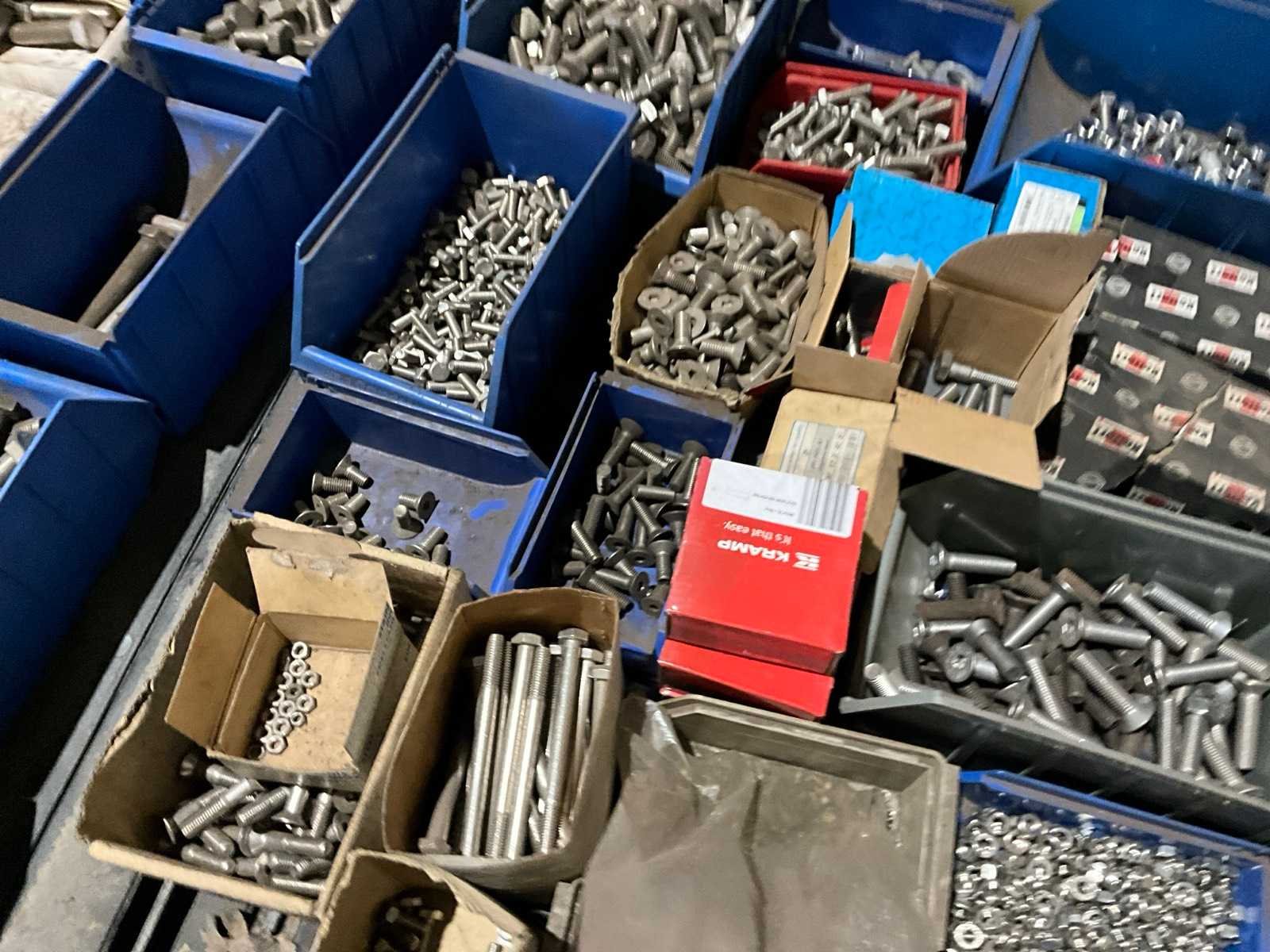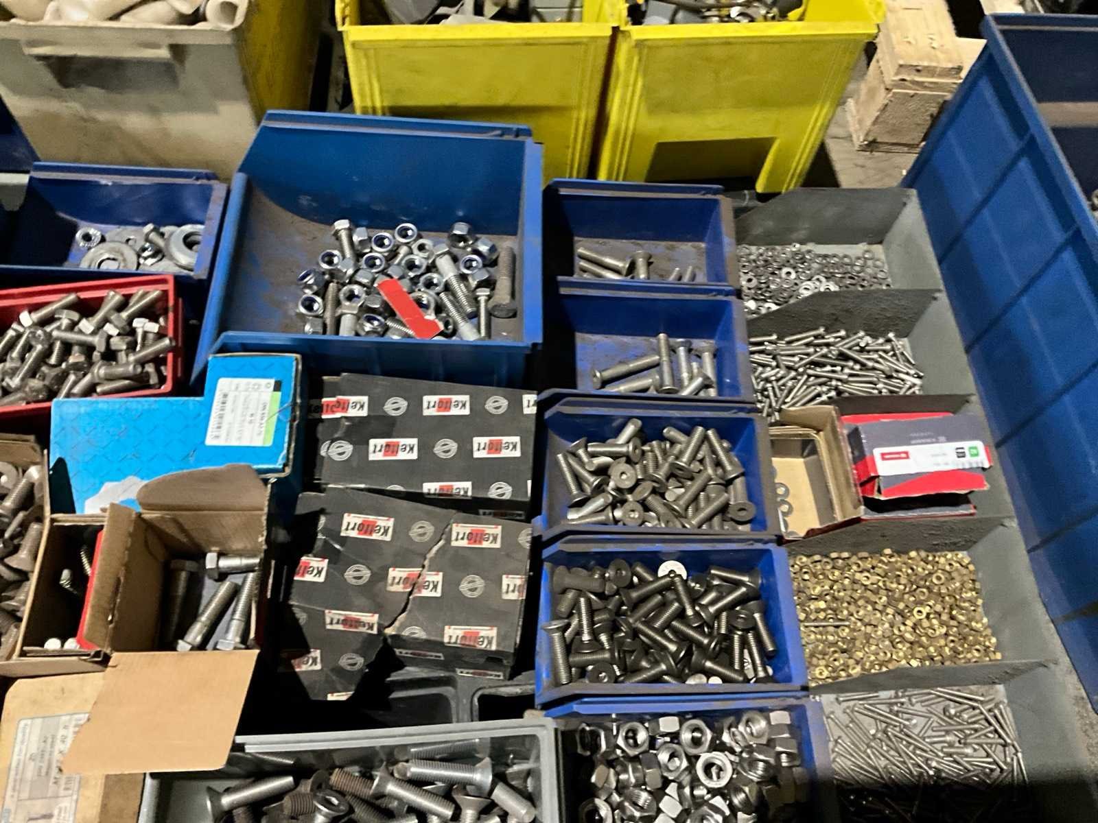 Bestaande uit diverse maten 6-kant en verzonken bouten, moeren (o.a. zelfborgend), in grijpvoorraad bakken op en met 1 pallet