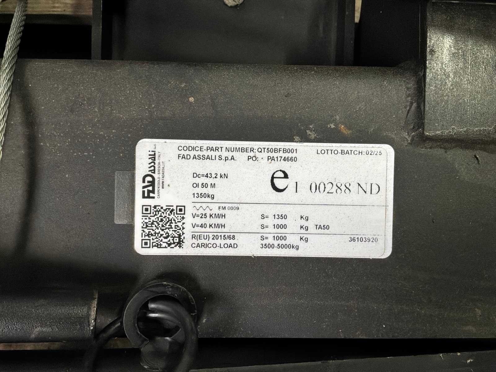 Fabrikant: FAD ASSALI S.p.A. Onderdeelnummer (CODICE-PART NUMBER): QT50BFB001 Belasting (CARICO-LOAD): 3500-5000 kg Snelheidsbeperkingen: V=25 KM/H: S= 1350 Kg V=40 KM/H: S= 1000 Kg TA50 Batchnummer (LOTTO-BATCH): 02/25 Certificering: R(EU) 2015/68 Merk: FAD Assali