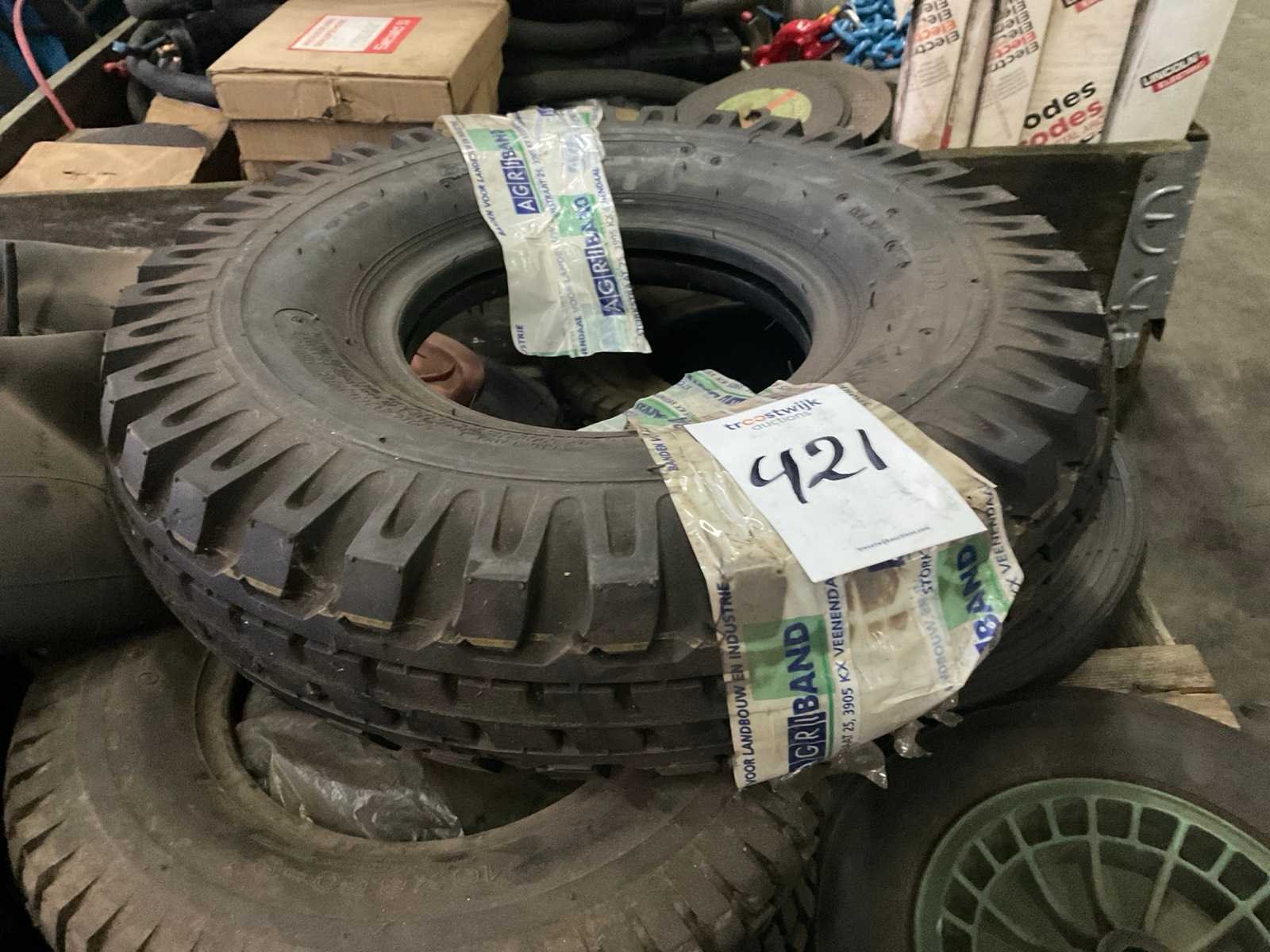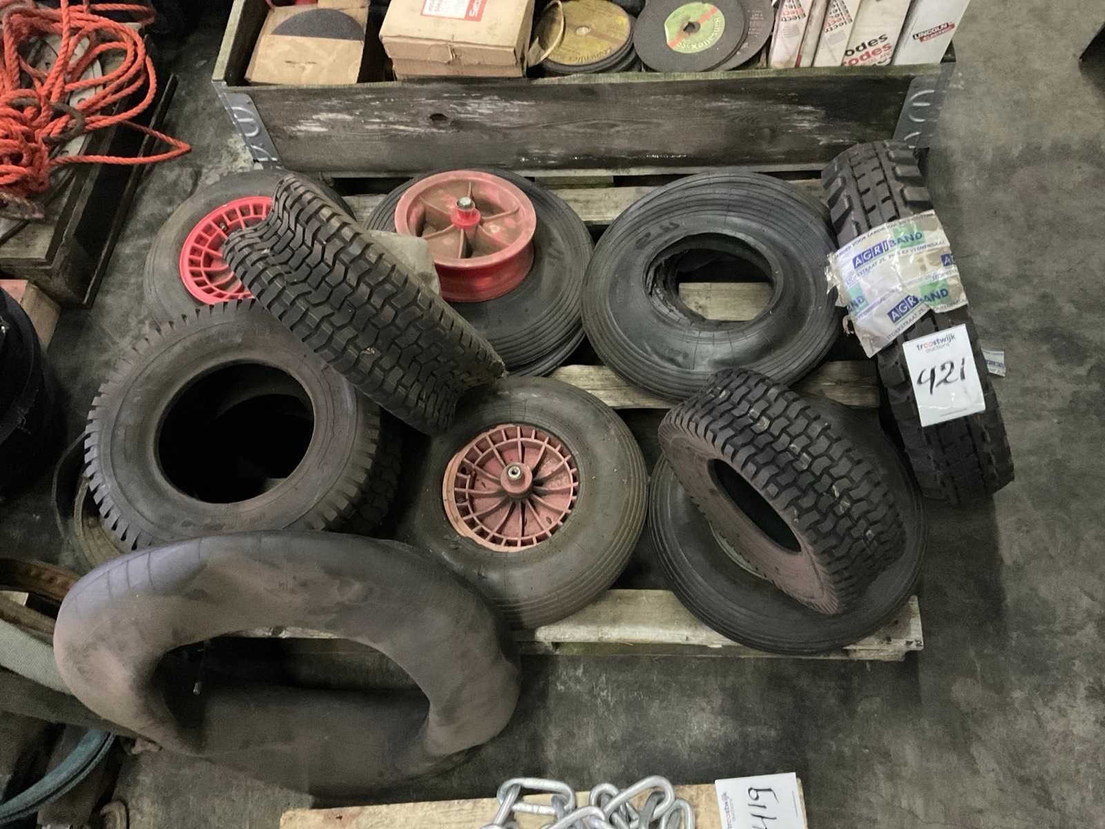 Waaronder: kruiwagen wielen, gazon banden 16x6.50-8, minitractorband 13x5.0, 6-9