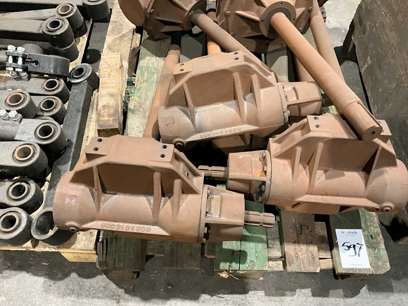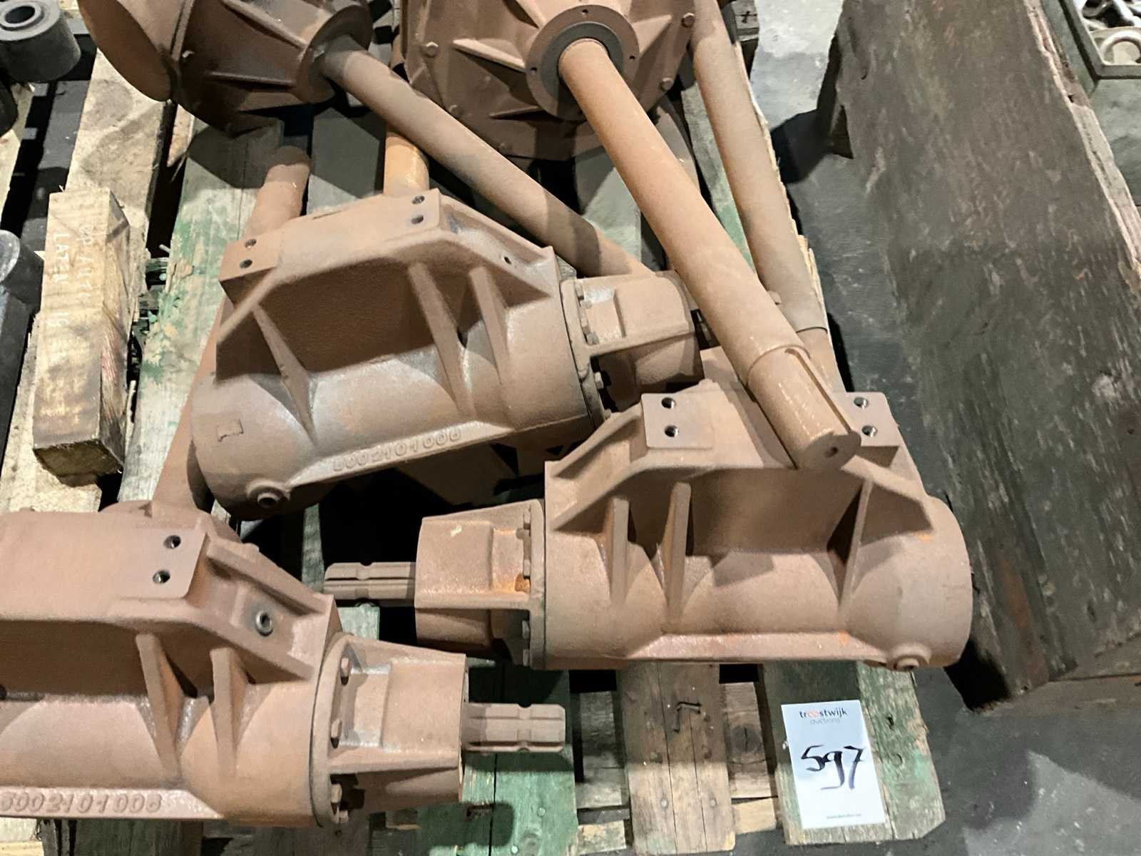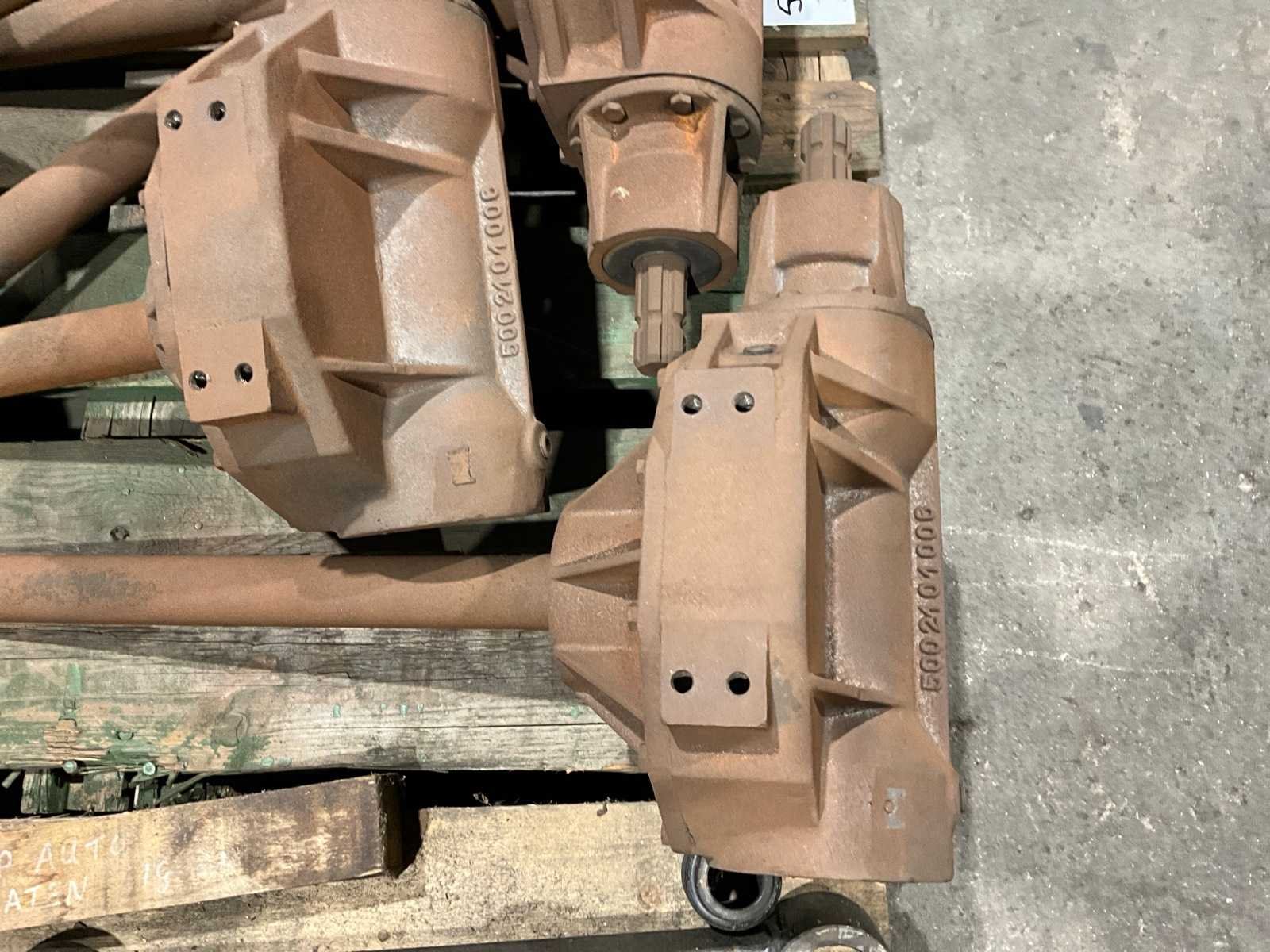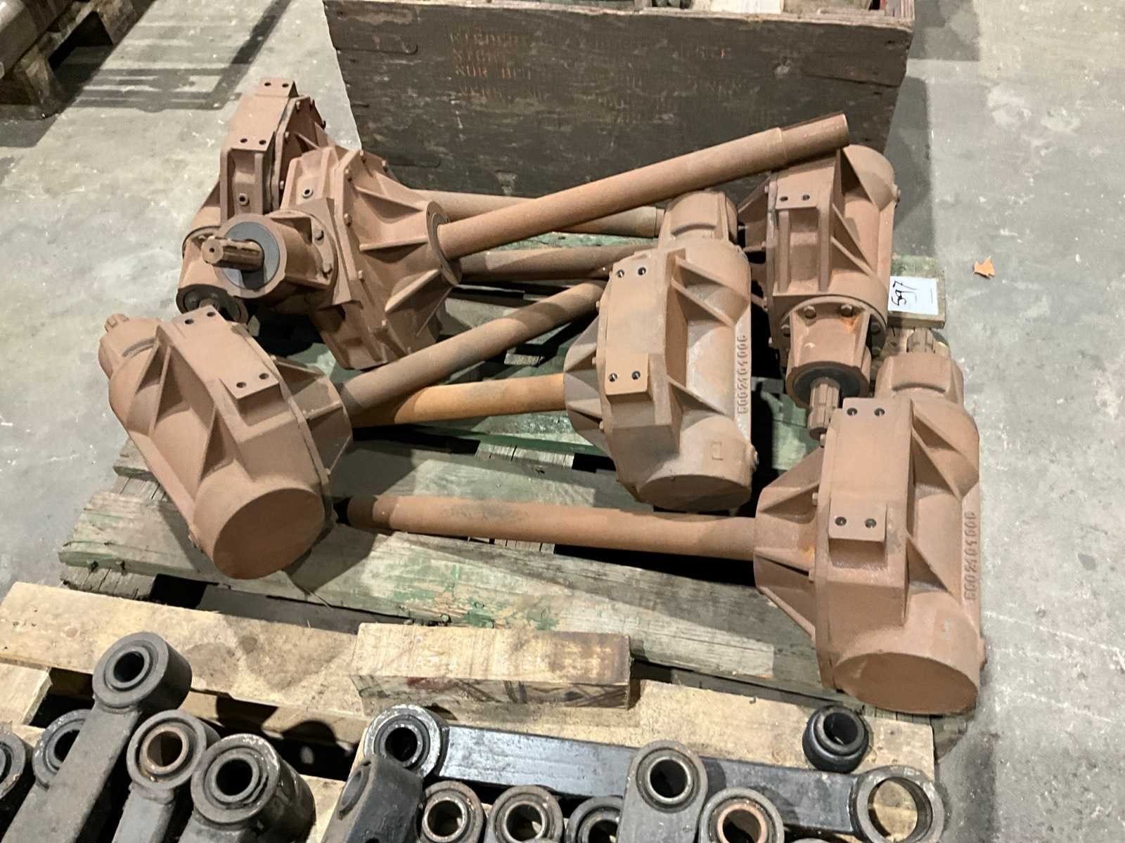 1 zijde met aftakas stomp, 1 zijde met lange as, as lengte 565 mm, totale afmeting 1 haakse overbrenging (lxb) 800x500 mm, alles op 1 pallet
