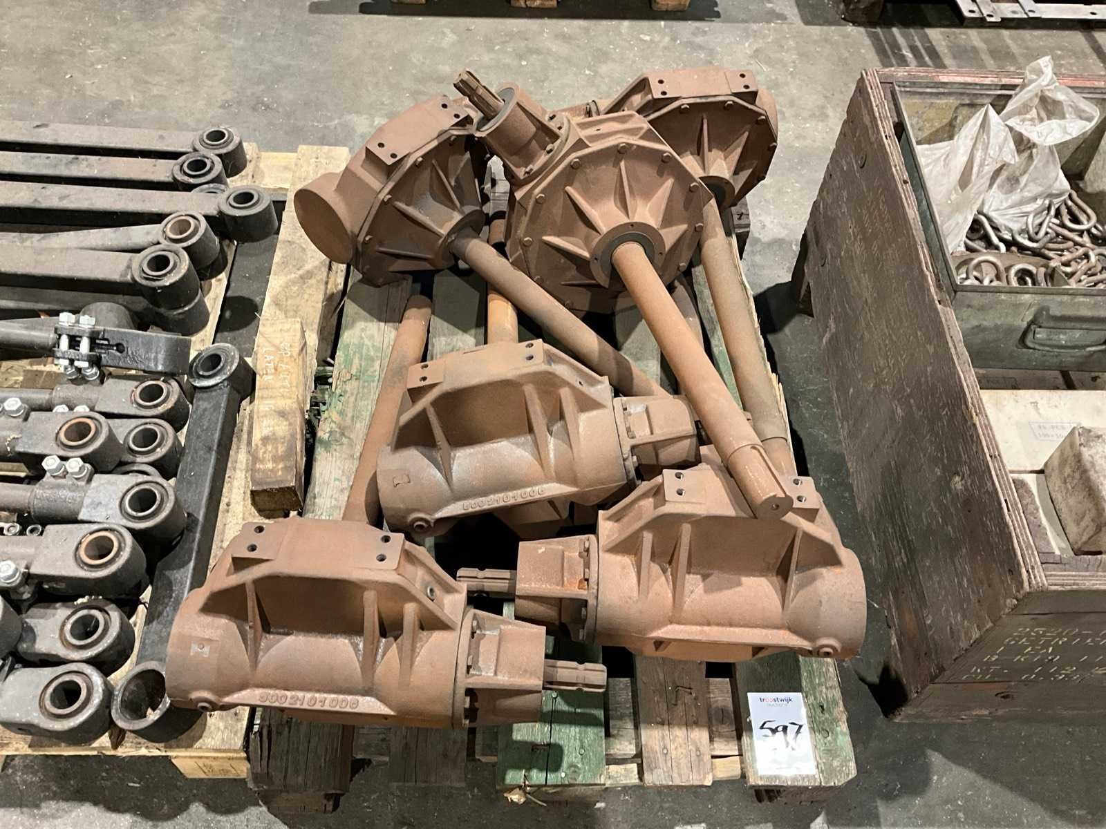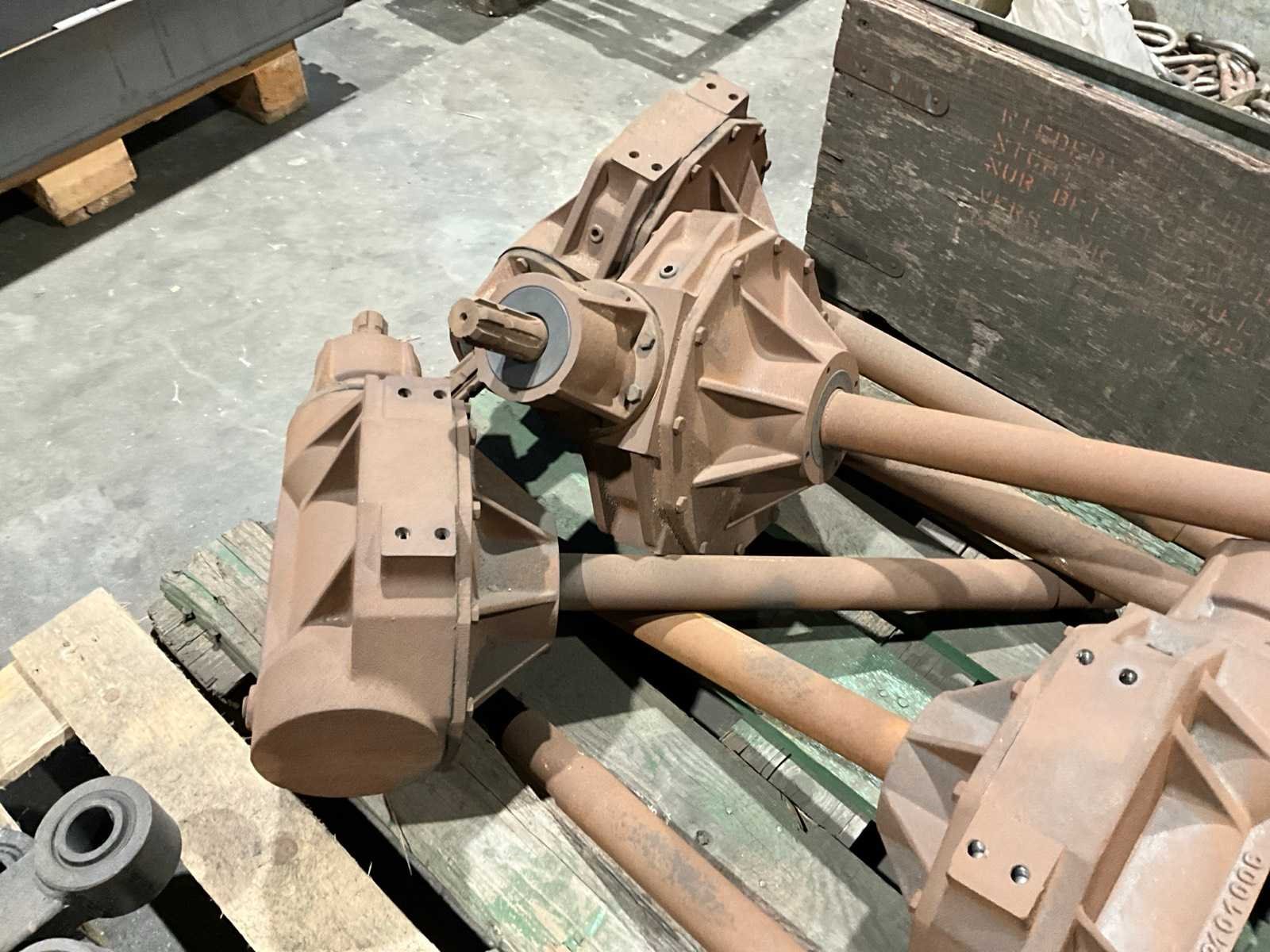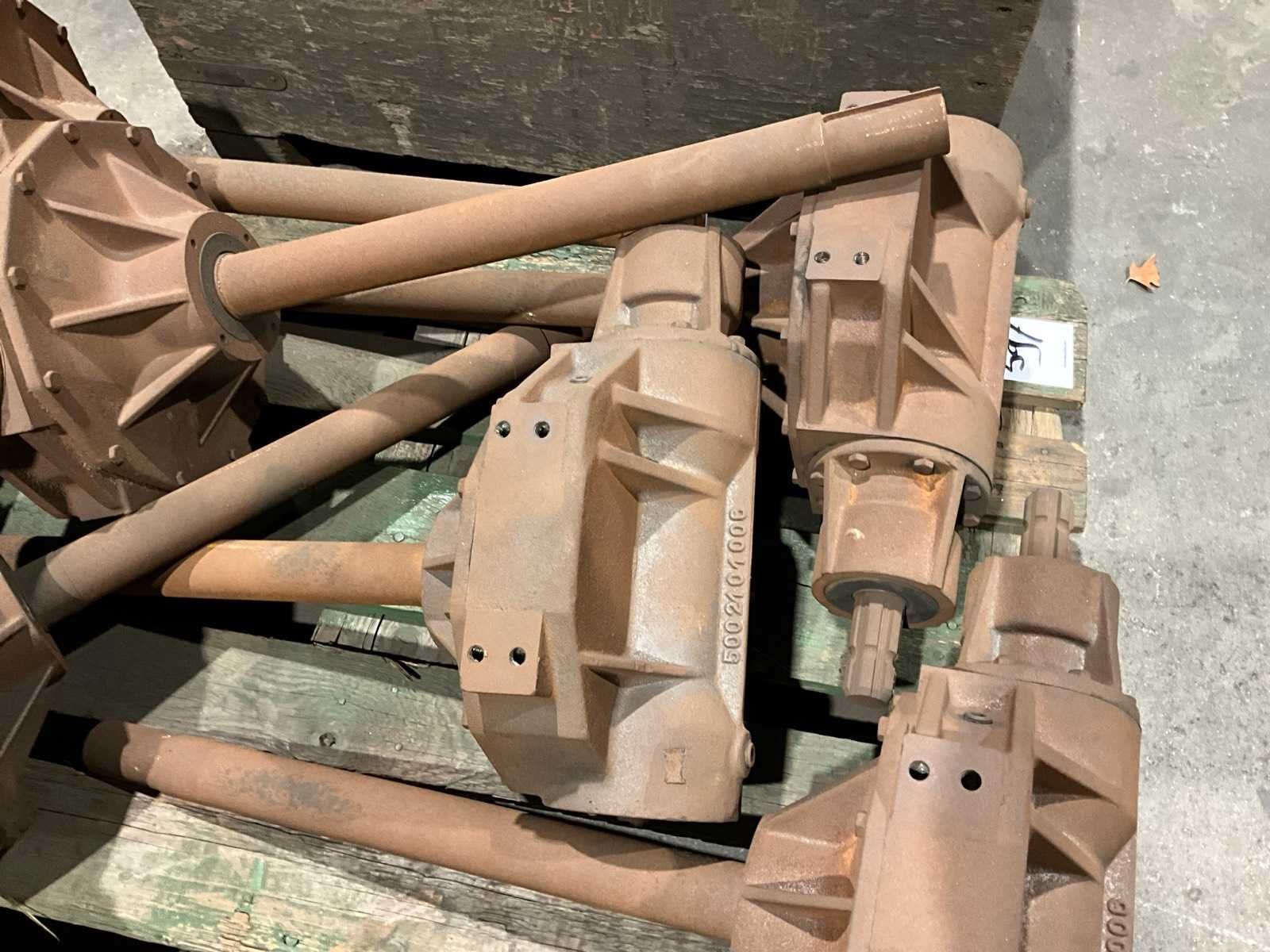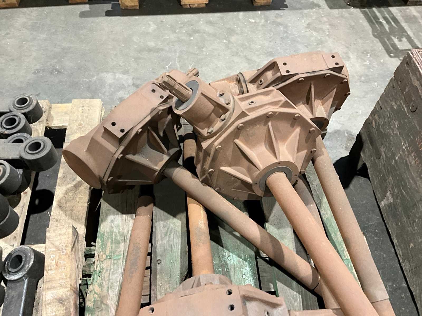 1 zijde met aftakas stomp, 1 zijde met lange as, as lengte 565 mm, totale afmeting 1 haakse overbrenging (lxb) 800x500 mm, alles op 1 pallet