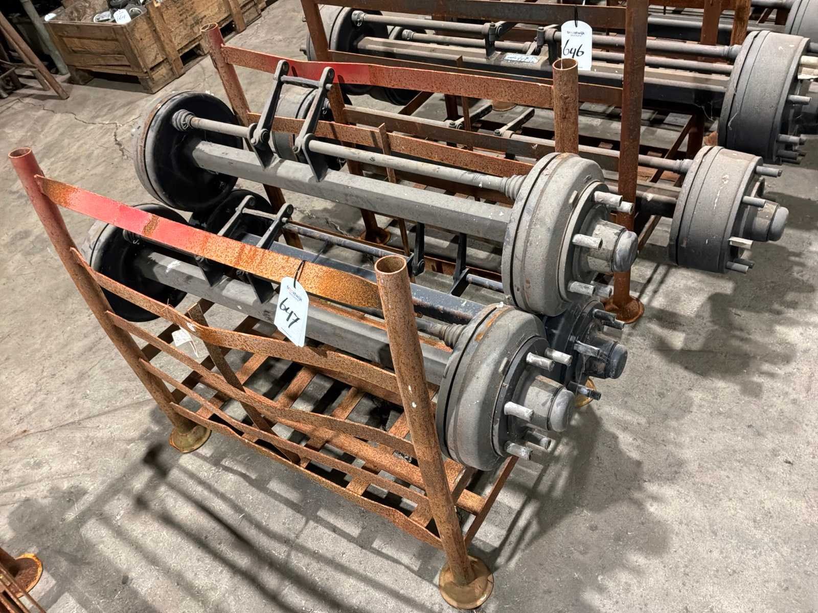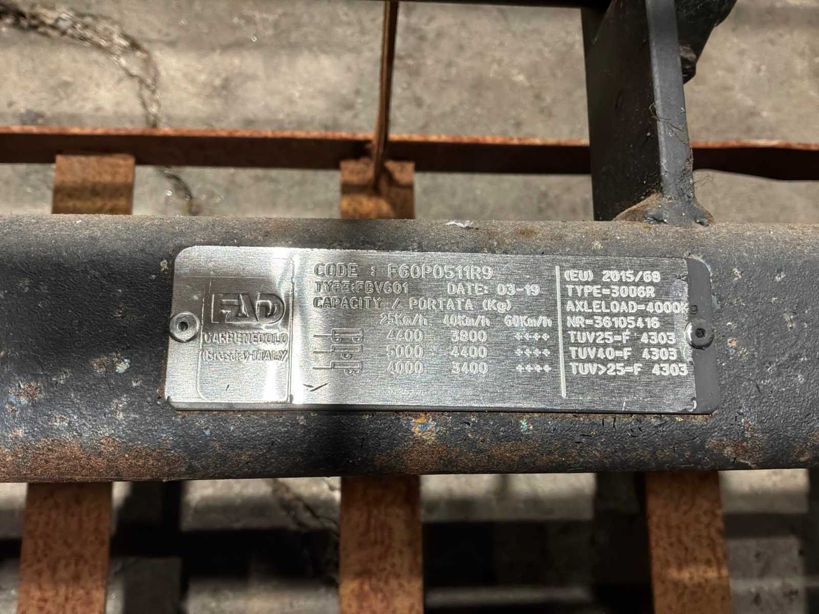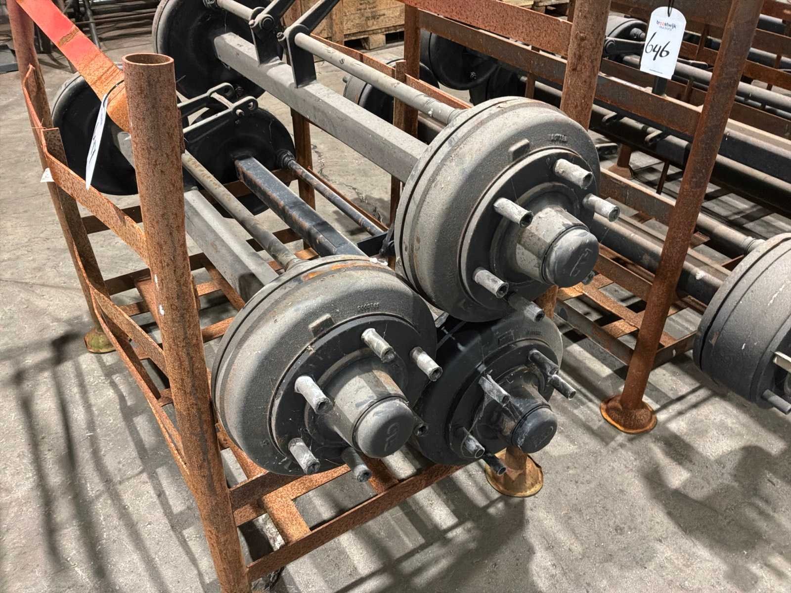 Totale breedte 1 as 1420 mm, 1 set van 3, remtrommel breedte 90 mm, 6 bouts/steek circa 200 mm, afstand tussen de remtrommels 1020 mm Merk: FAD Hefinrichting: true