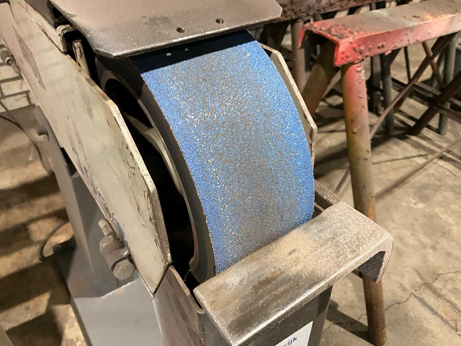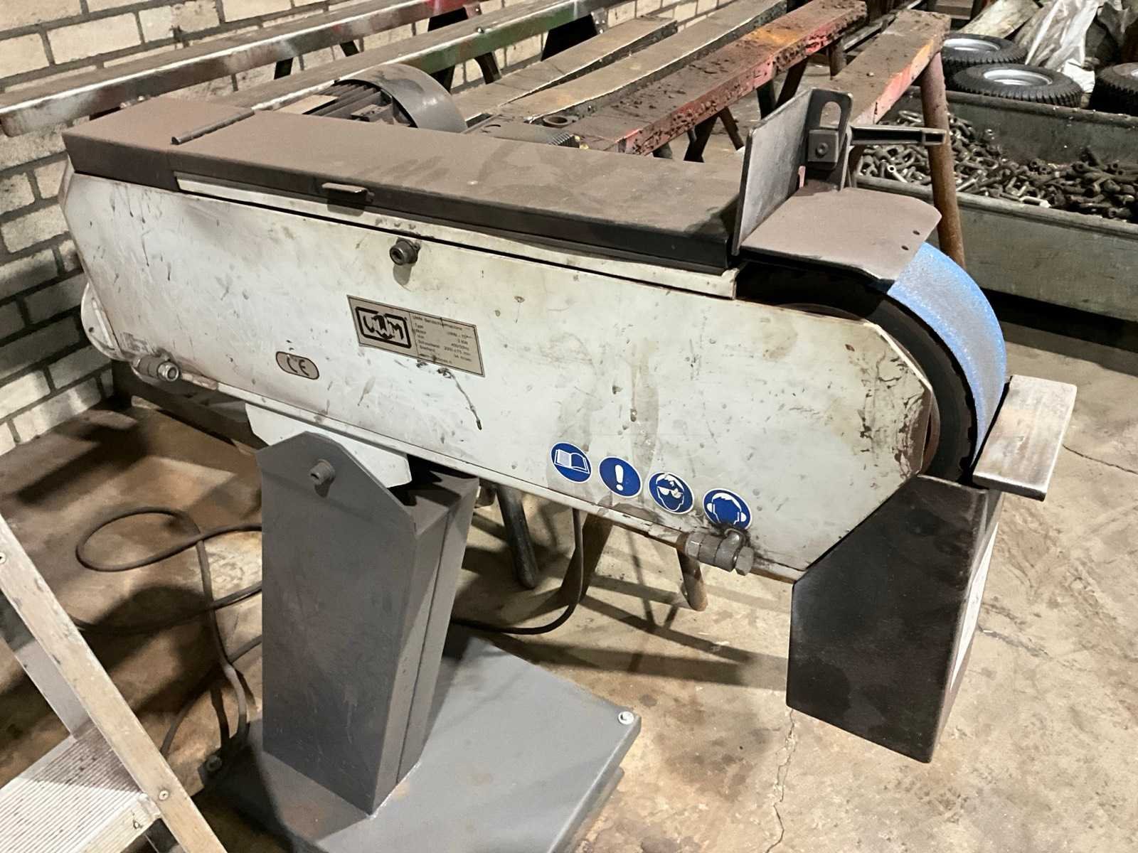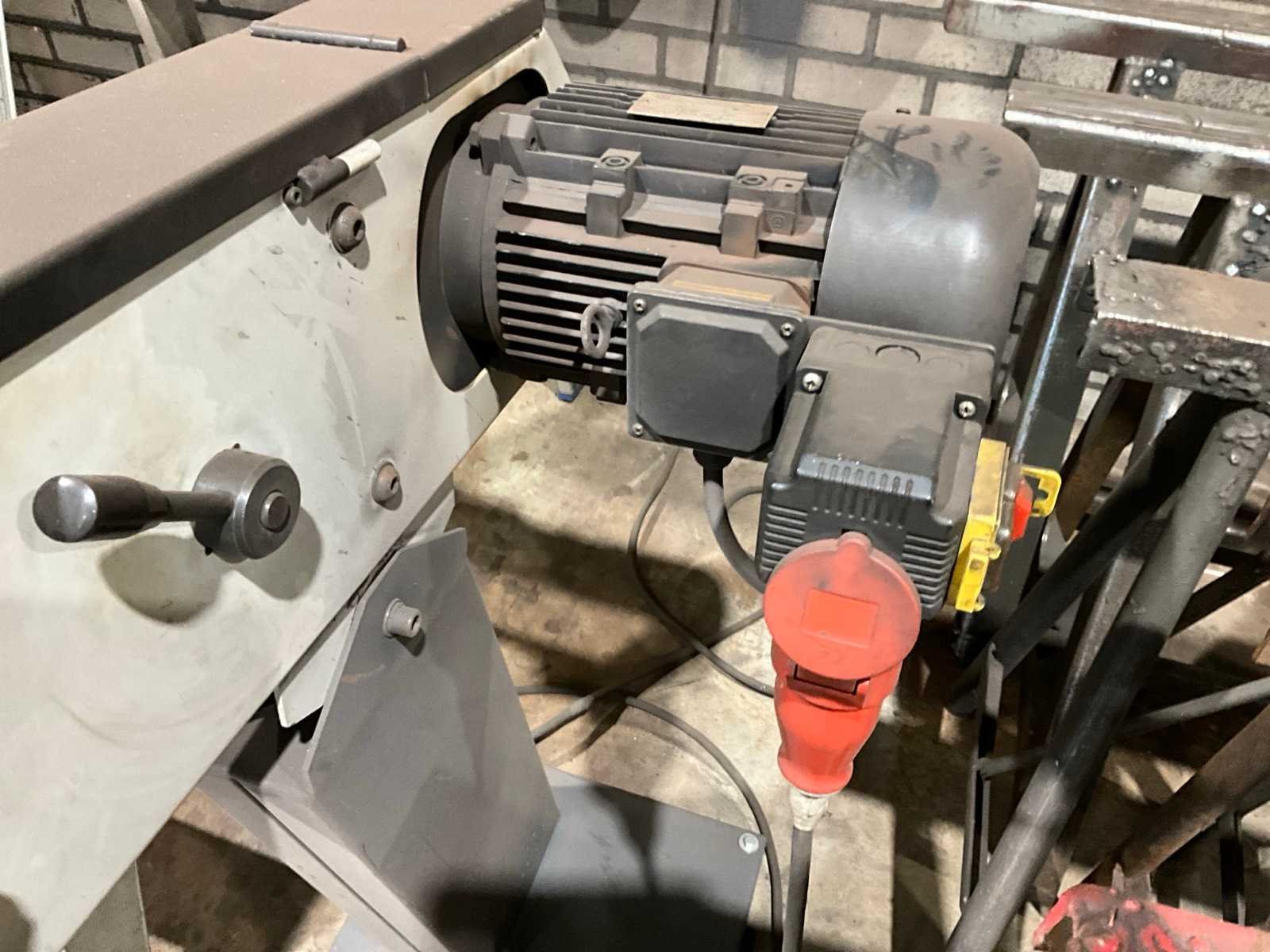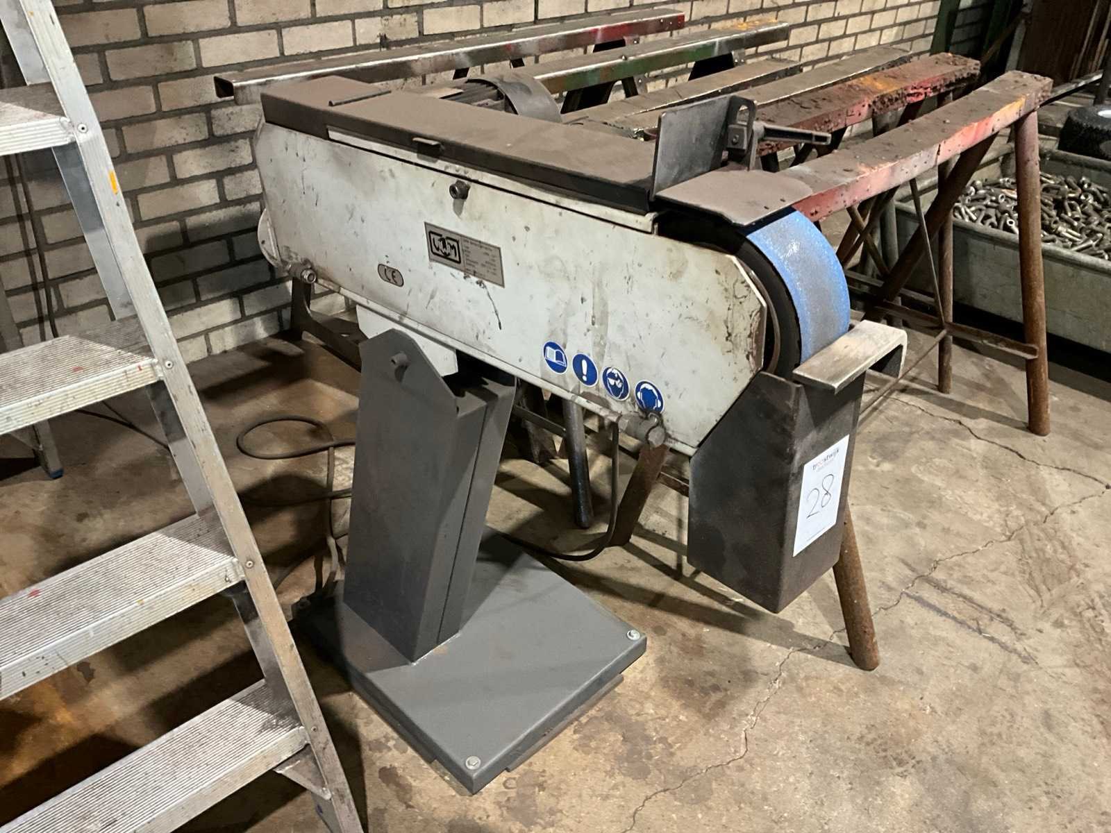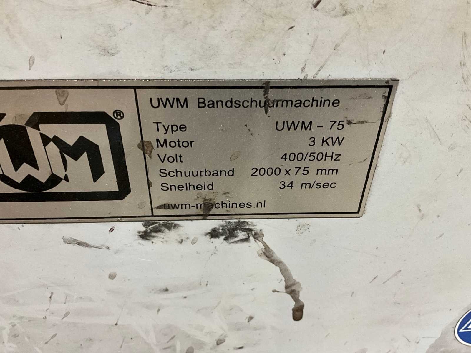 Voorzien van 2000x75 schuurband, hoogte verstelling, 34 m/sec schuursnelheid Merk: UWM Type: 75 Slijpsteen dikte: 75mm Motorvermogen (kW): 3kW Aansluiting: 400V Afmeting l: 1050mm Afmeting b: 500mm Afmeting h: 1100mm