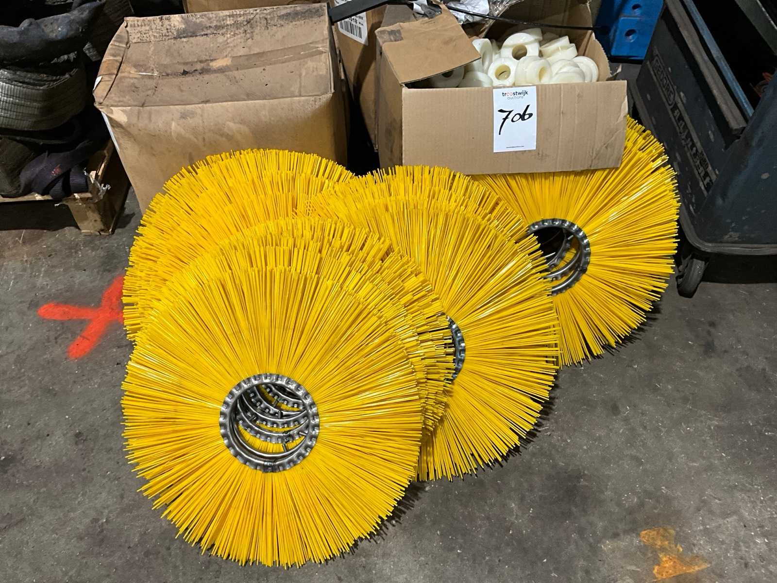 Onder andere rolbezem veeg elementen, diverse kunststof bussen, alles op en met pallet