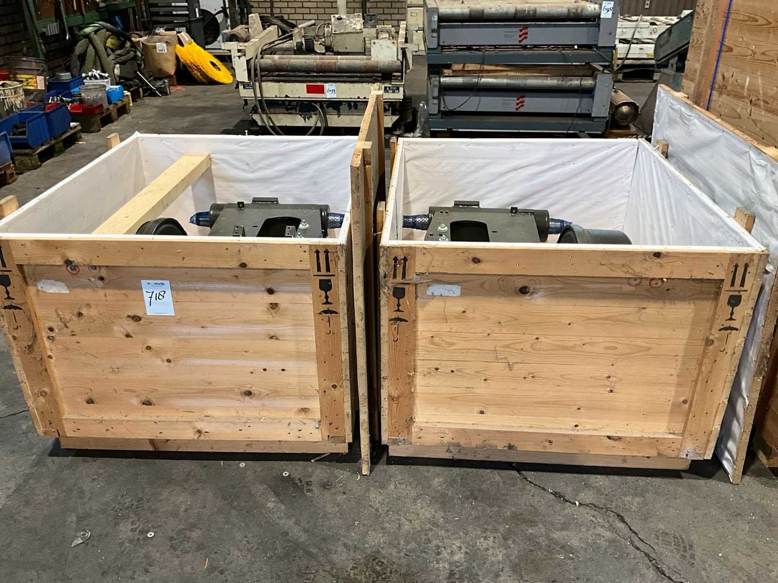 Betreft een ongebruikt product in 2 kisten, linker + rechter as, maximaal toegelaten snelheid 105 km/h, remtrommel dikte 160 mm, 8 bouts/steek circa 275 mm, afmeting 1 as ophanging (LxB) 950x850 mm, Foto’s zijn genomen van 1 set Merk: BPW Model: RS ST 5500