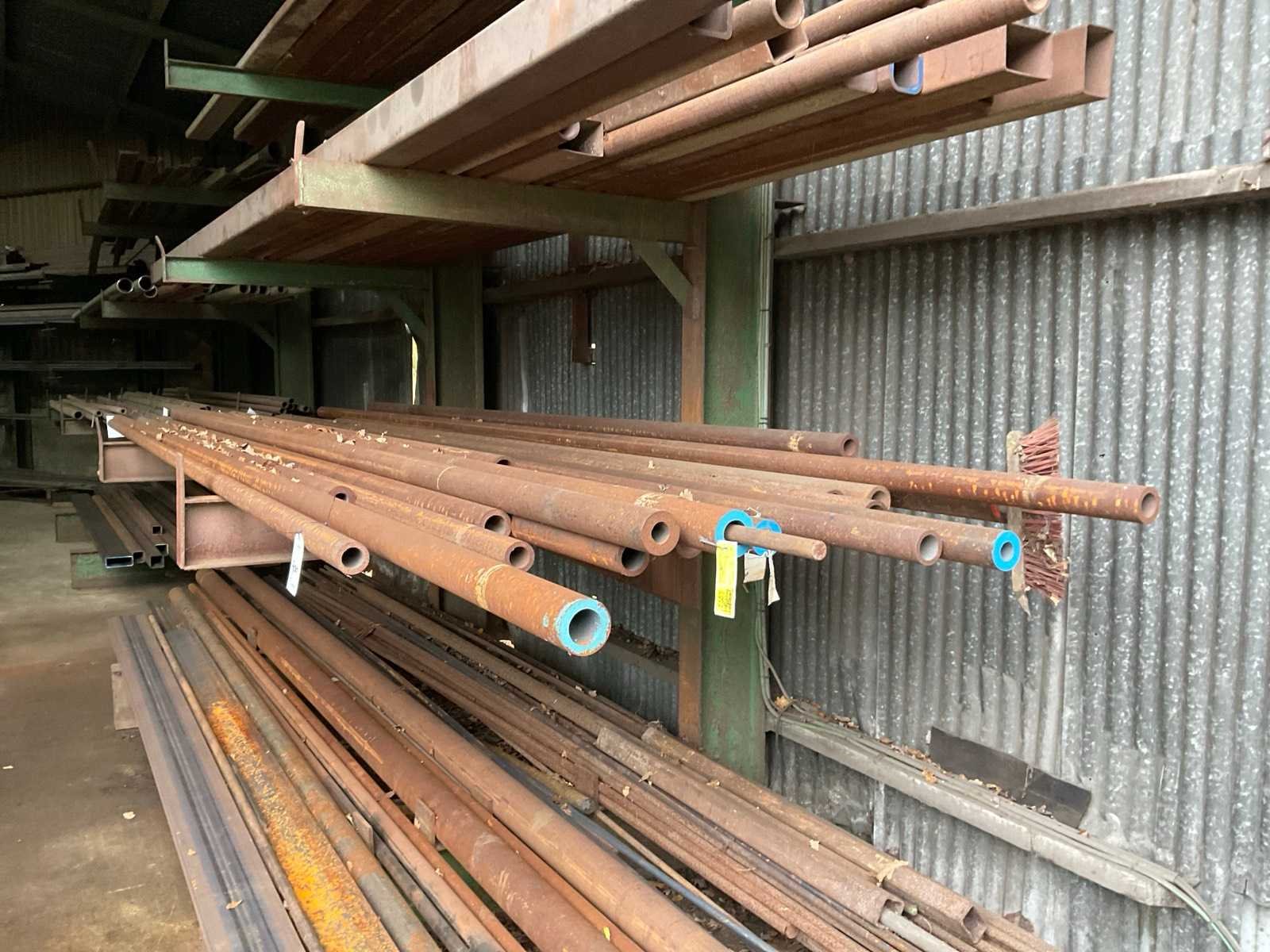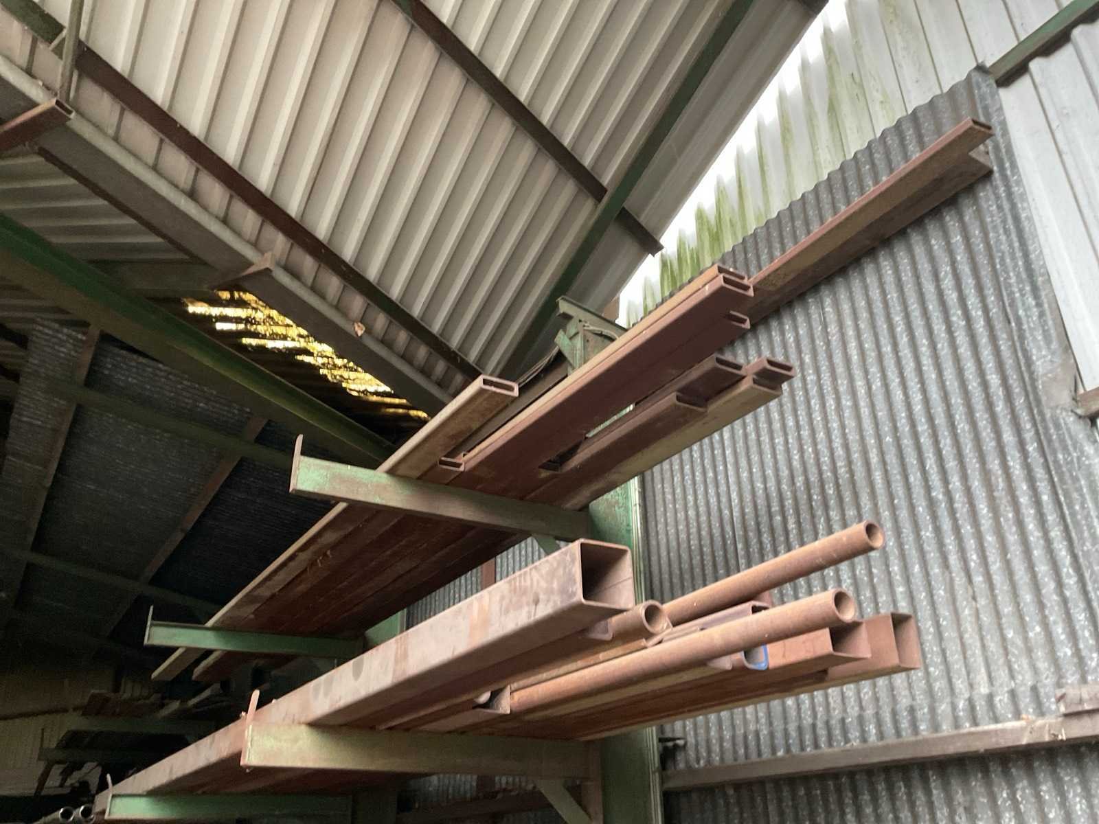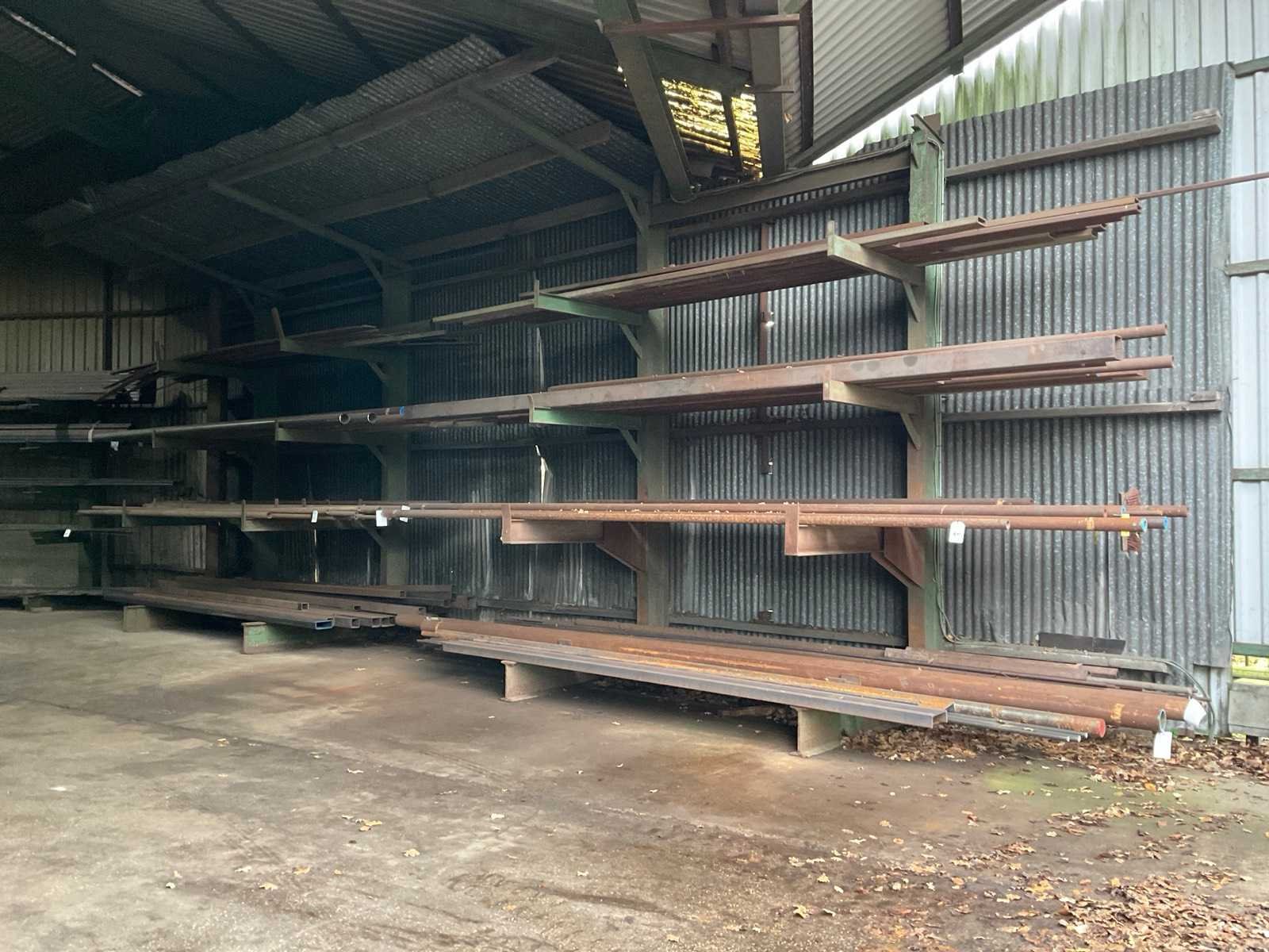 Betreft inhoud 2x 4 etages 1-zijdige draagarmstelling, waaronder naadloos rond 82.5x17.5mm L6698mm, naadloos rond 133x12.5mm L7700mm, naadloos rond 133x12.5mm L7000mm, 82.5x17.5mm, 76.1x12.5mm, divers rondstaal, U-profiel, kokers, strips, etc.