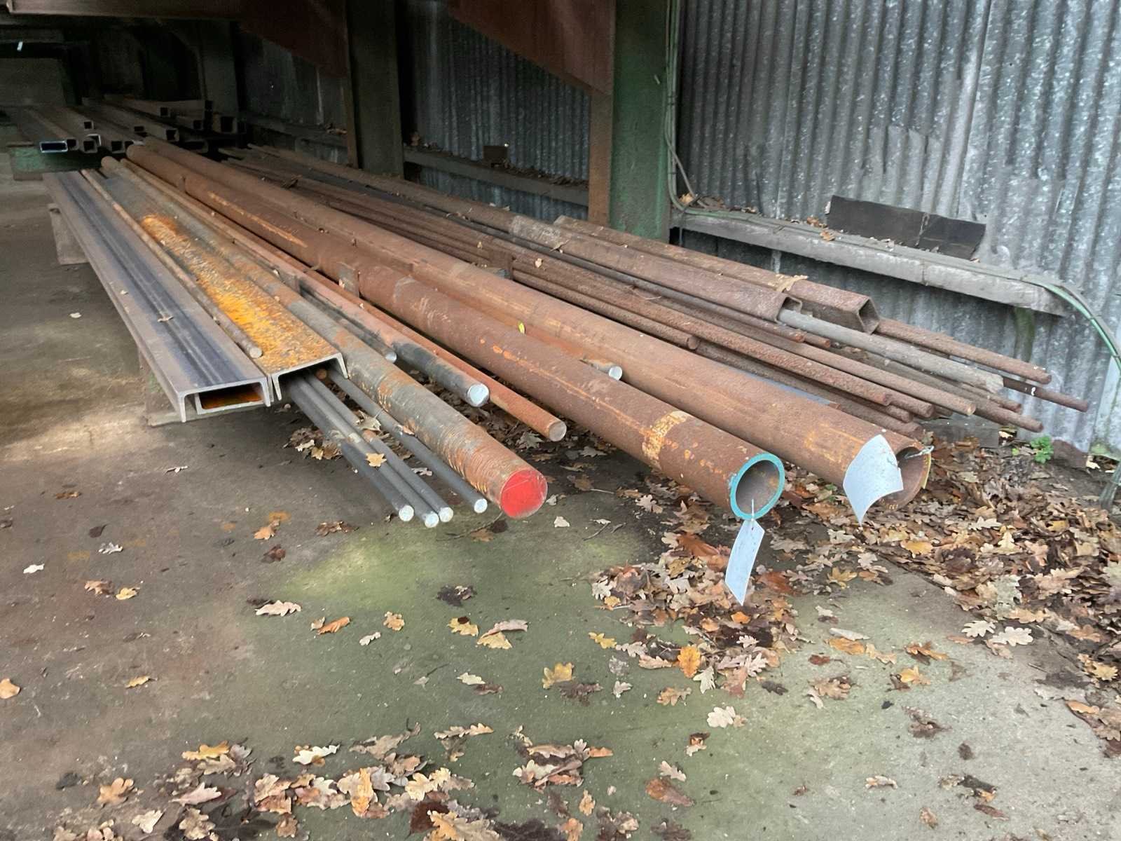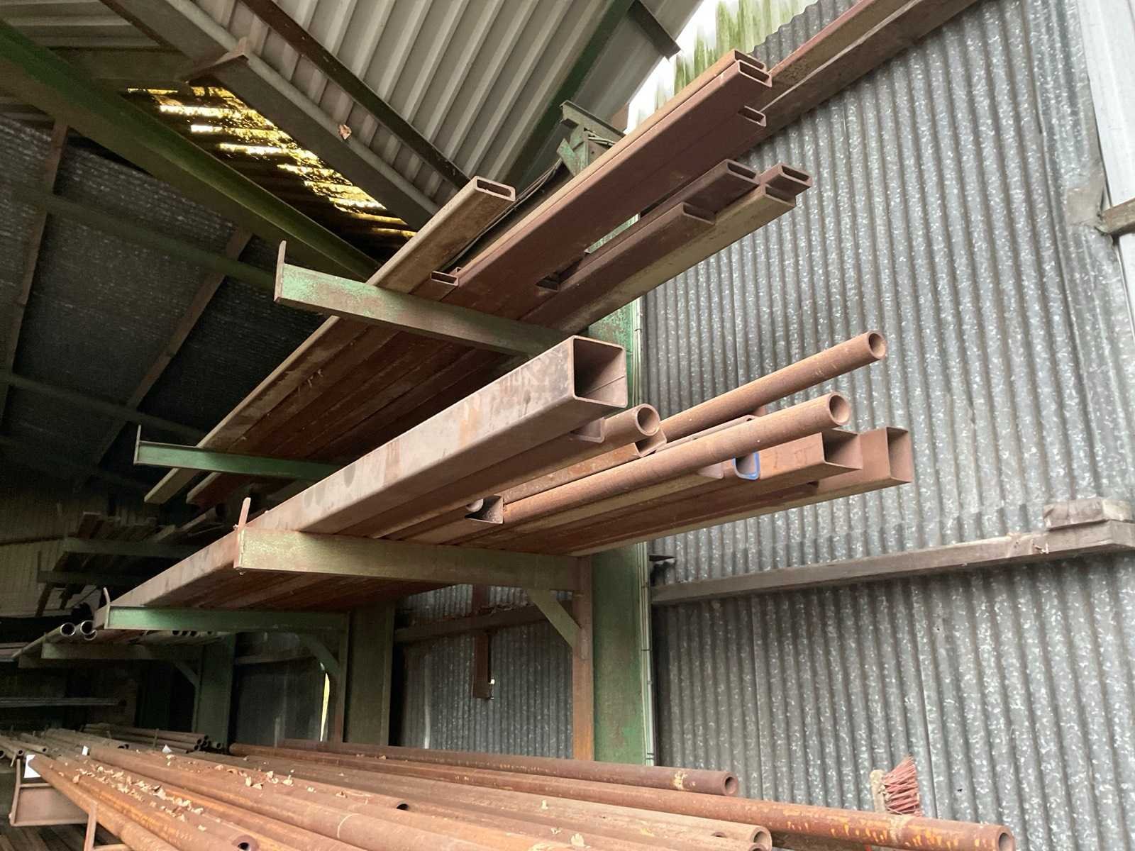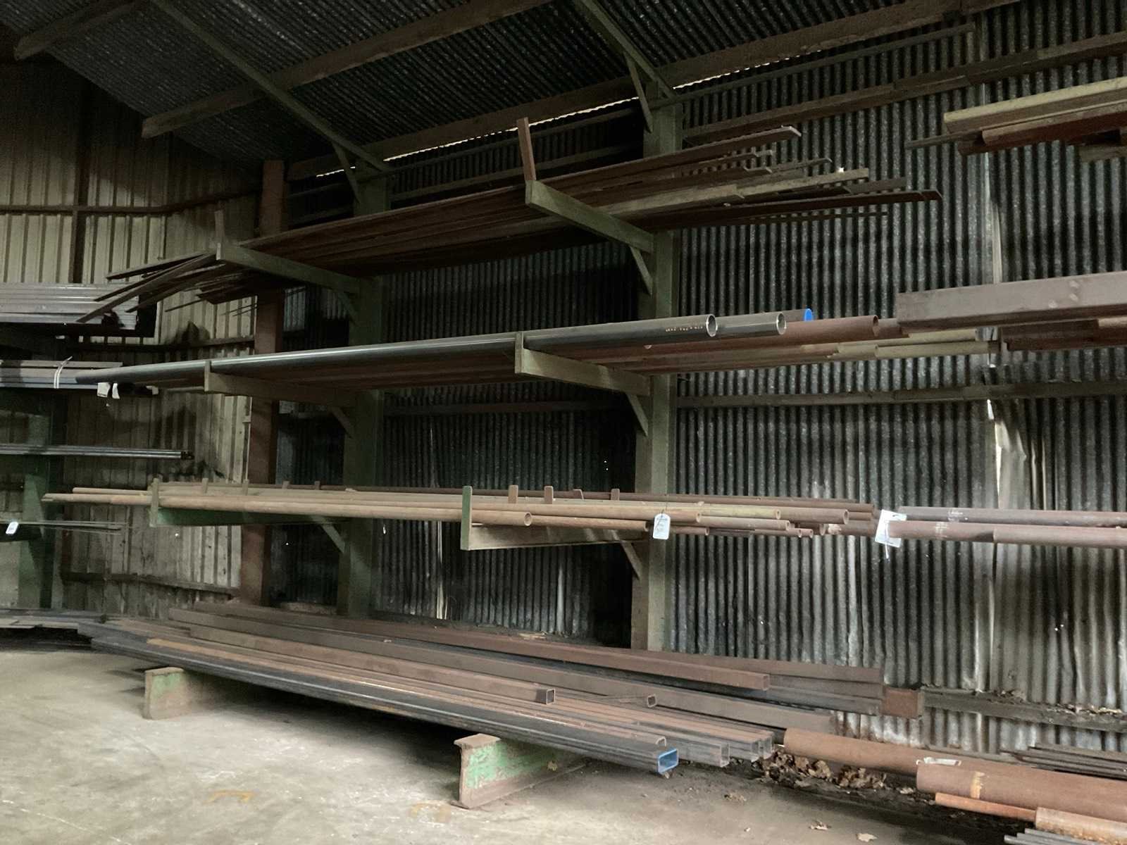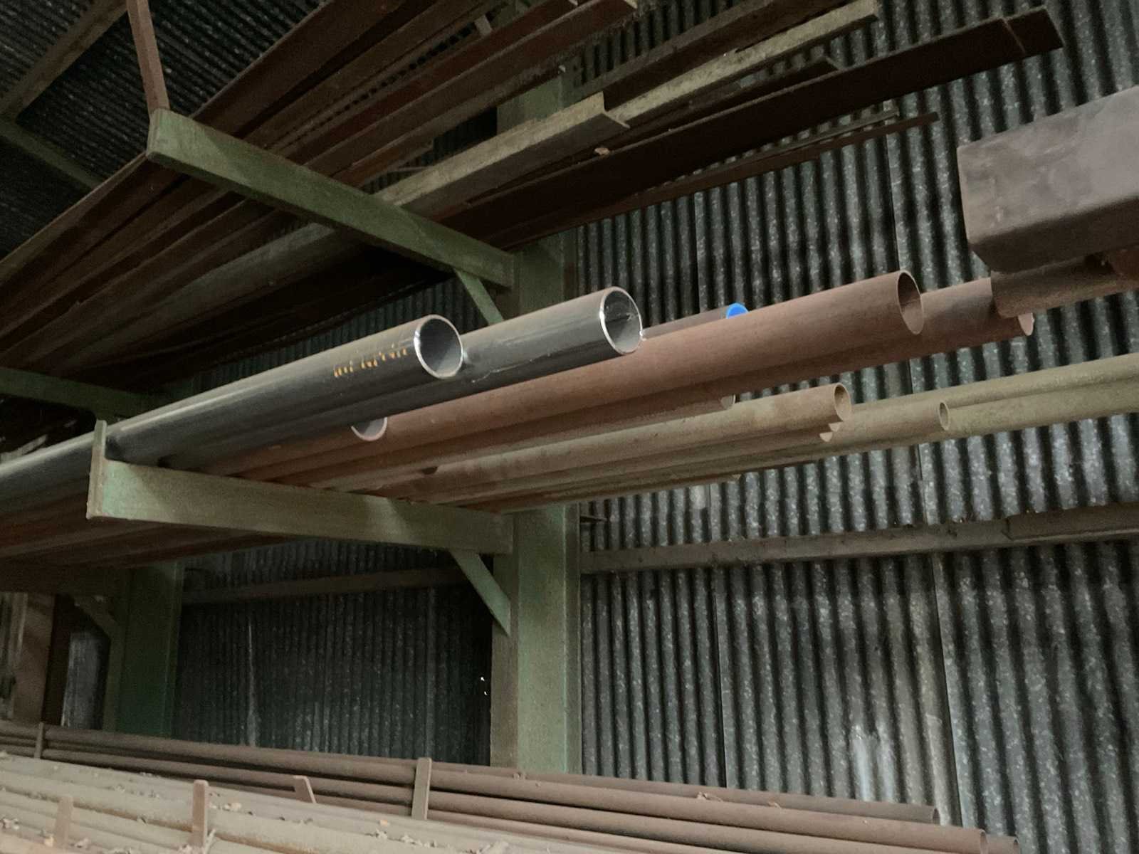 Betreft inhoud 2x 4 etages 1-zijdige draagarmstelling, waaronder naadloos rond 82.5x17.5mm L6698mm, naadloos rond 133x12.5mm L7700mm, naadloos rond 133x12.5mm L7000mm, 82.5x17.5mm, 76.1x12.5mm, divers rondstaal, U-profiel, kokers, strips, etc.