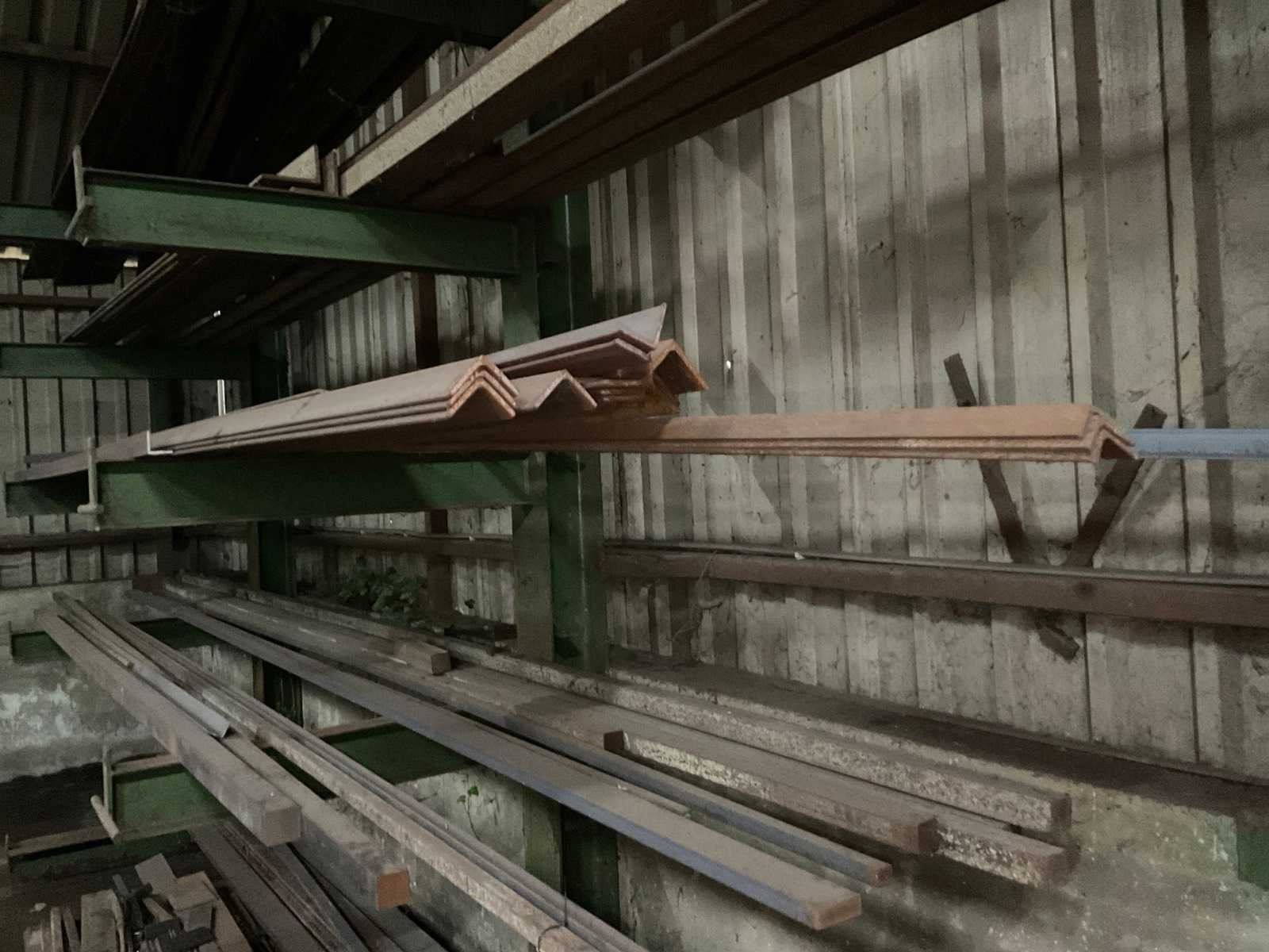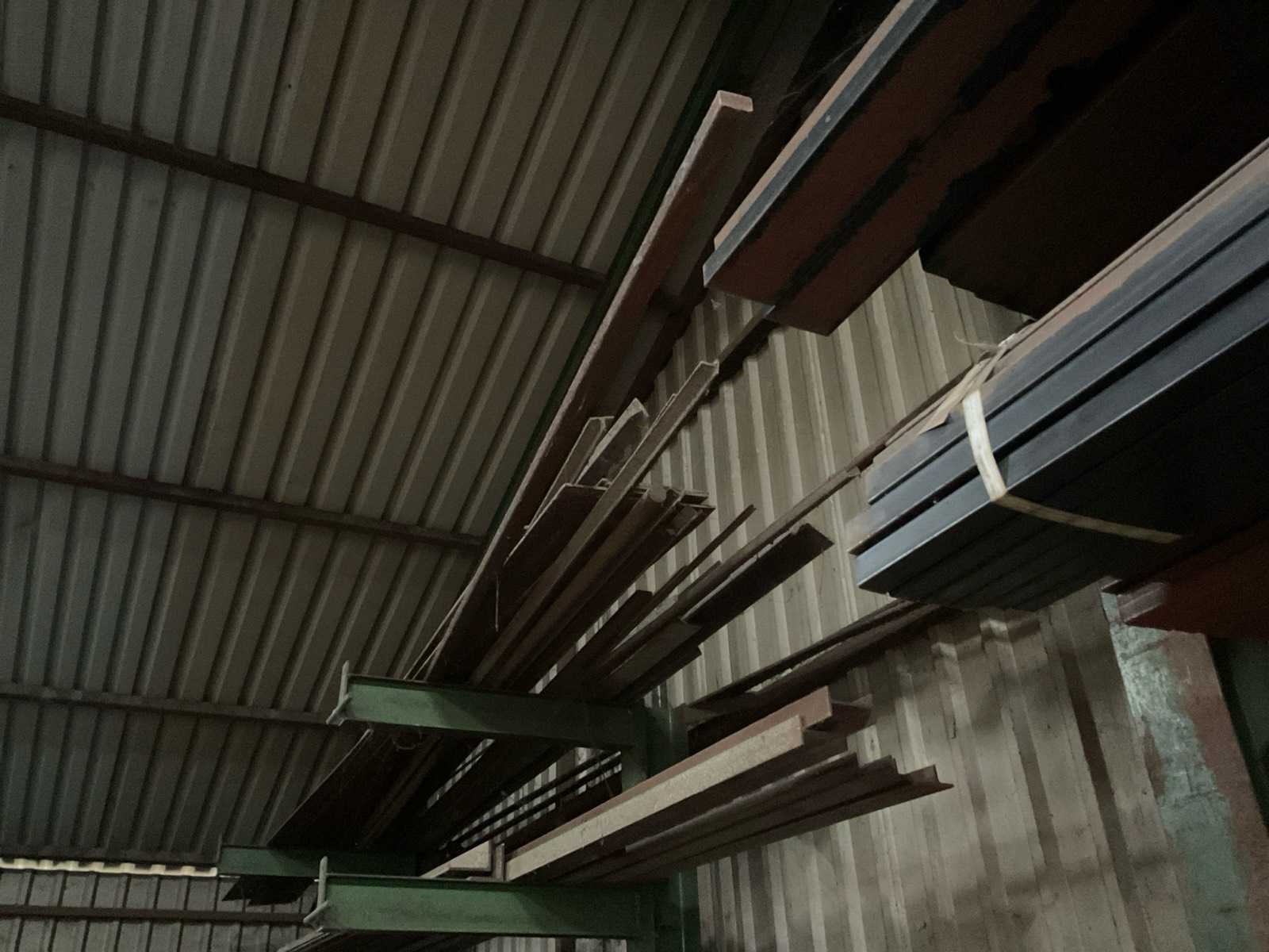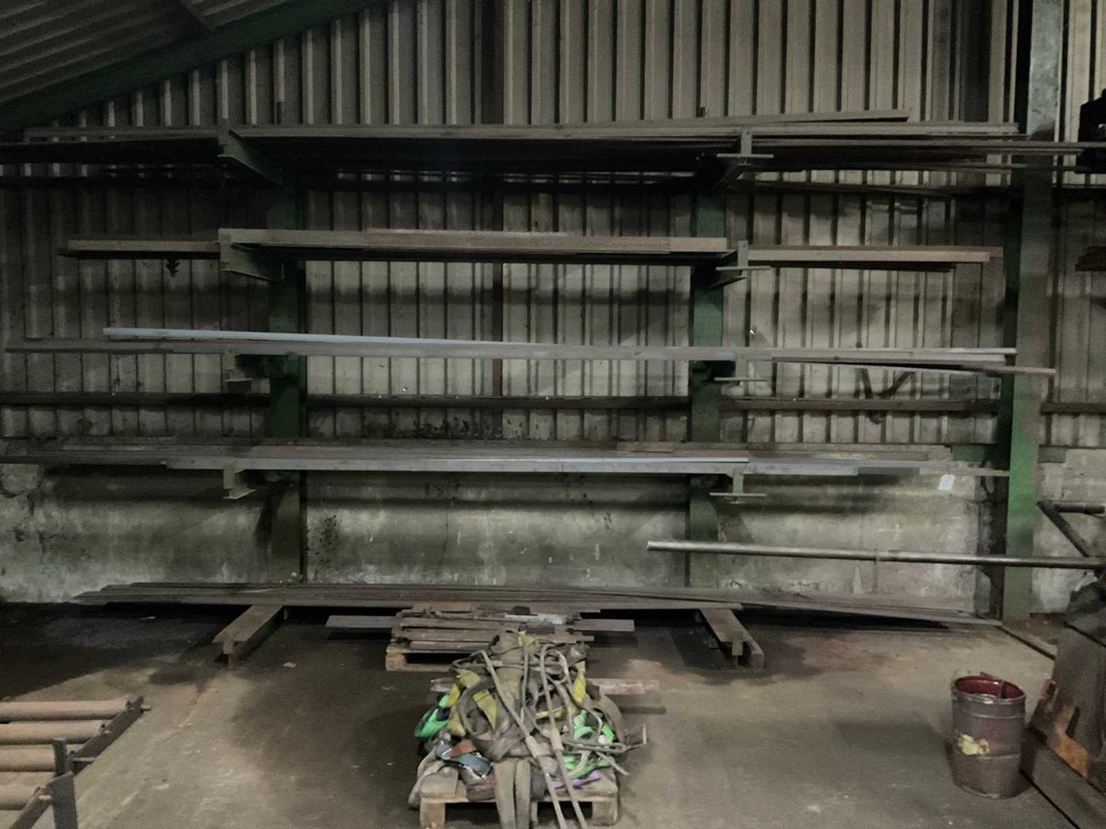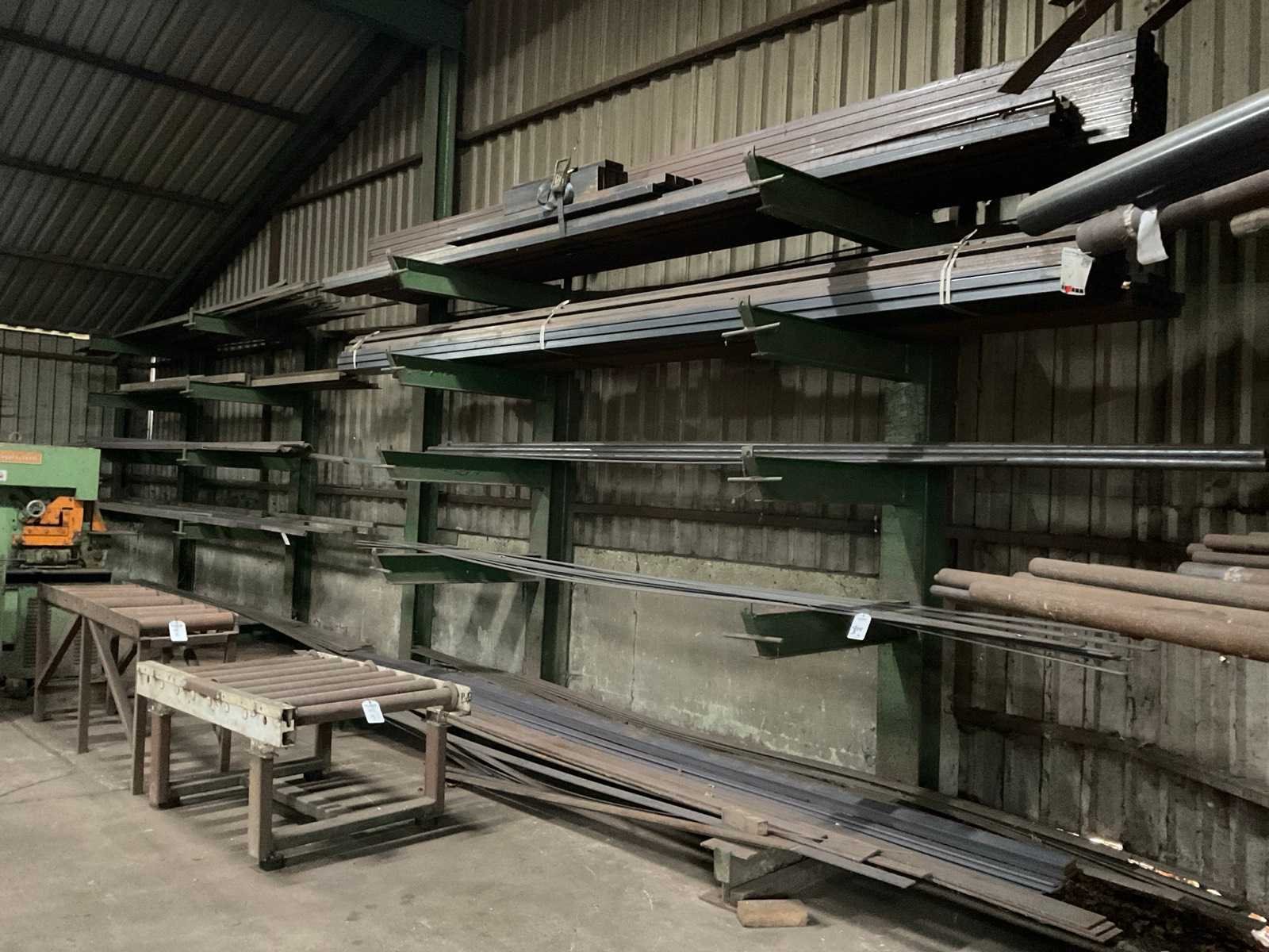 Betreft inhoud 2x 5 etages 1-zijdige draagarmstelling, waaronder strips, vierkant staal, buizen, hoekprofielen, H-profielen, etc