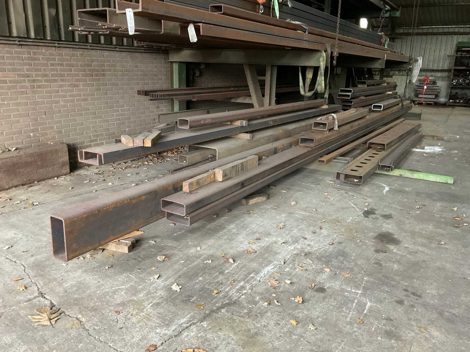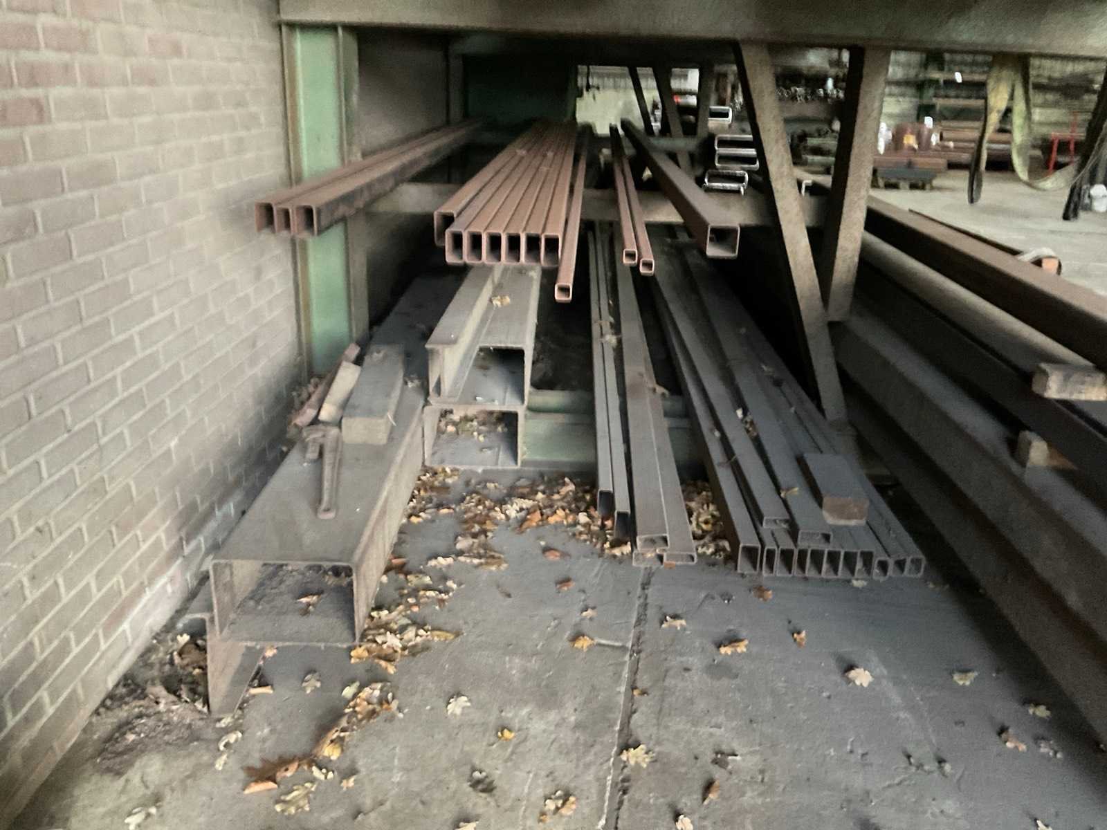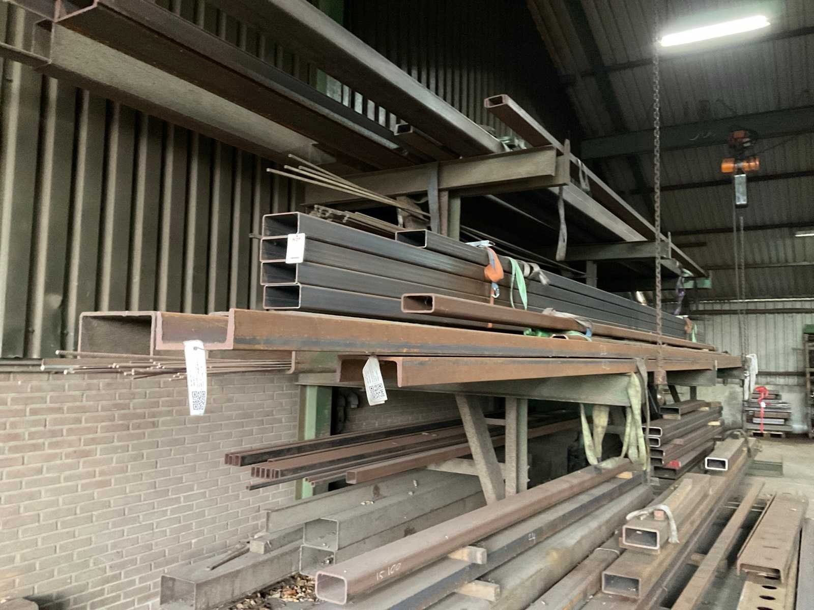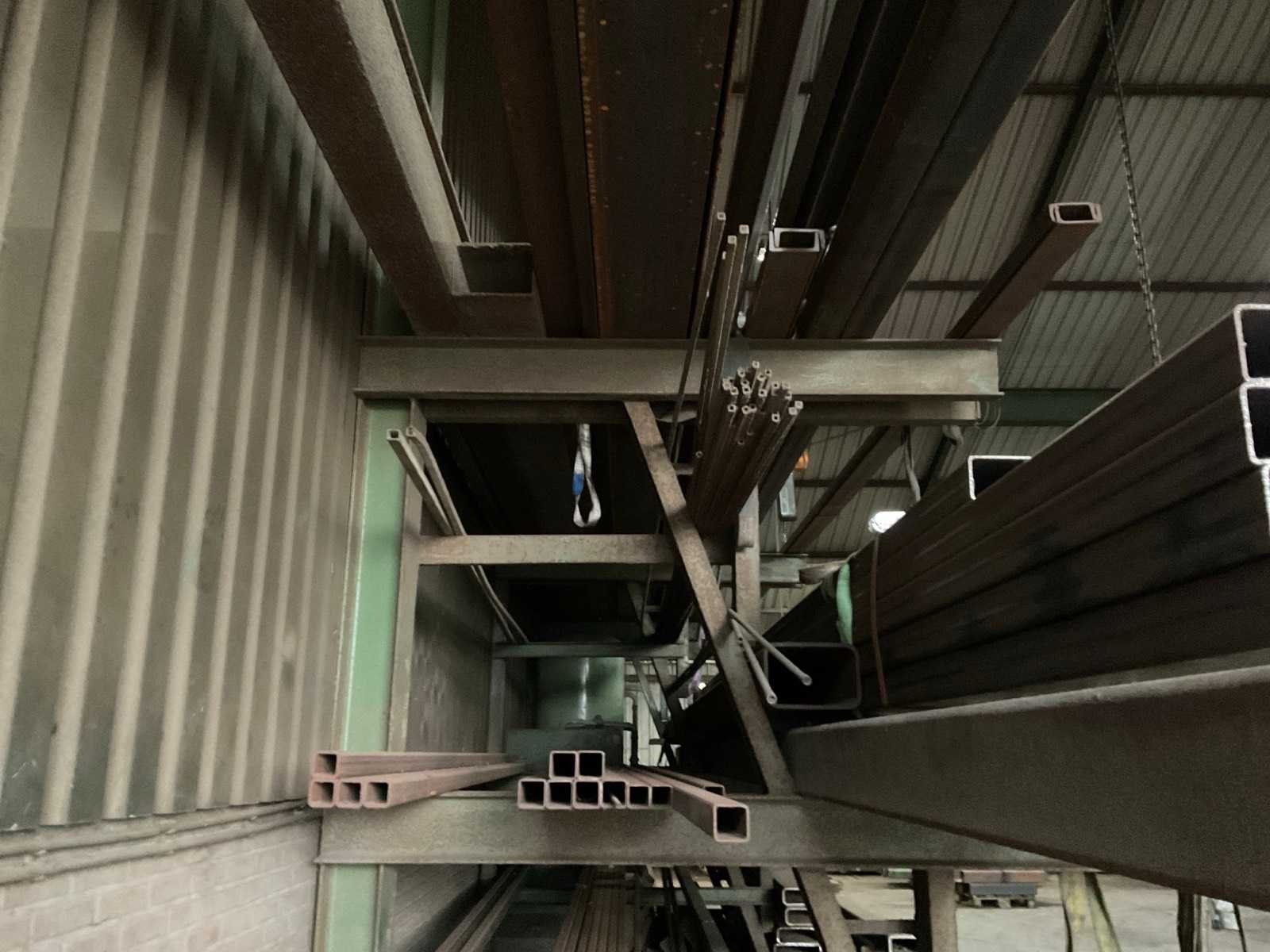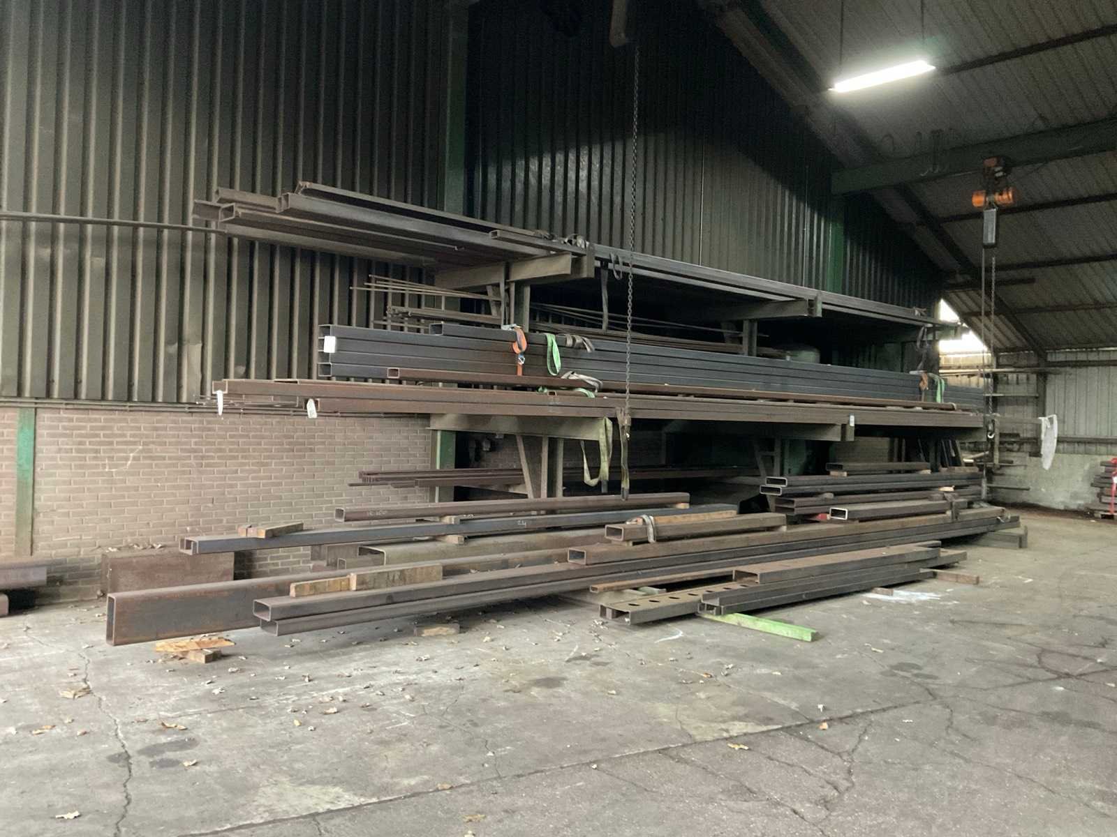 Betreft inhoud 1x 3-etages 1-zijdige draagarmstelling, waaronder buizen, kokers, U-profielen, UNP balk 180mm L12000mm, UNP balk 220mm L14000mm, stafmateriaal, kokers 200x100x5mm L12000mm, etc
