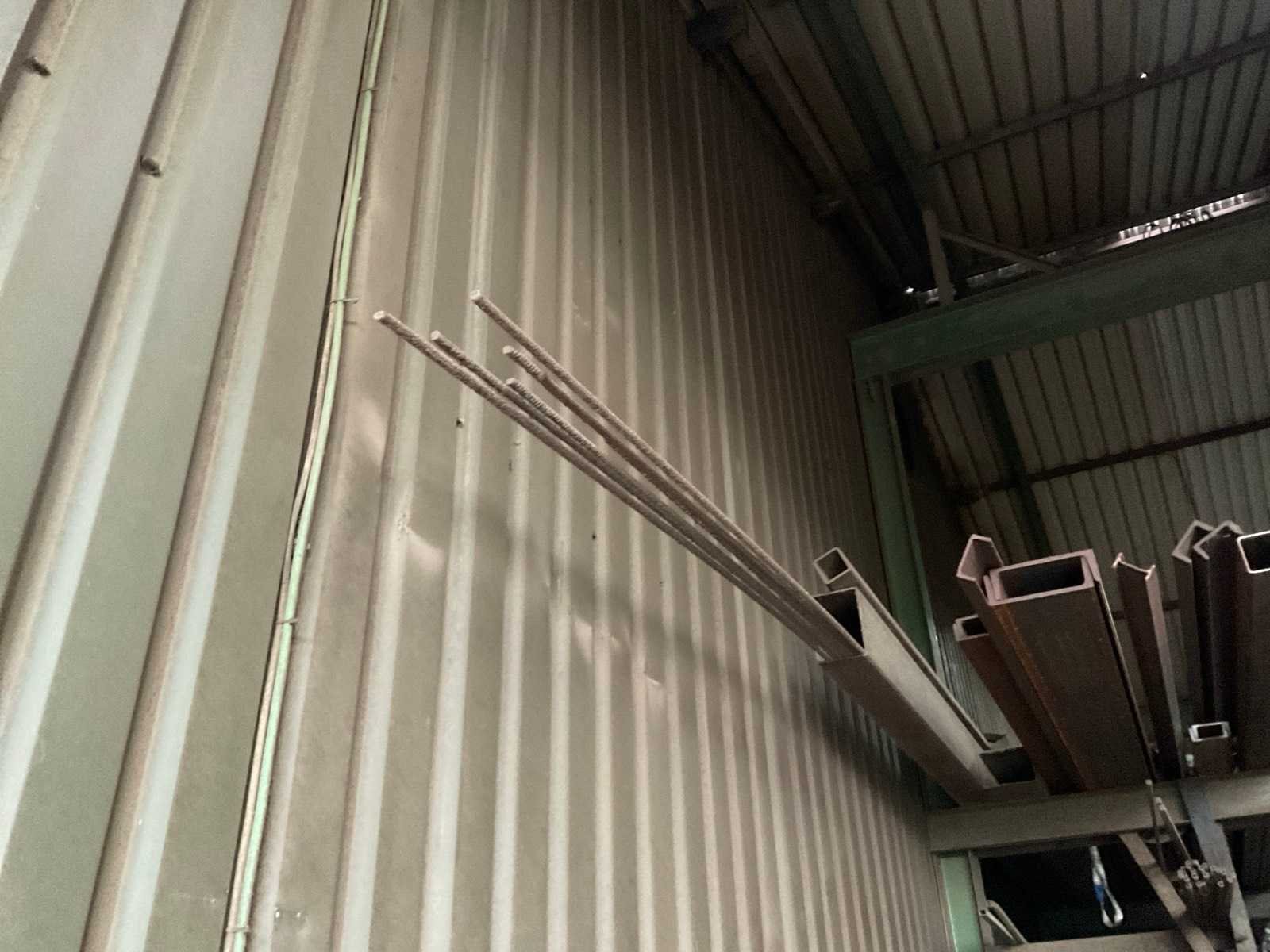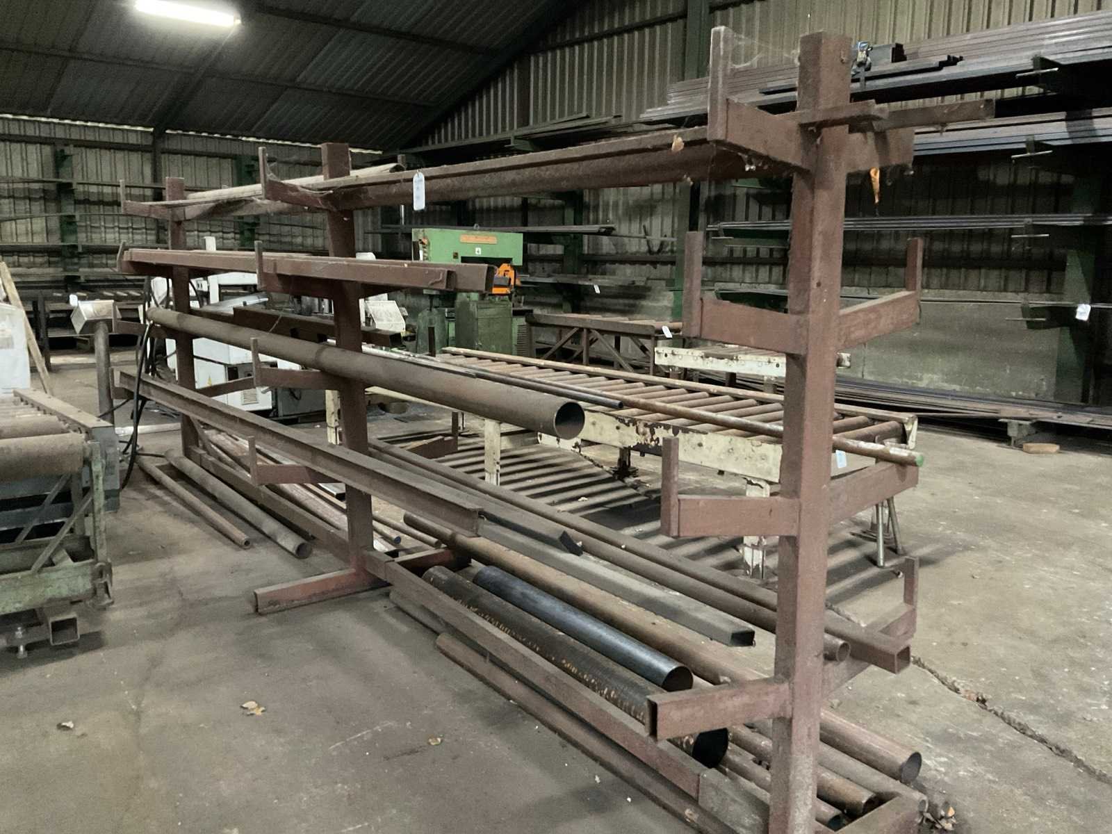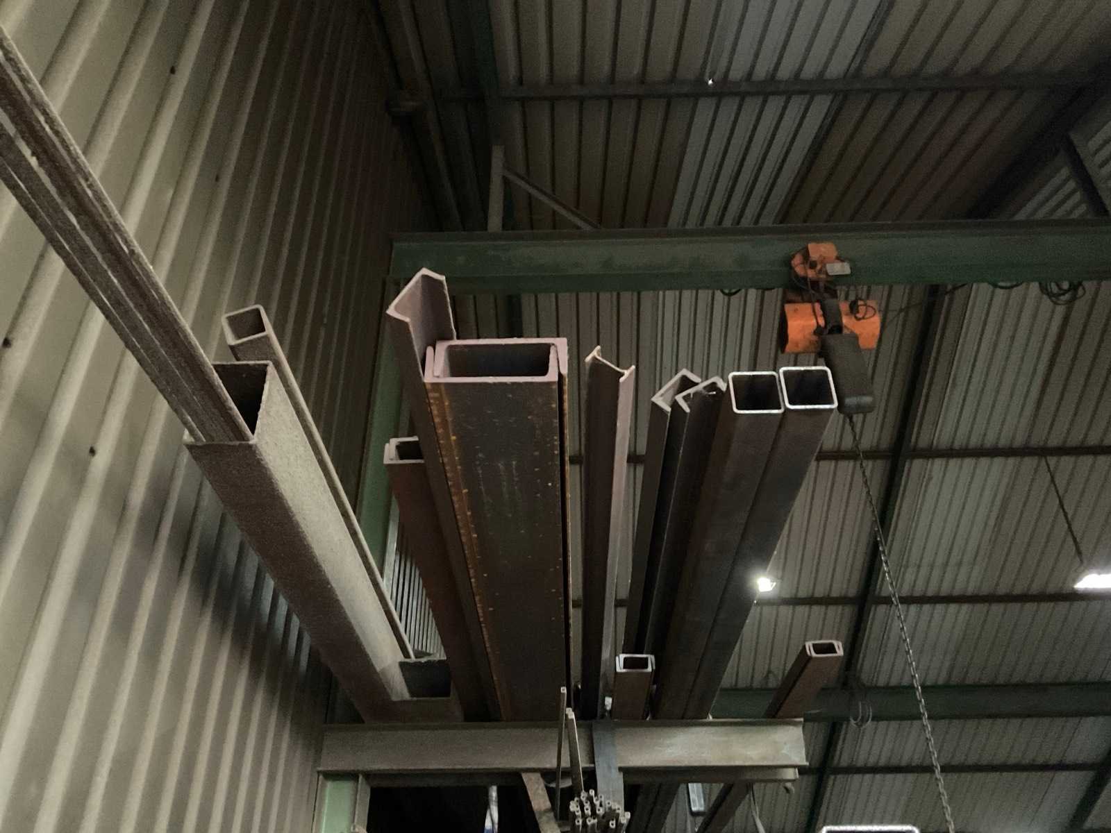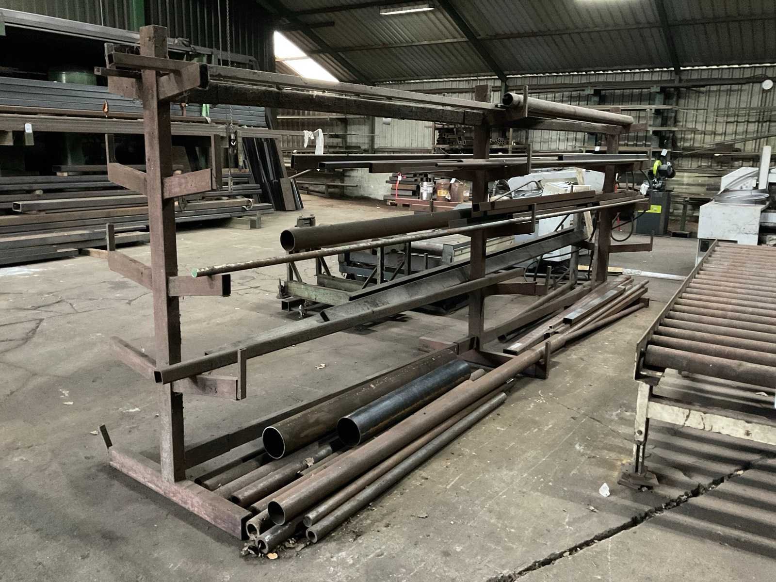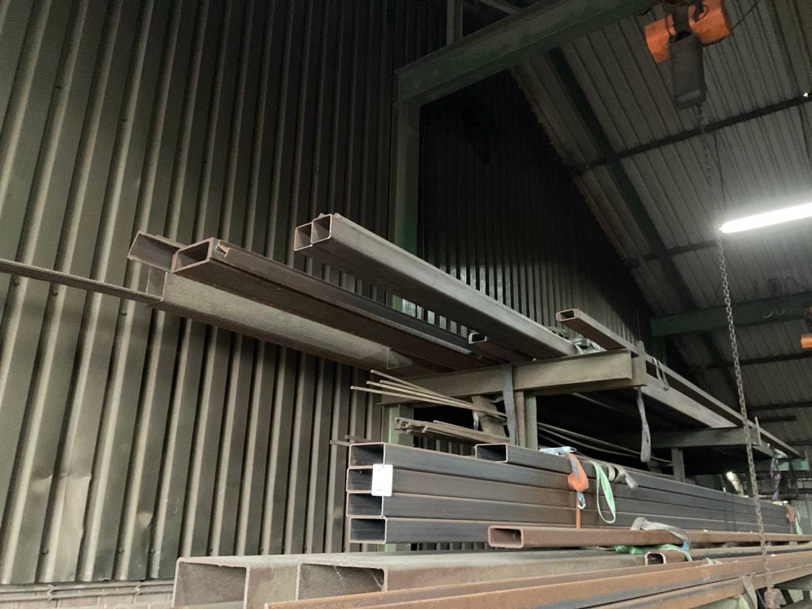 Betreft inhoud 1x 3-etages 1-zijdige draagarmstelling, waaronder buizen, kokers, U-profielen, UNP balk 180mm L12000mm, UNP balk 220mm L14000mm, stafmateriaal, kokers 200x100x5mm L12000mm, etc