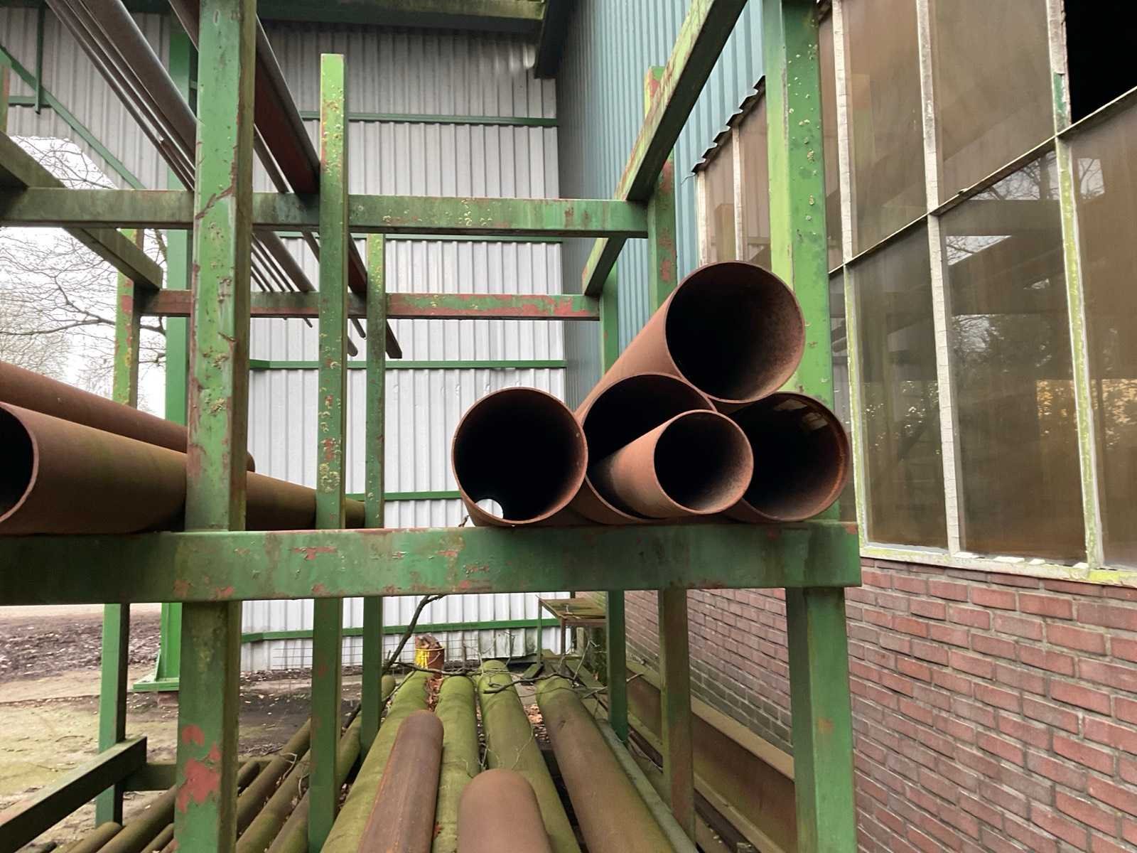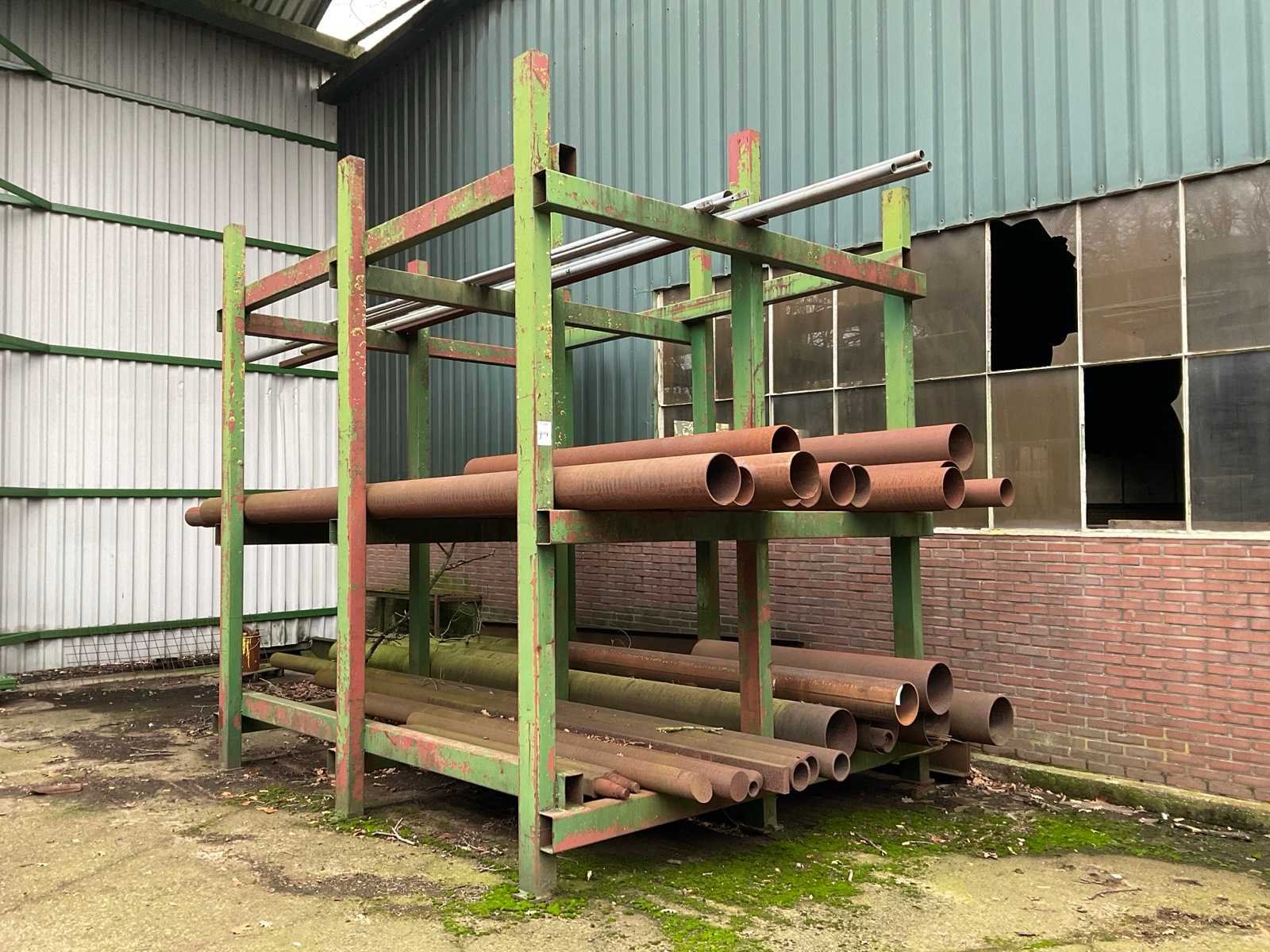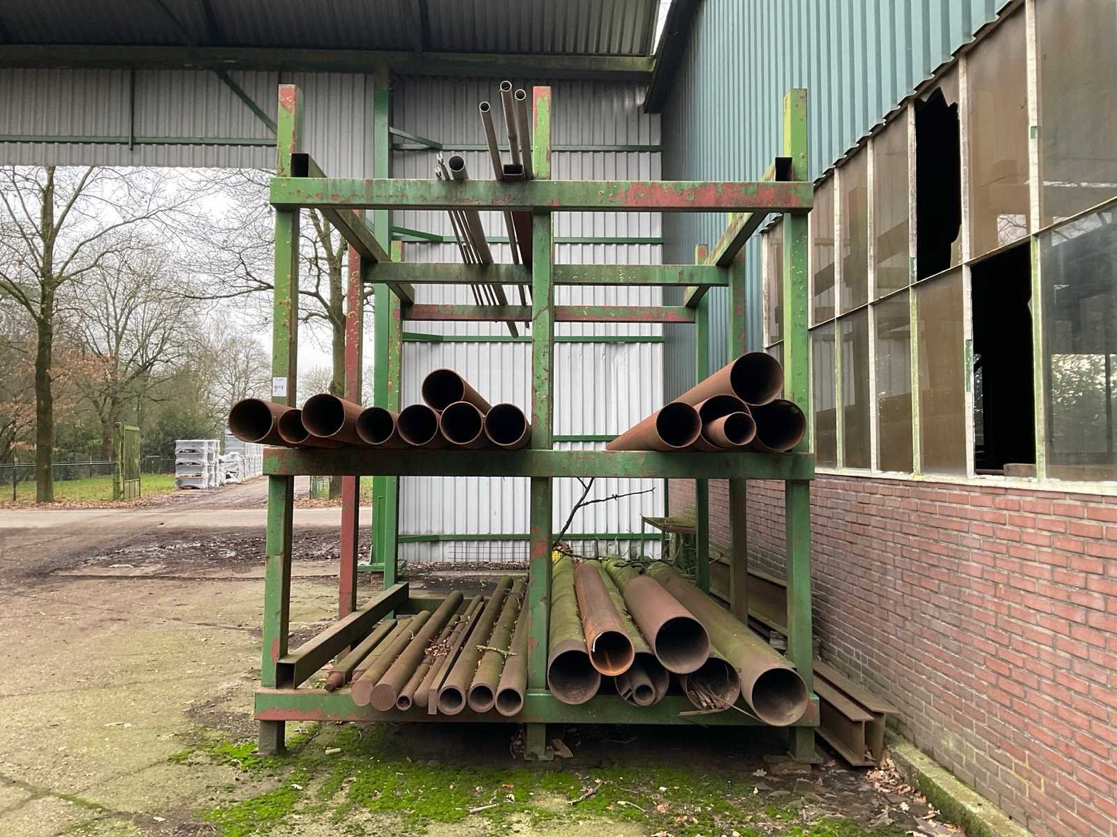 Betreft inhoud stafmateriaalstelling, waaronder buizen ø van 115mm tot circa 260mm, lengte tot circa 6500mm, rondstaal, etc. Inclusief gelaste stafmateriaalstelling afmeting lxbxh 380x300x370cm