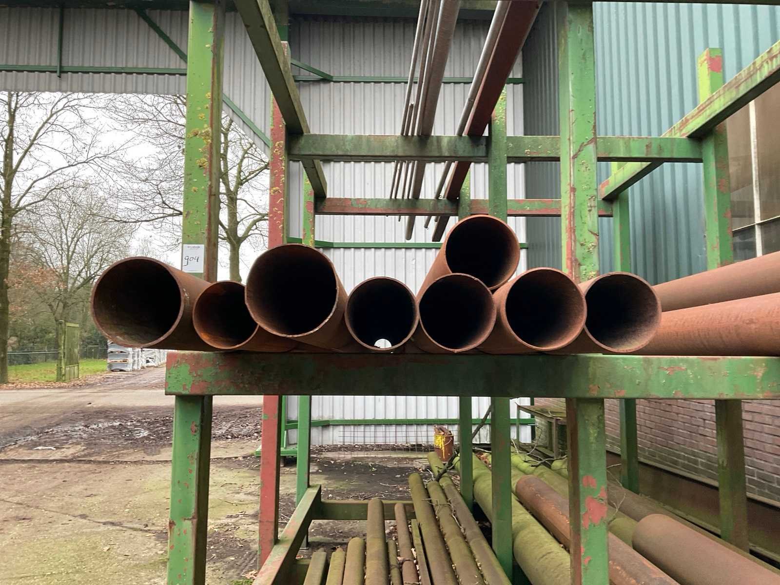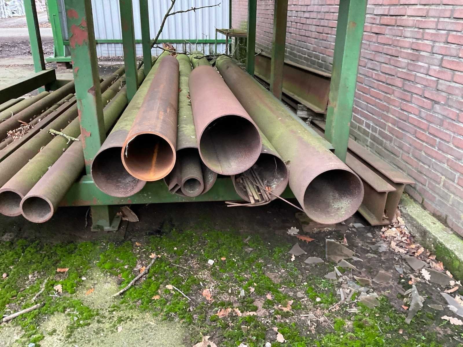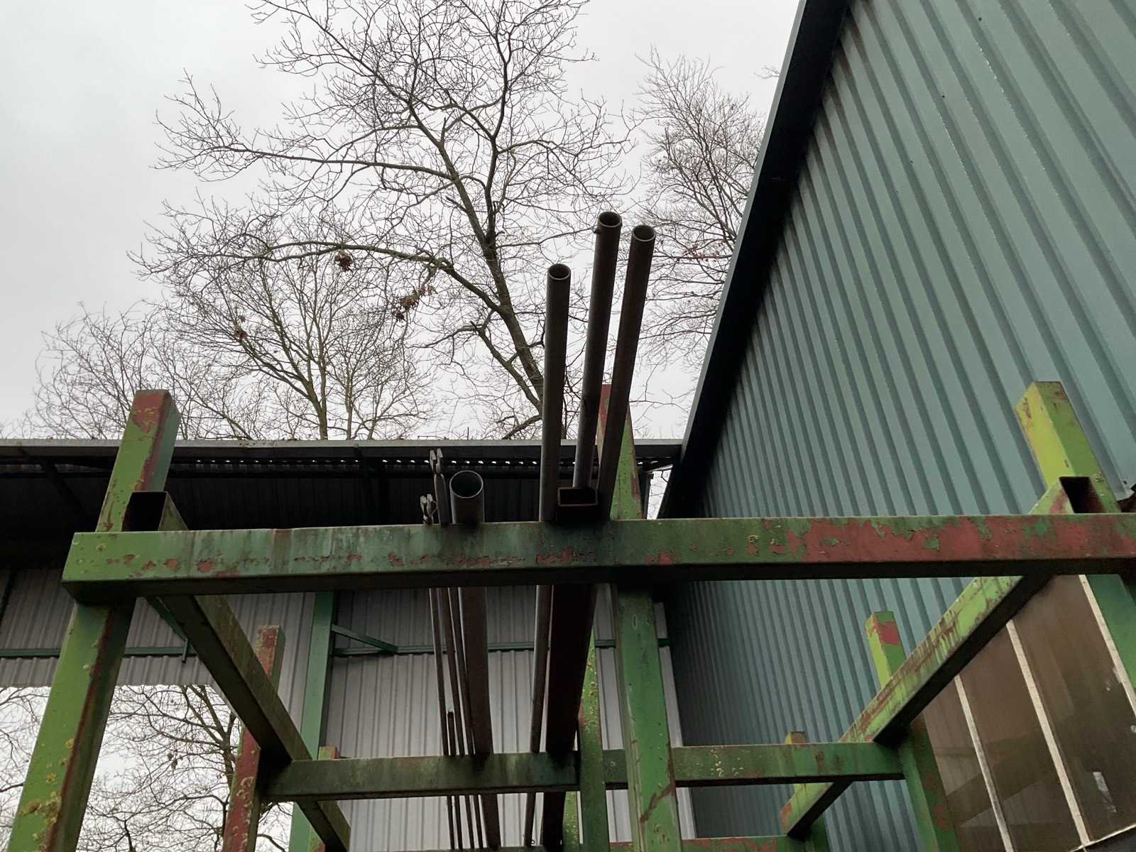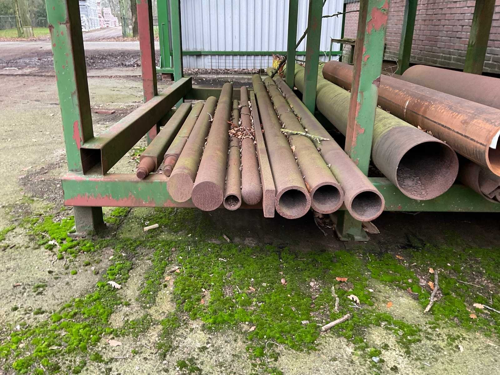 Betreft inhoud stafmateriaalstelling, waaronder buizen ø van 115mm tot circa 260mm, lengte tot circa 6500mm, rondstaal, etc. Inclusief gelaste stafmateriaalstelling afmeting lxbxh 380x300x370cm
