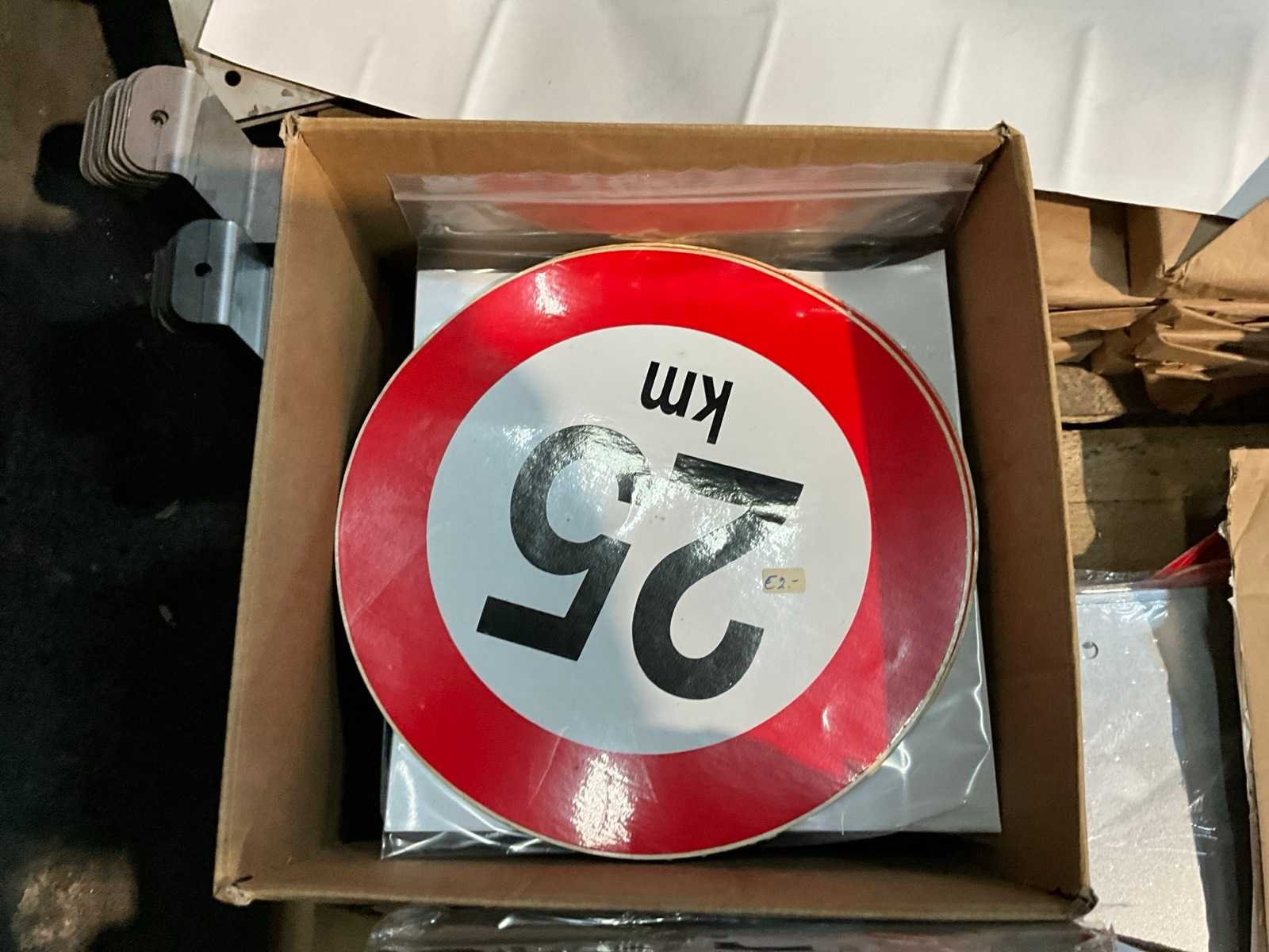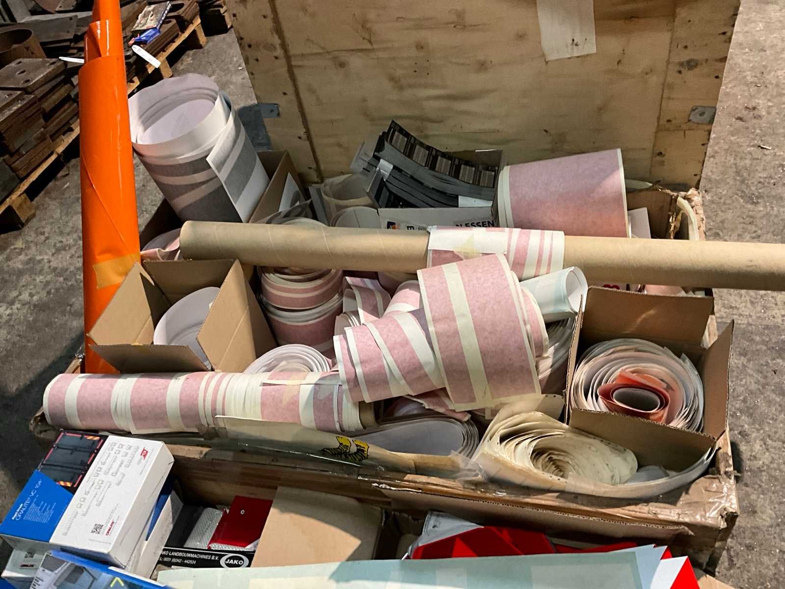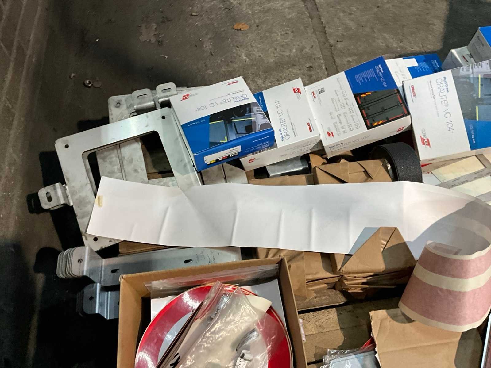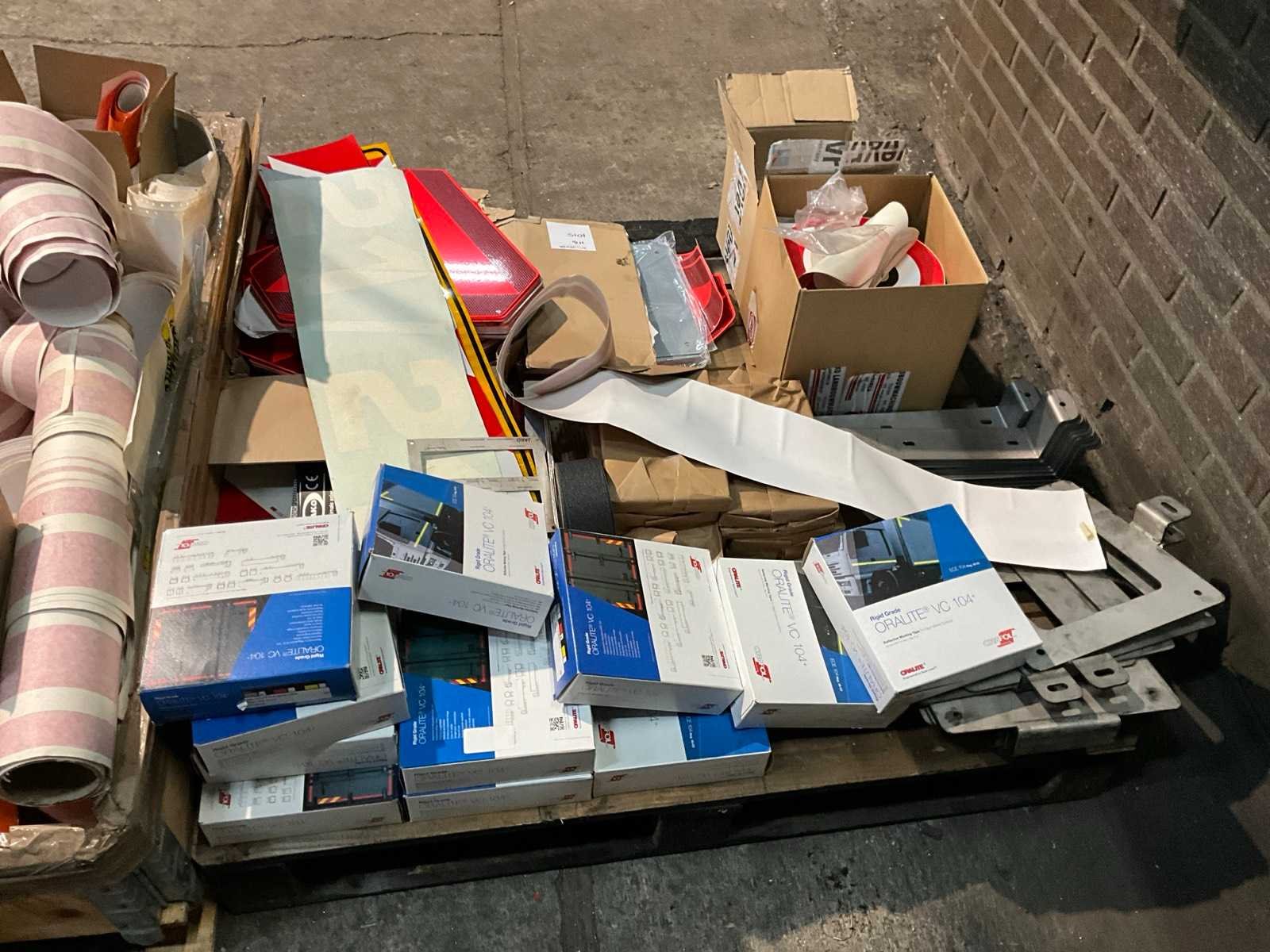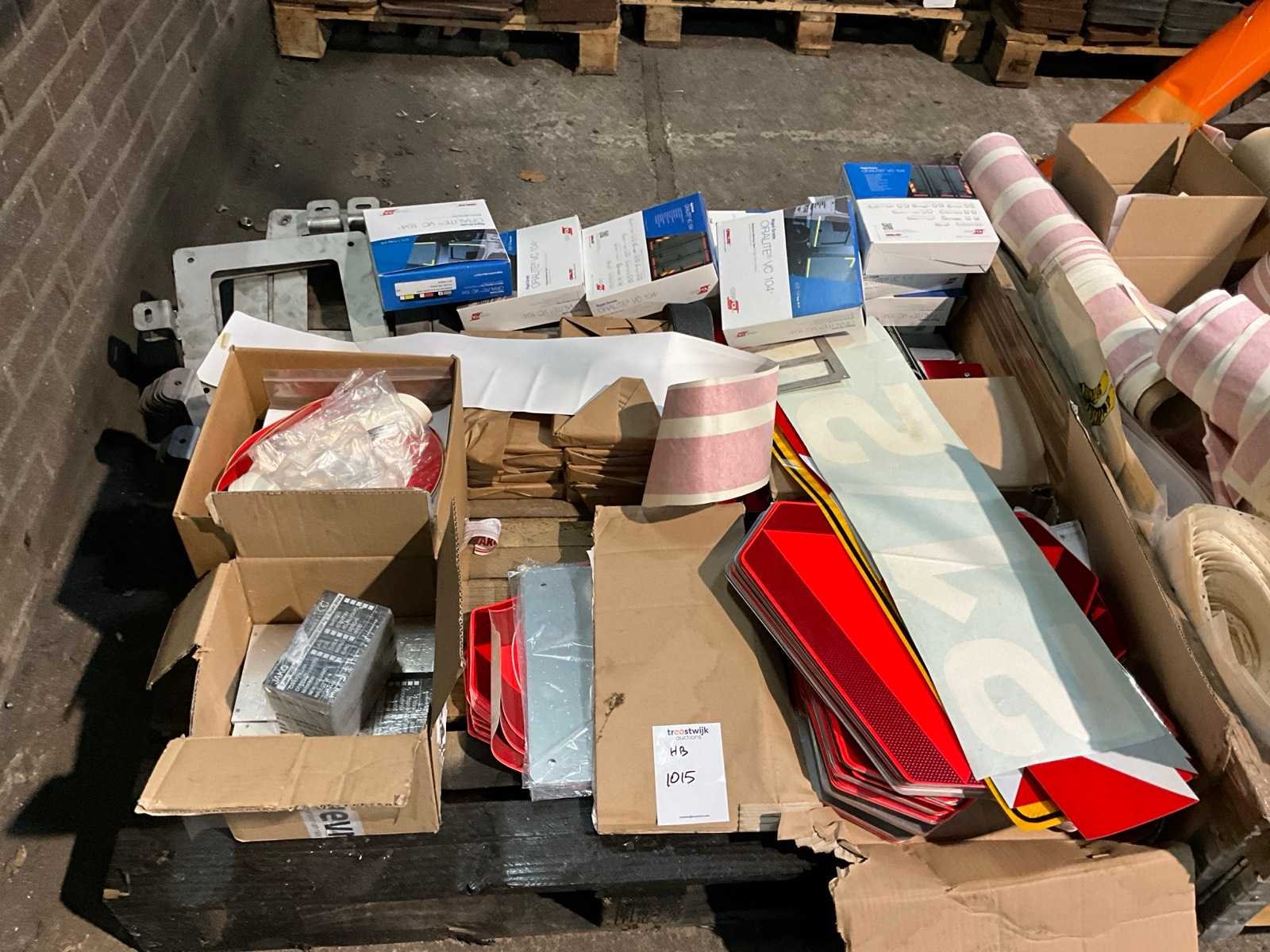 Onder andere diverse types bestickering (Jako + bijbehorende types), stalen type plaatjes, reflectie tape, machine driehoek, divers op en met 2 pallets Merk: Jako