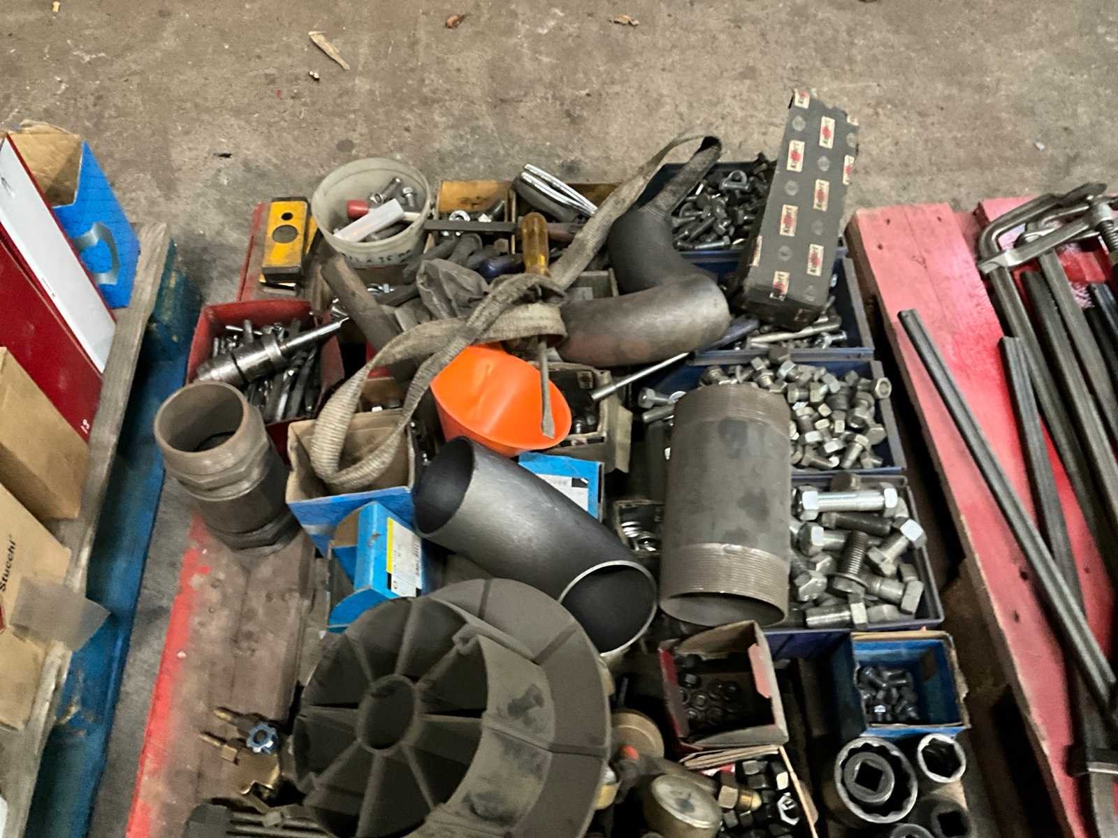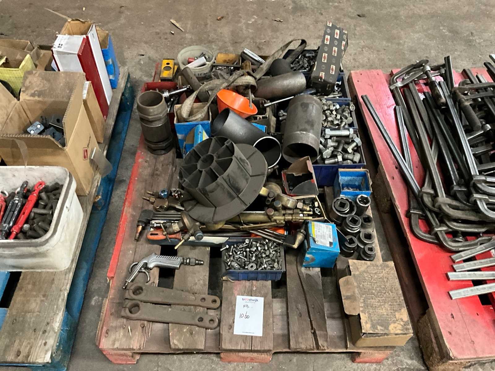 Op en met 2 pallets, onder andere diverse bouten, diverse moeren (onder andere zelf borgend), span ogen, gereedschappen etc