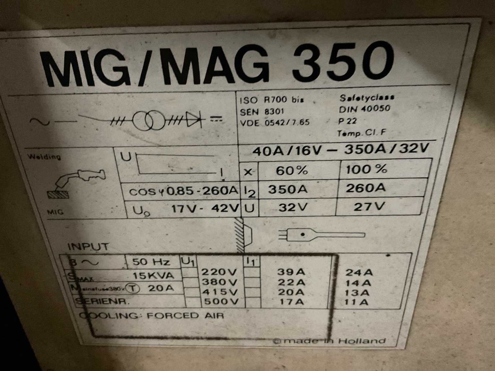 Merk: Van Laar Type: MIG/MAG 350 Inschakelduur: 60% Max. lasvermogen: 350A Aansluiting: 400V Afmeting l: 1000mm Afmeting b: 450mm Afmeting h: 1050mm