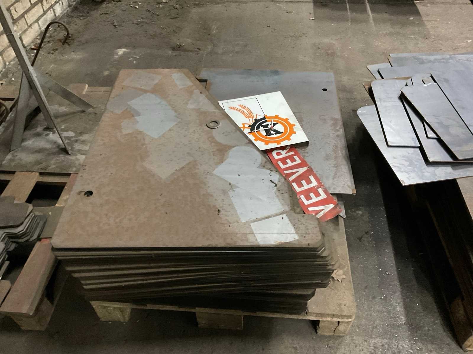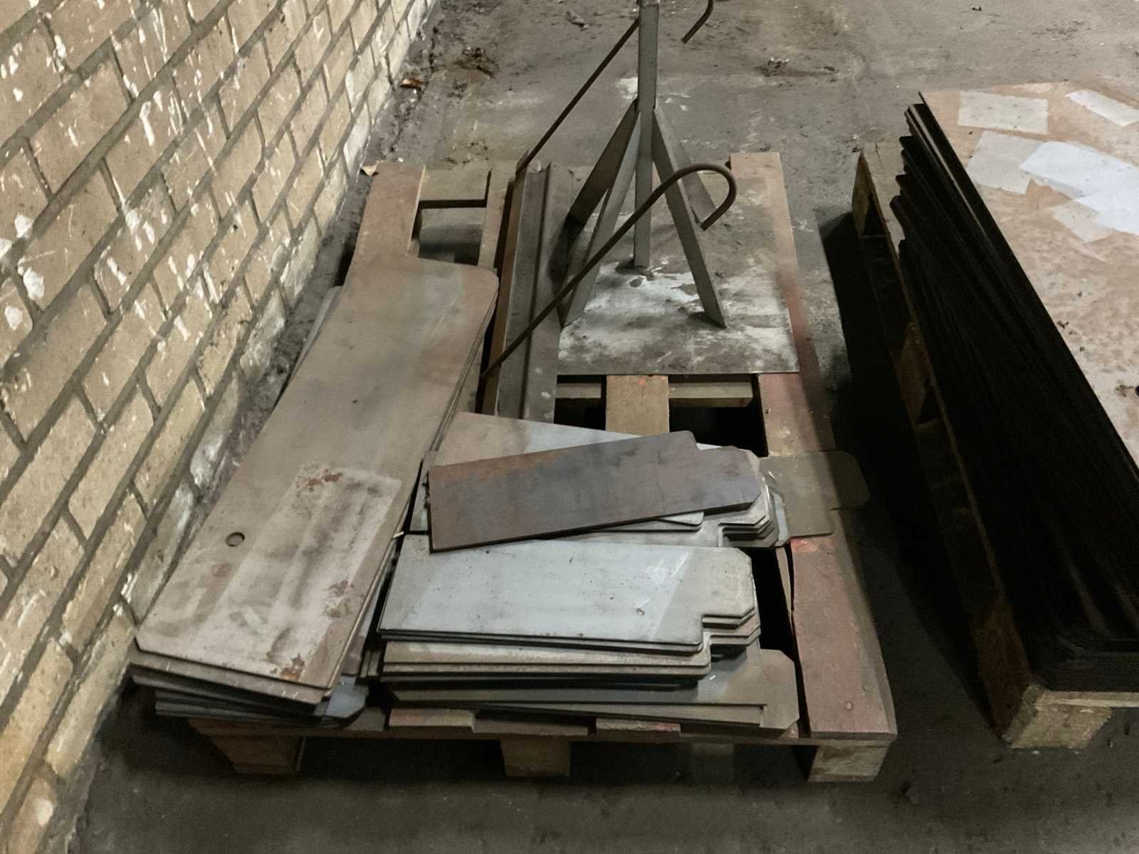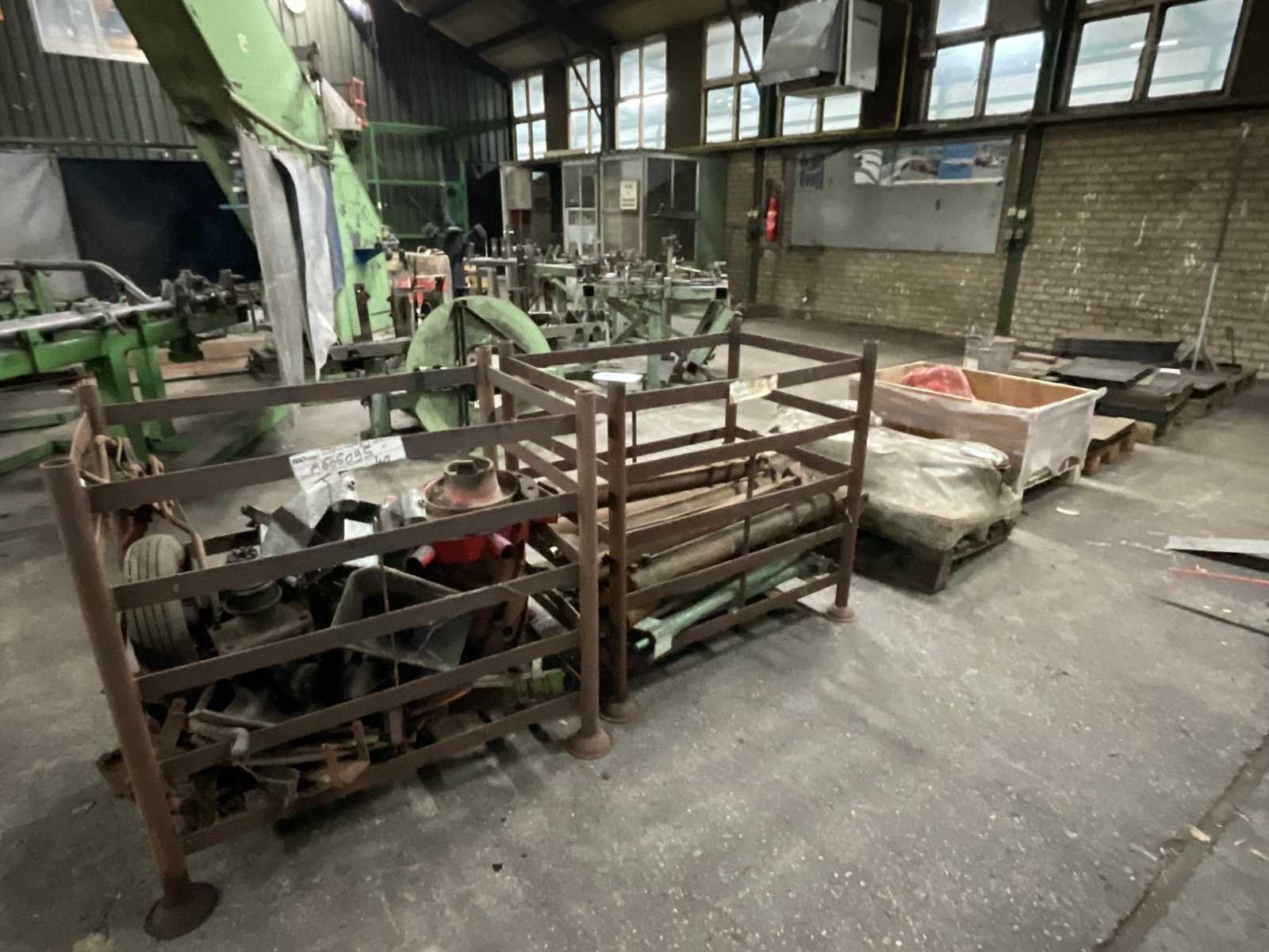 Bestaande uit: 4 pallets gesneden plaatwerk, 1 pallet buizen ø 80 mm buitenkant , 1 pallet schijven ø 46 cm, box met cilinders lengte 100 cm, box overige machinedelen.