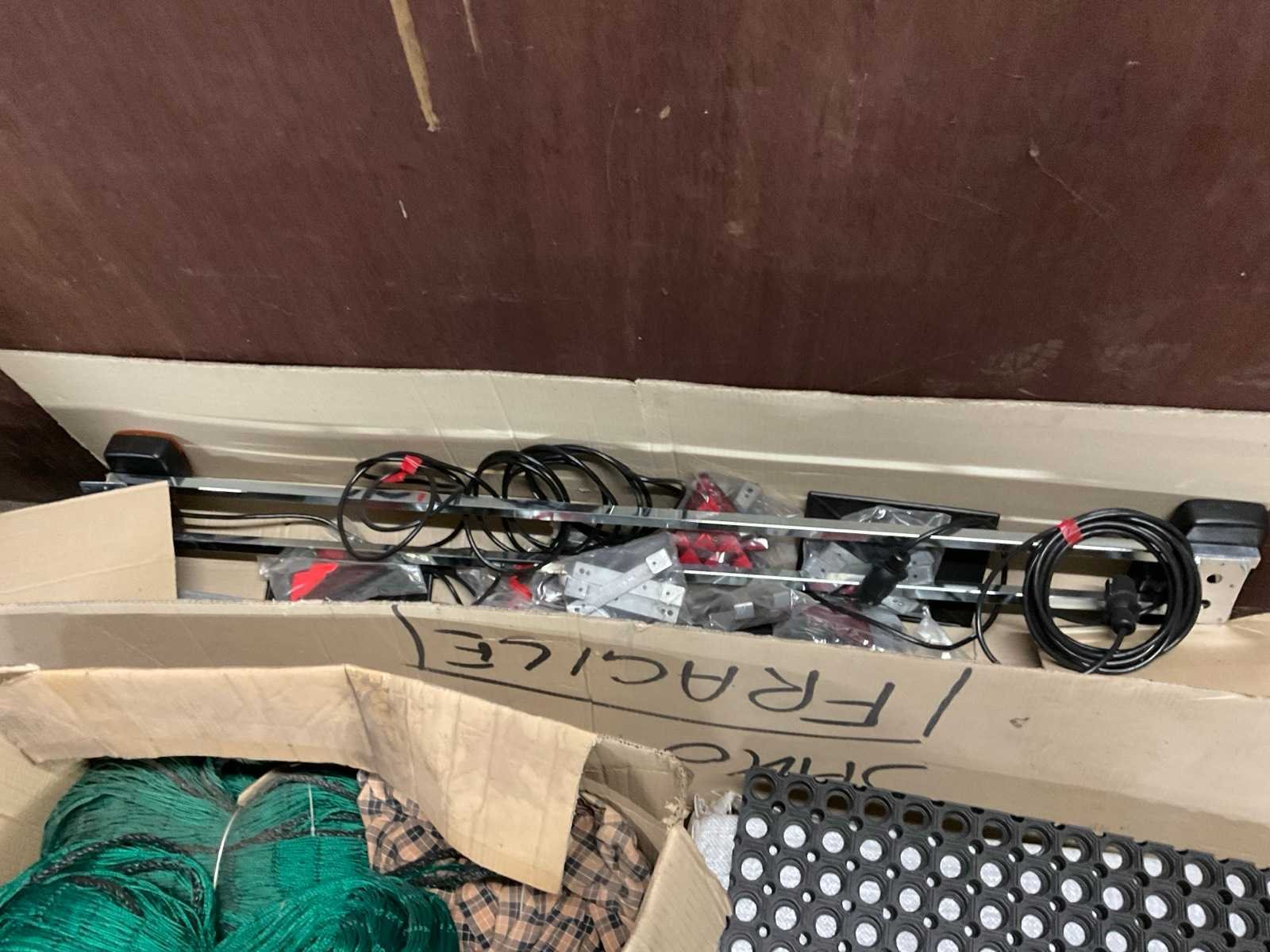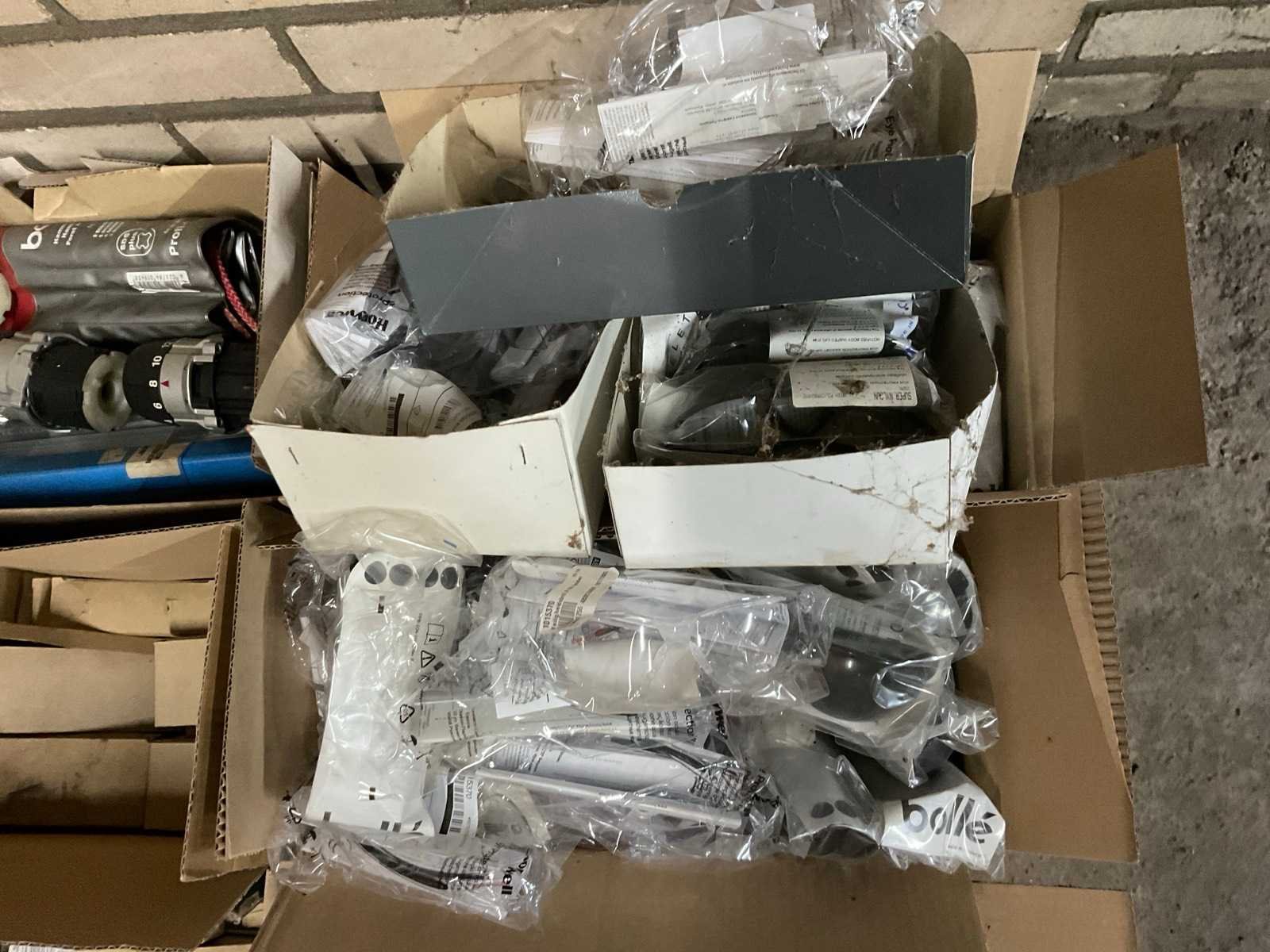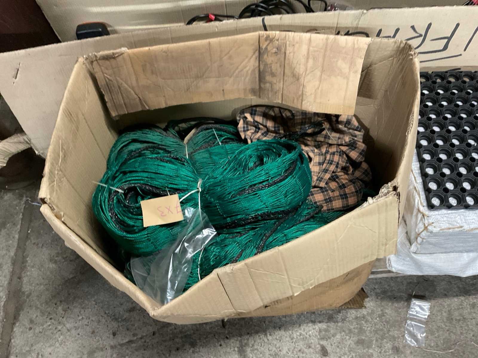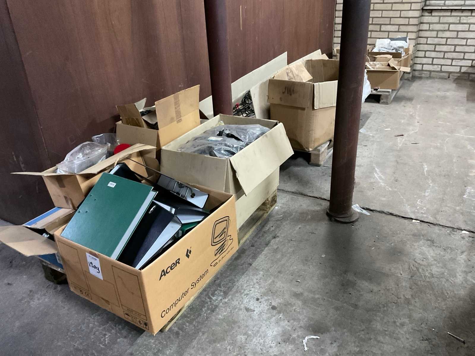 Op 3 pallets. Bestaande uit: Onder andere: 1e: Gereedschap 2e: Safety glas 3e: Kantoorartikelen 4e: Partij matten 5e: Afdek net 6e: 5 aanhanger verlichting 7e: Dopjes 8e: Mappen