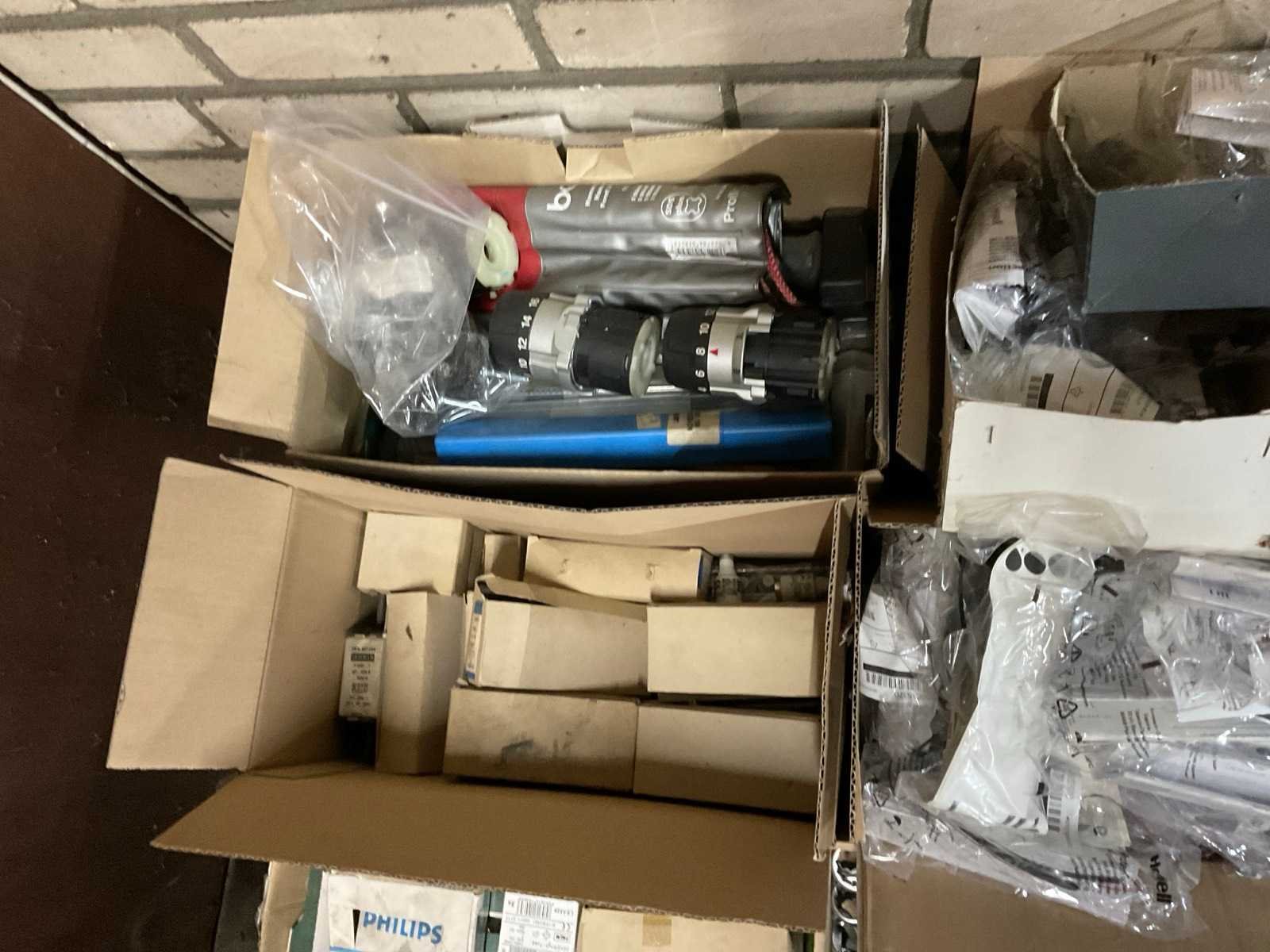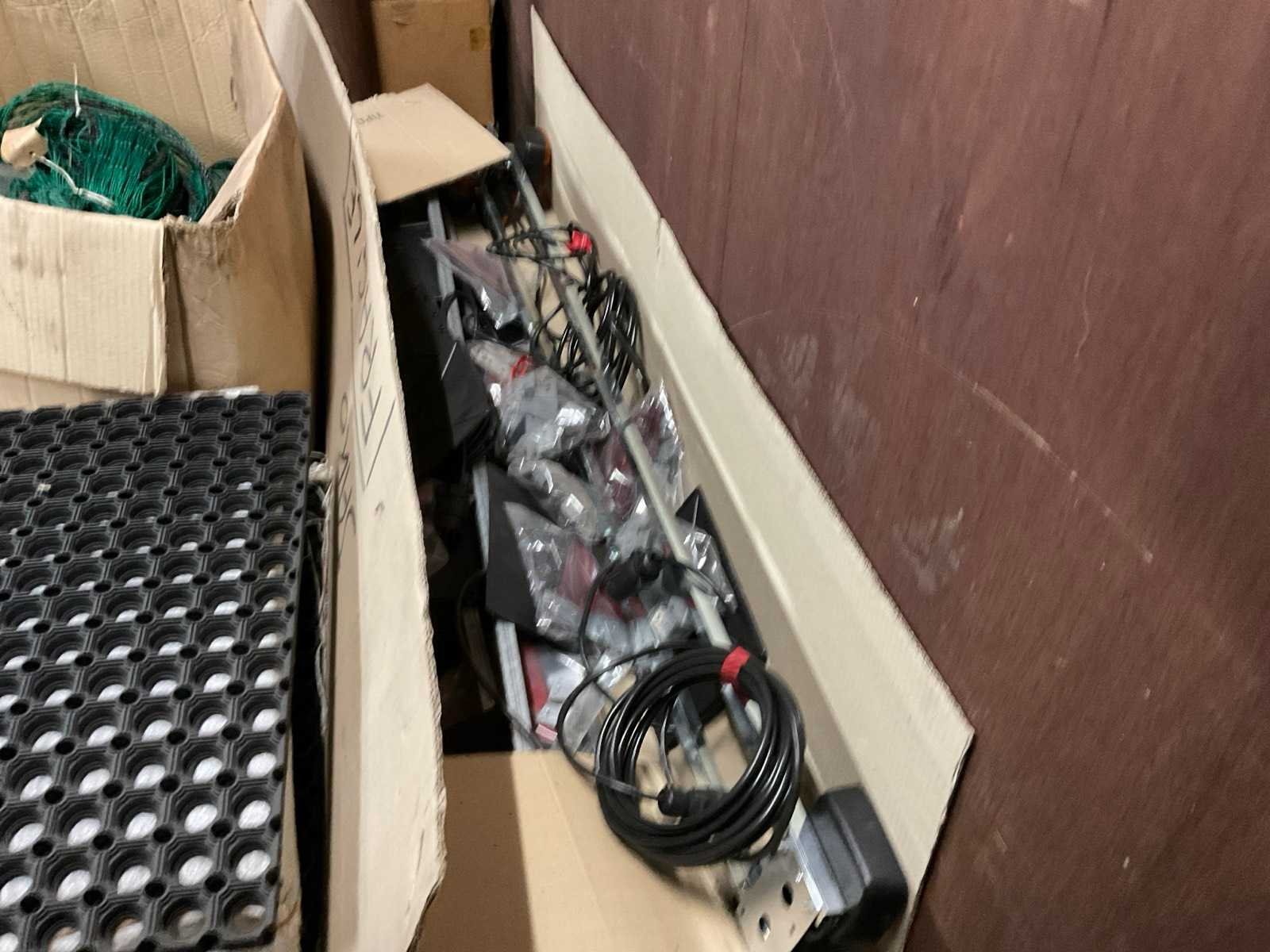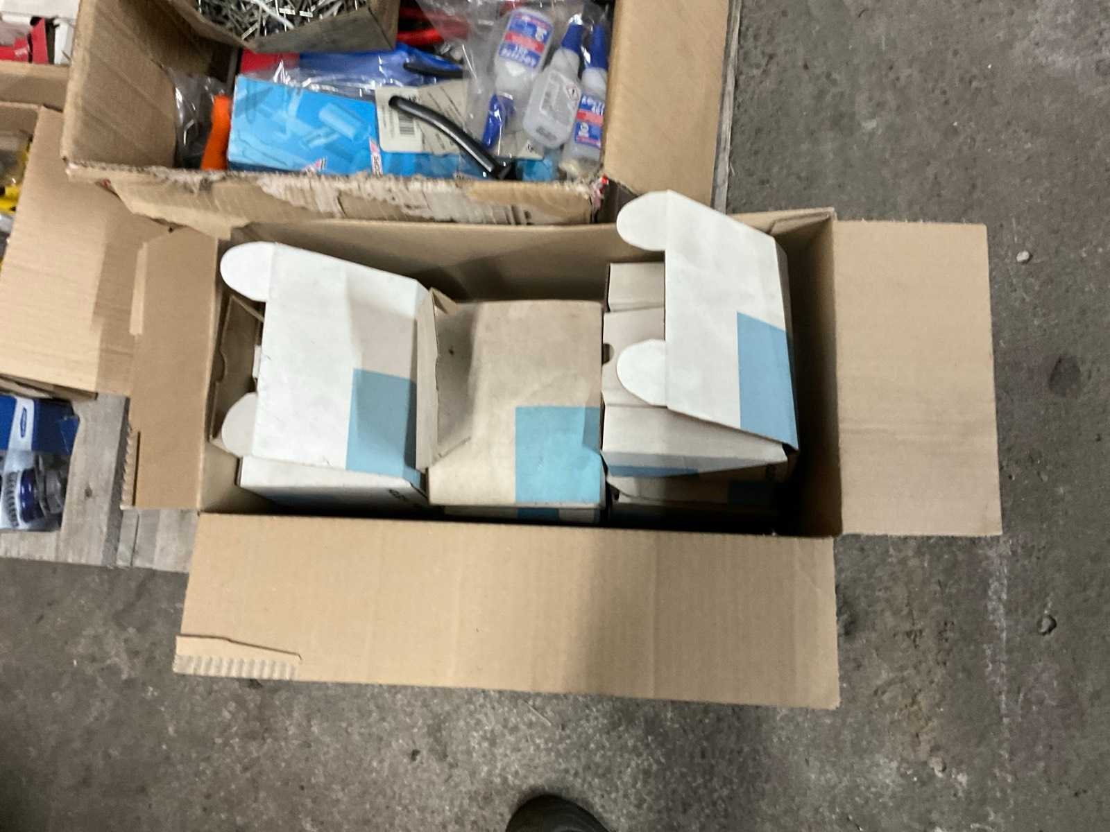Op 3 pallets. Bestaande uit: Onder andere: 1e: Gereedschap 2e: Safety glas 3e: Kantoorartikelen 4e: Partij matten 5e: Afdek net 6e: 5 aanhanger verlichting 7e: Dopjes 8e: Mappen