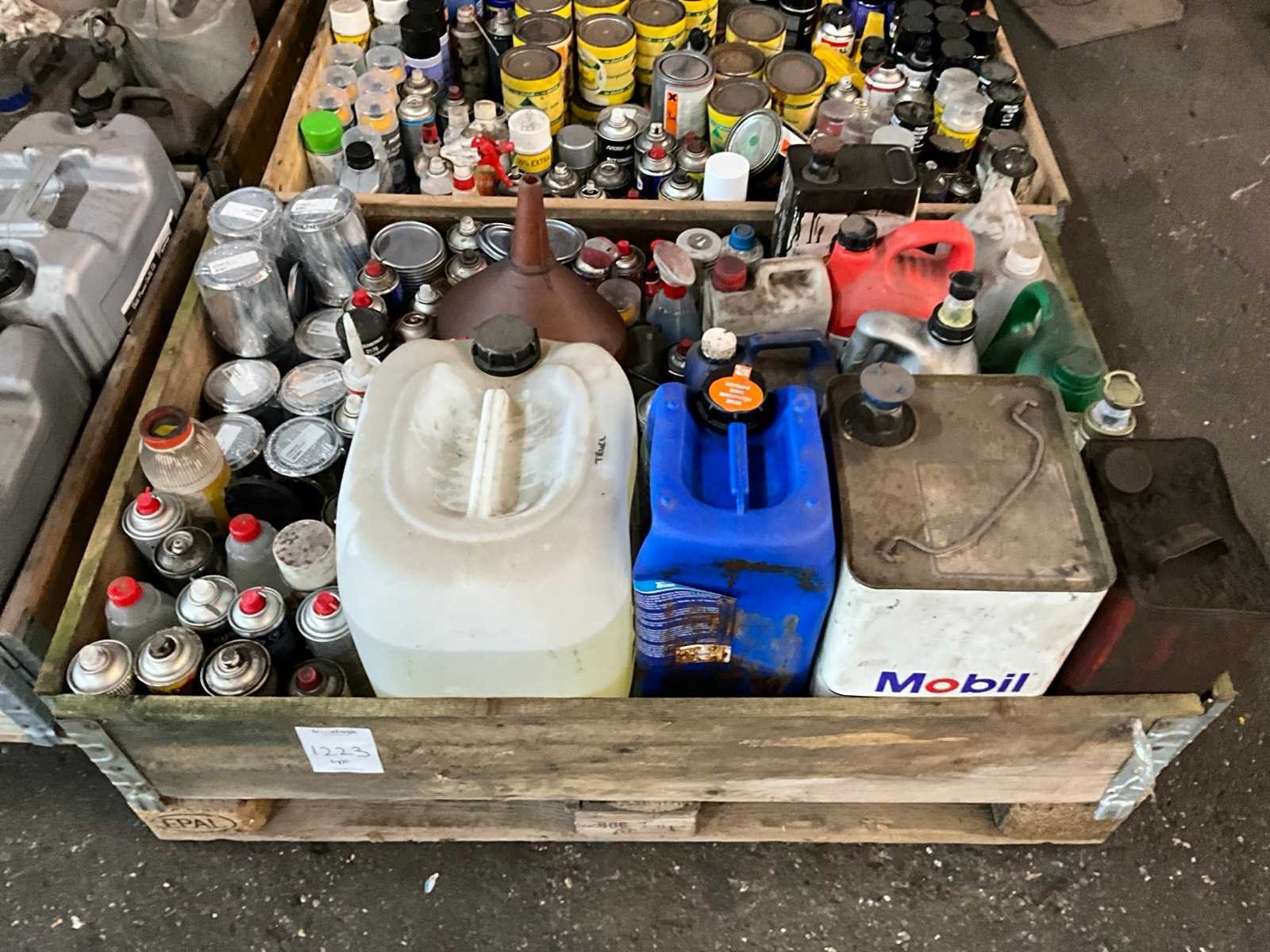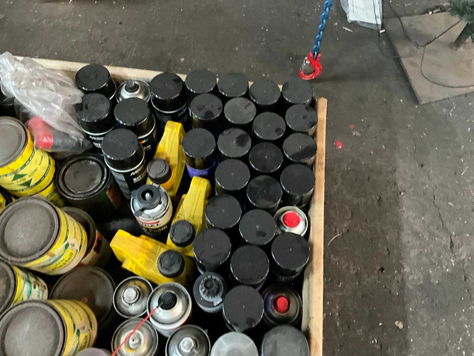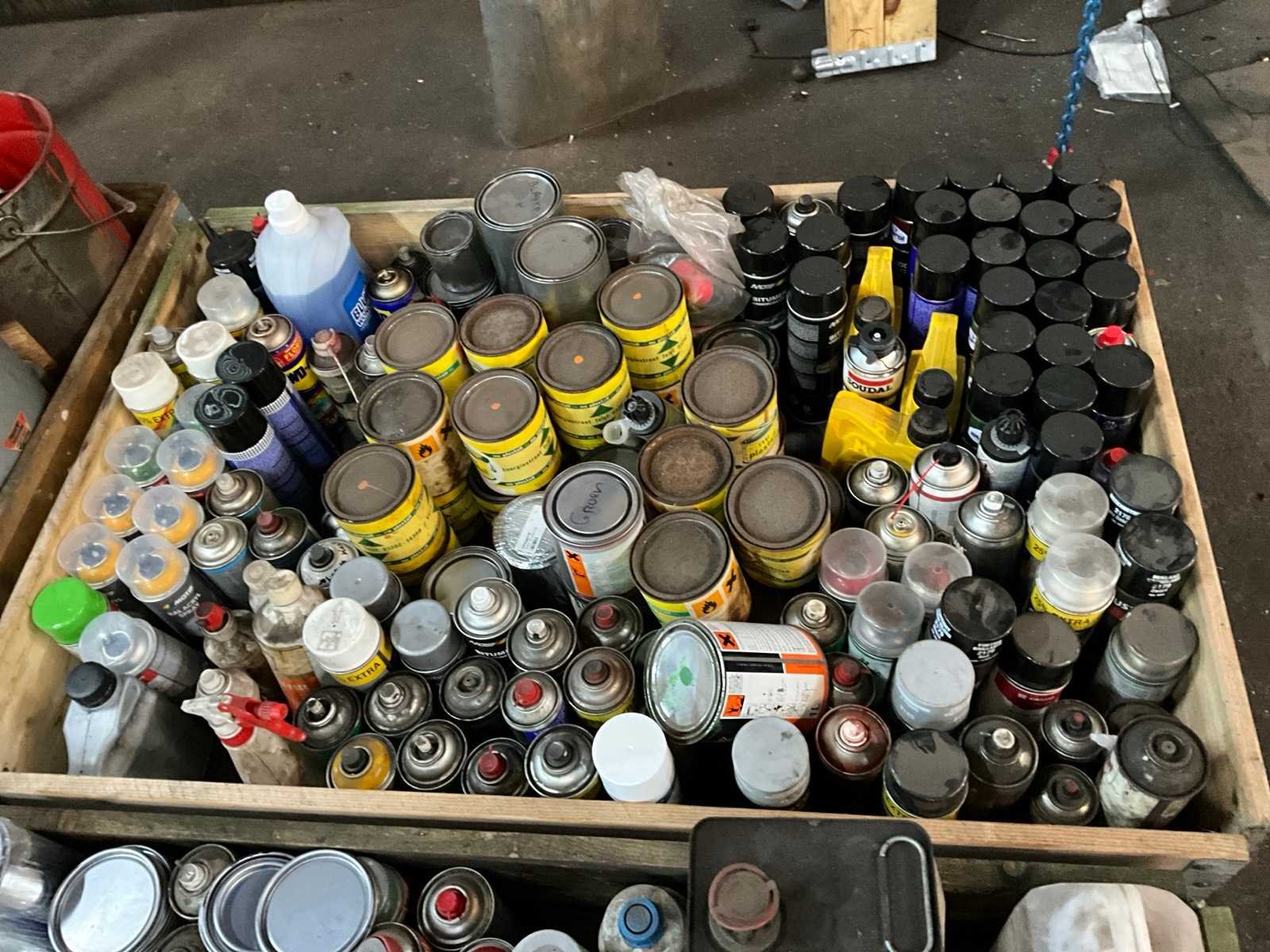 Onder andere silicone spray, spuitbussen verf, olie, lege blikken, smeervet, alles in en met 4x palletkist