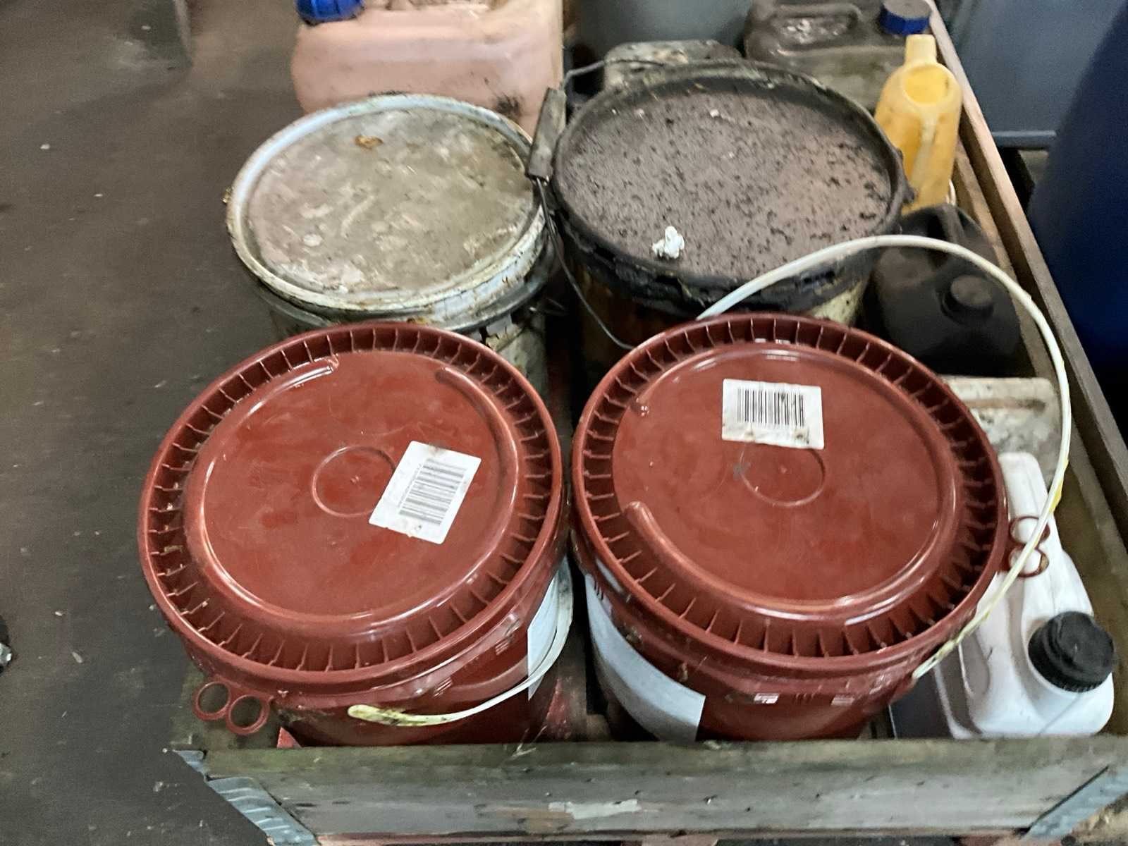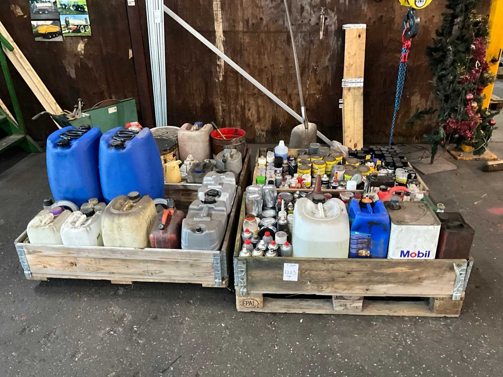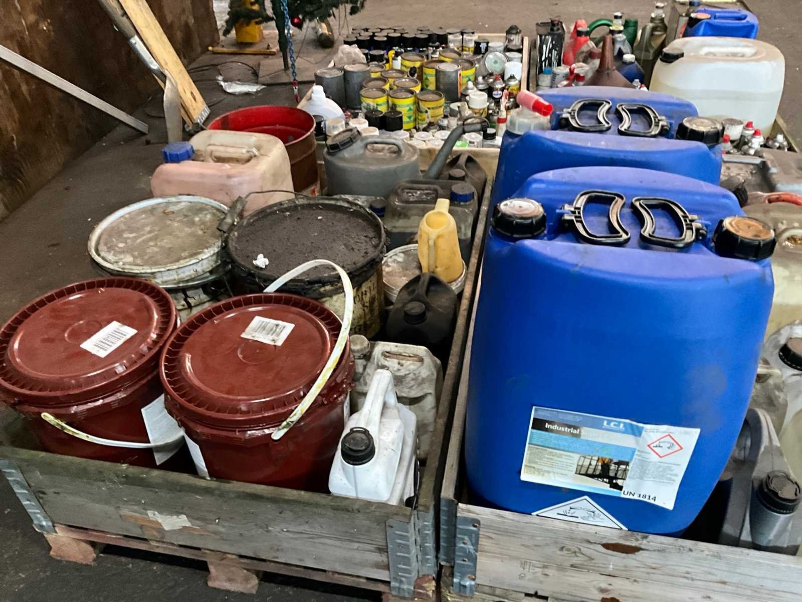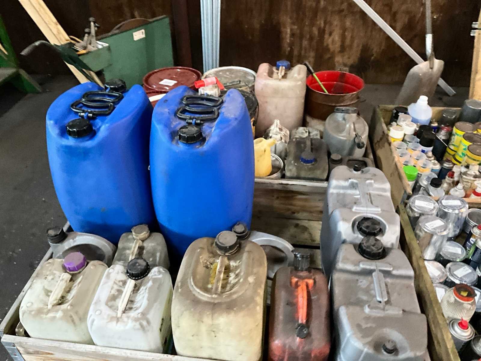 Onder andere silicone spray, spuitbussen verf, olie, lege blikken, smeervet, alles in en met 4x palletkist