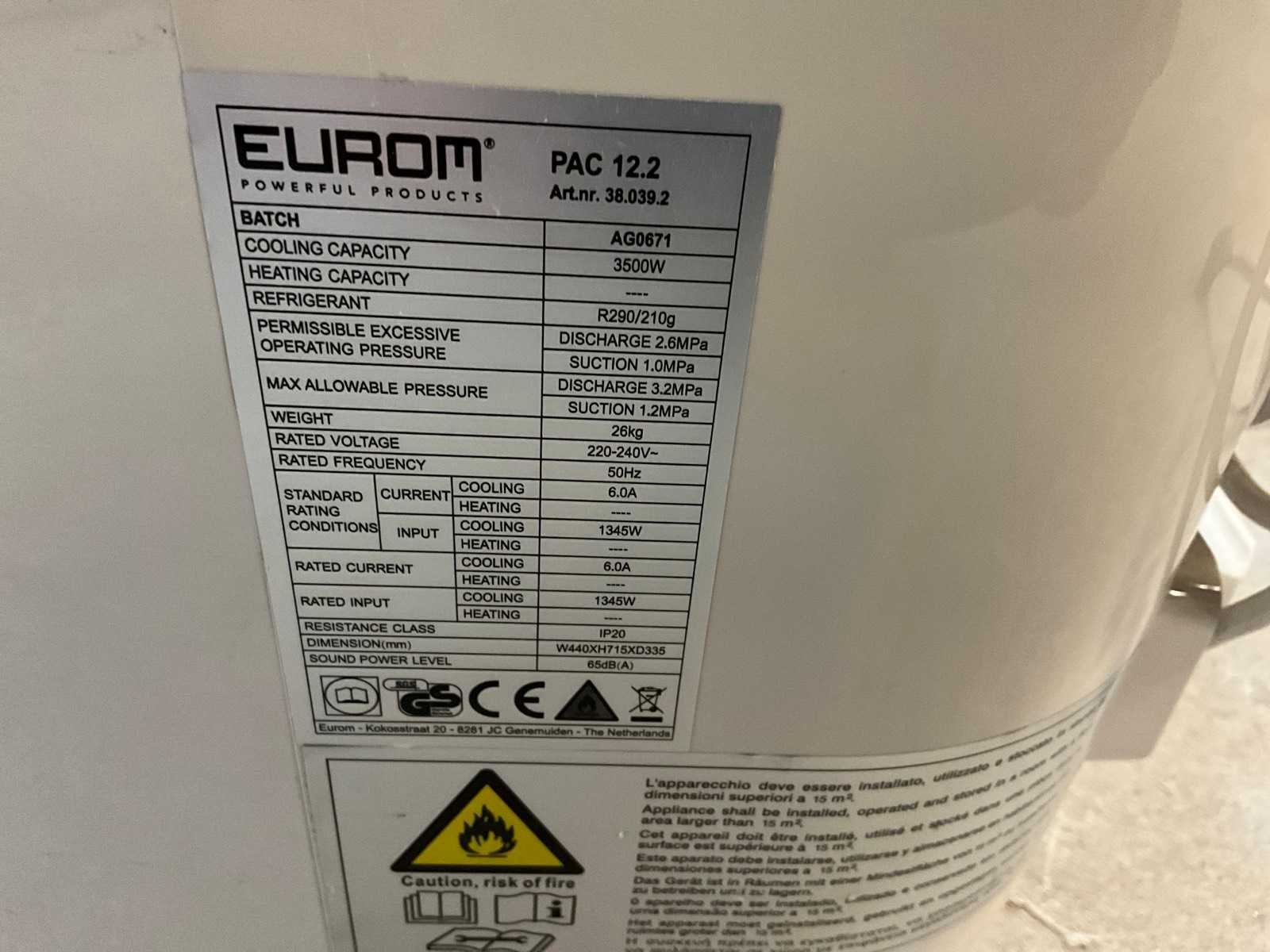 Merk: Eurom Model: Pac 12.2 Koelcapaciteit (W): 1345W Spanning: 230V Gewicht: 26kg