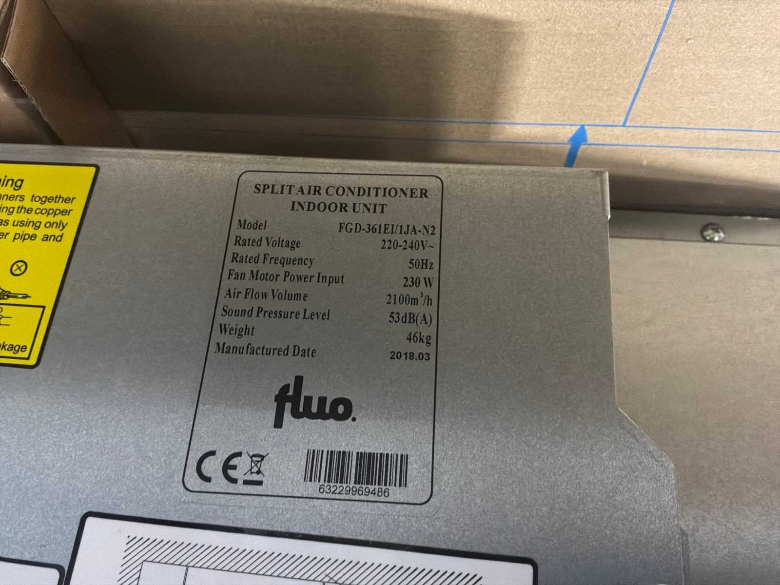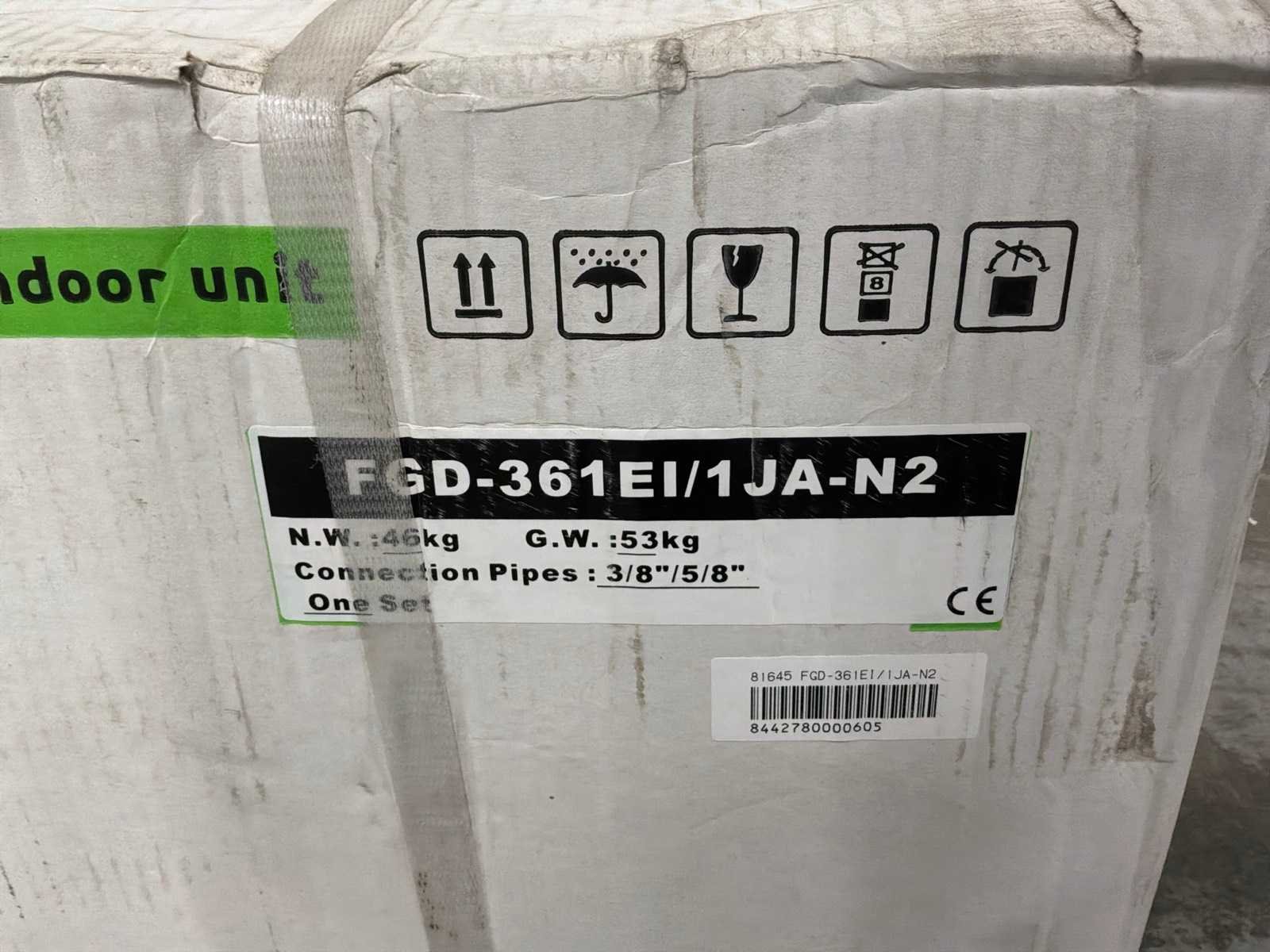 Kanaal 1 op 1 binnendeel Merk: Fluo Type: IDU FGD-361EI/1JA-N2 R410A Eigen gewicht: 53kg Totale afmeting L: 730mm Totale afmeting Breedte: 1200mm Totale afmeting Hoogte: 300mm