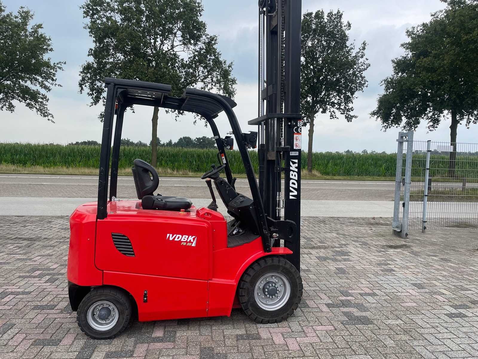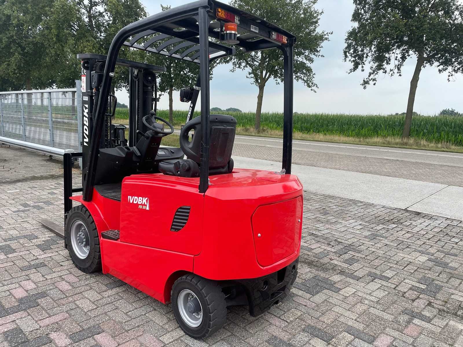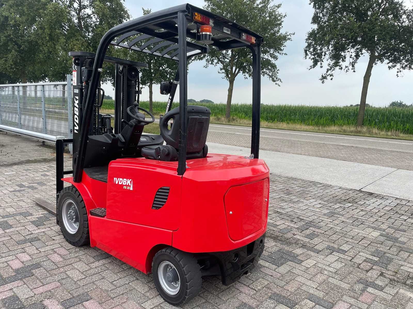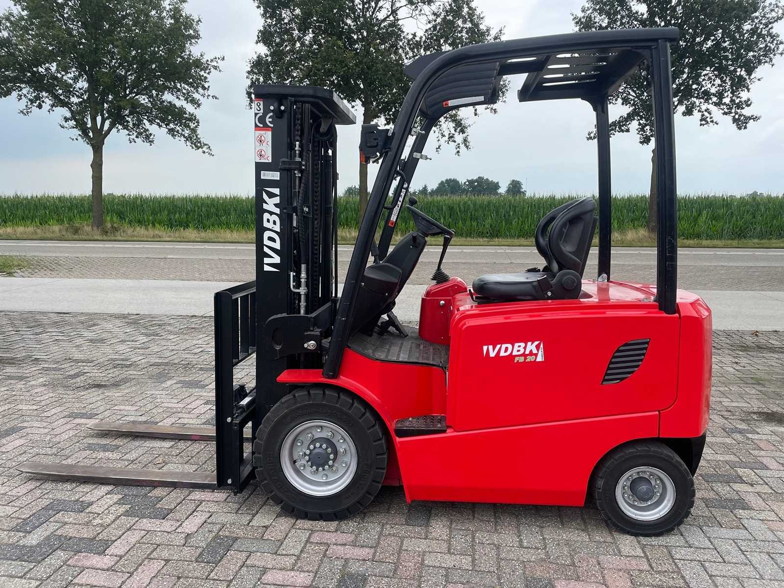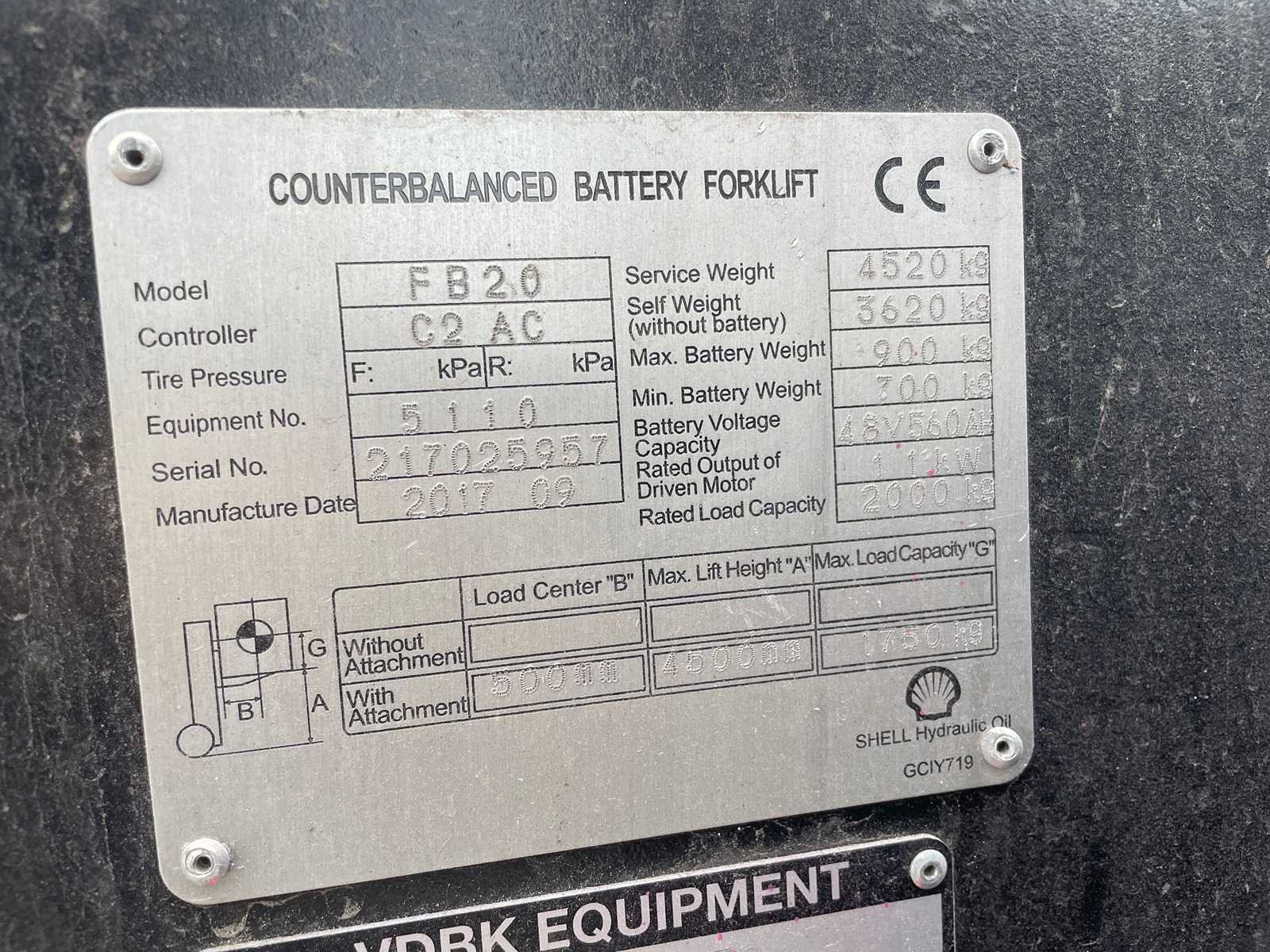 Merk: VDBK Type: FB20-C2AC Bouwjaar: 2017 Serienummer: 217025957 Brandstof: Elektrisch Aantal wielen: 4 Afgelezen urenstand: 2715 Eigen gewicht: 4520kg Hefvermogen: 1750kg Max. hefhoogte: 4500mm