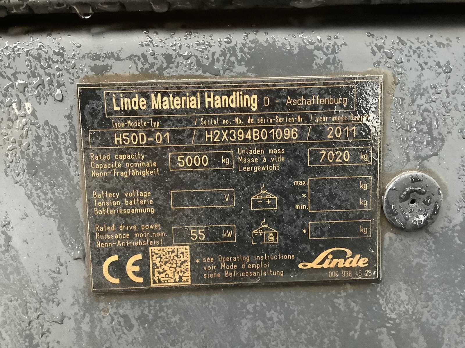 55 KW vermogen Merk: LINDE Type: H50D-01 Bouwjaar: 2011 Brandstof: Diesel Aantal wielen: 4 Afgelezen urenstand: 15177.3 Hydraulisch verstelbare lepels: true Triple mast: true Eigen gewicht: 7020kg Hefvermogen: 5000kg Lepellengte: 1400mm Hefhoogte: 4100mm Vol rubber banden: true Minimale doorrijhoogte: 3250mm Diesel: true