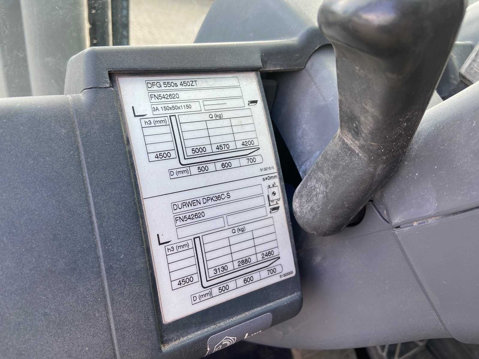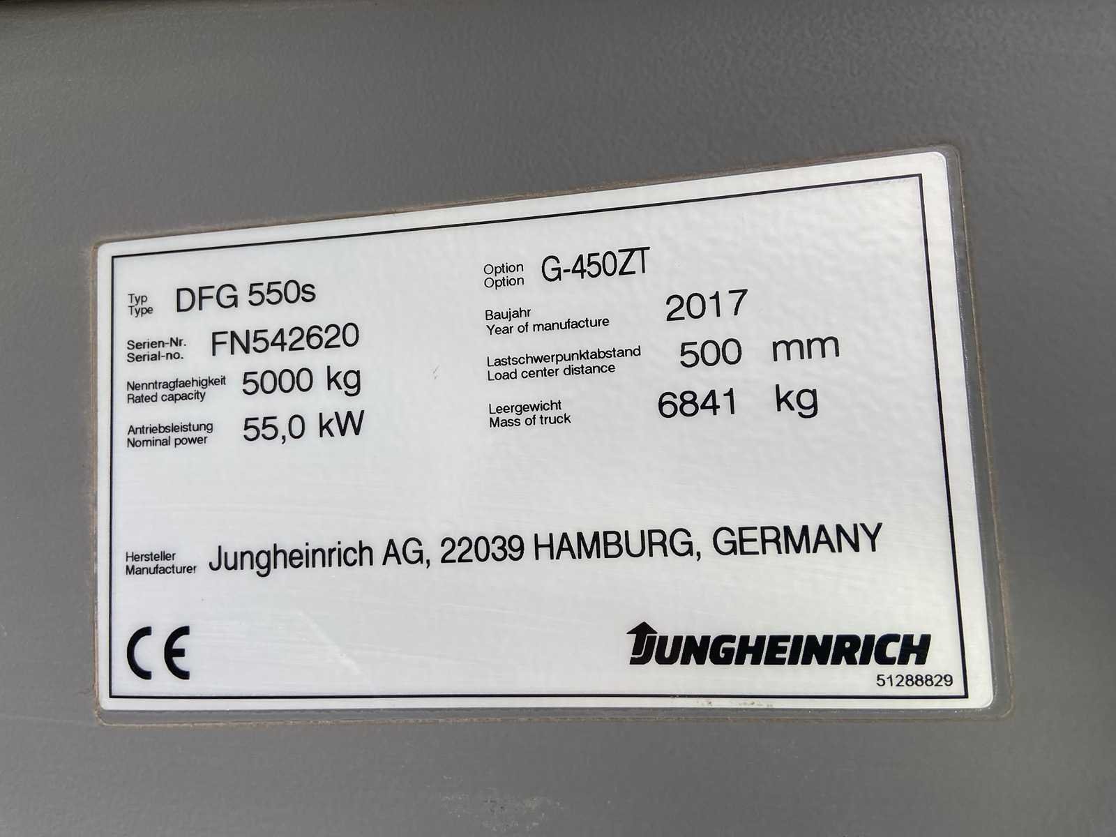 Merk: Jungheinrich Type: DFG550s Bouwjaar: 2017 Serienummer: FN542620 Brandstof: Diesel Aantal wielen: 4 Afgelezen urenstand: 12723 Triple mast: true Eigen gewicht: 7400kg Hefvermogen: 5000kg Max. hefhoogte: 4500mm Vol rubber banden: true Minimale doorrijhoogte: 2550mm Totale afmeting Breedte: 1450mm Diesel: true