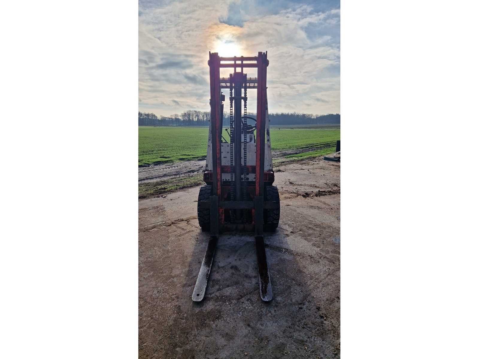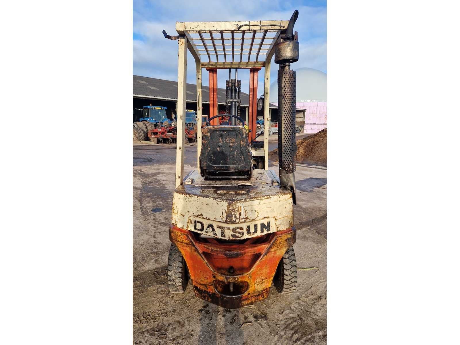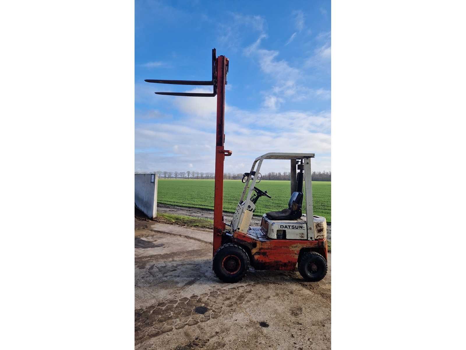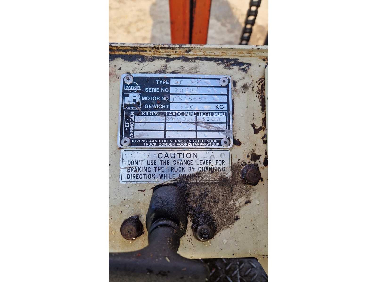Merk: Datsun Type: QF 10 Aantal wielen: 4 Afgelezen urenstand: 16123 Duplex mast: true Eigen gewicht: 2340kg Hefvermogen: 1000kg Hefhoogte: 3300mm Luchtbanden: true Diesel: true