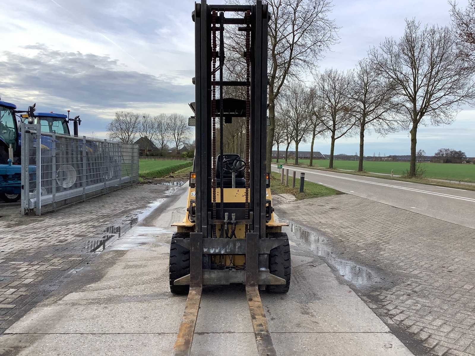 Merk: Hyster Type: H4.00XL5 Bouwjaar: 1987 Aantal wielen: 4 Afgelezen urenstand: 2529.8 Triple mast: true Eigen gewicht: 5560kg Hefvermogen: 4030kg Hefhoogte: 3700mm Vol rubber banden: true Diesel: true