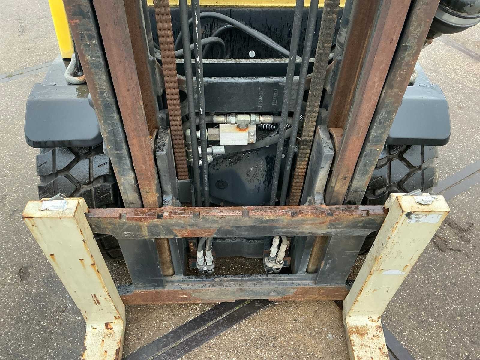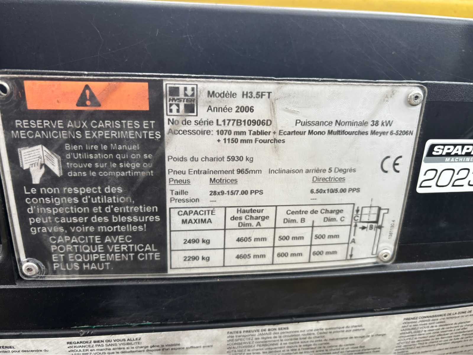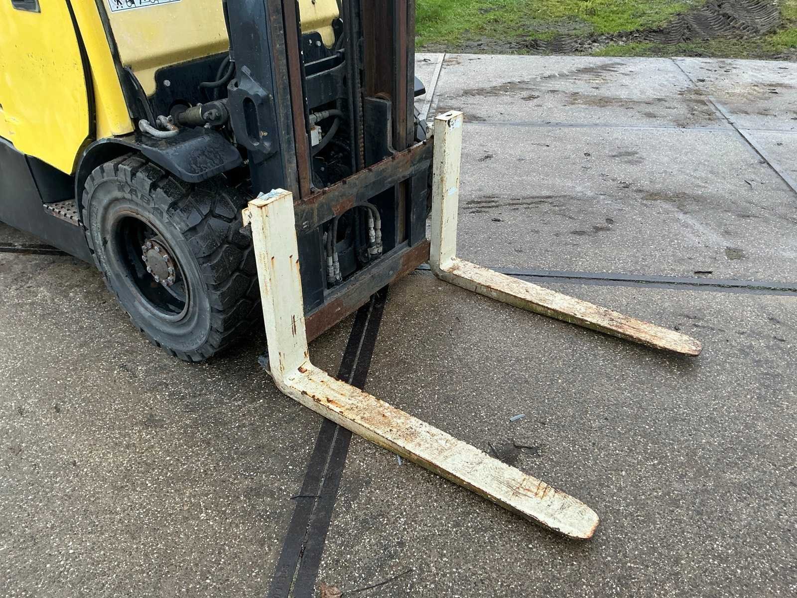 Merk: Hyster Type: Fortens H3.5FT Bouwjaar: 2006 Serienummer: L117B10906D Brandstof: LPG Mast: Duplex Soort band: Volrubber banden Aantal wielen: 4 Afgelezen urenstand: 13126 Duplex mast: true Eigen gewicht: 5930kg Hefvermogen: 2490kg Lepellengte: 1000mm Vol rubber banden: true Totale afmeting L: 3750mm Totale afmeting Breedte: 1300mm Totale afmeting Hoogte: 3100mm LPG: true